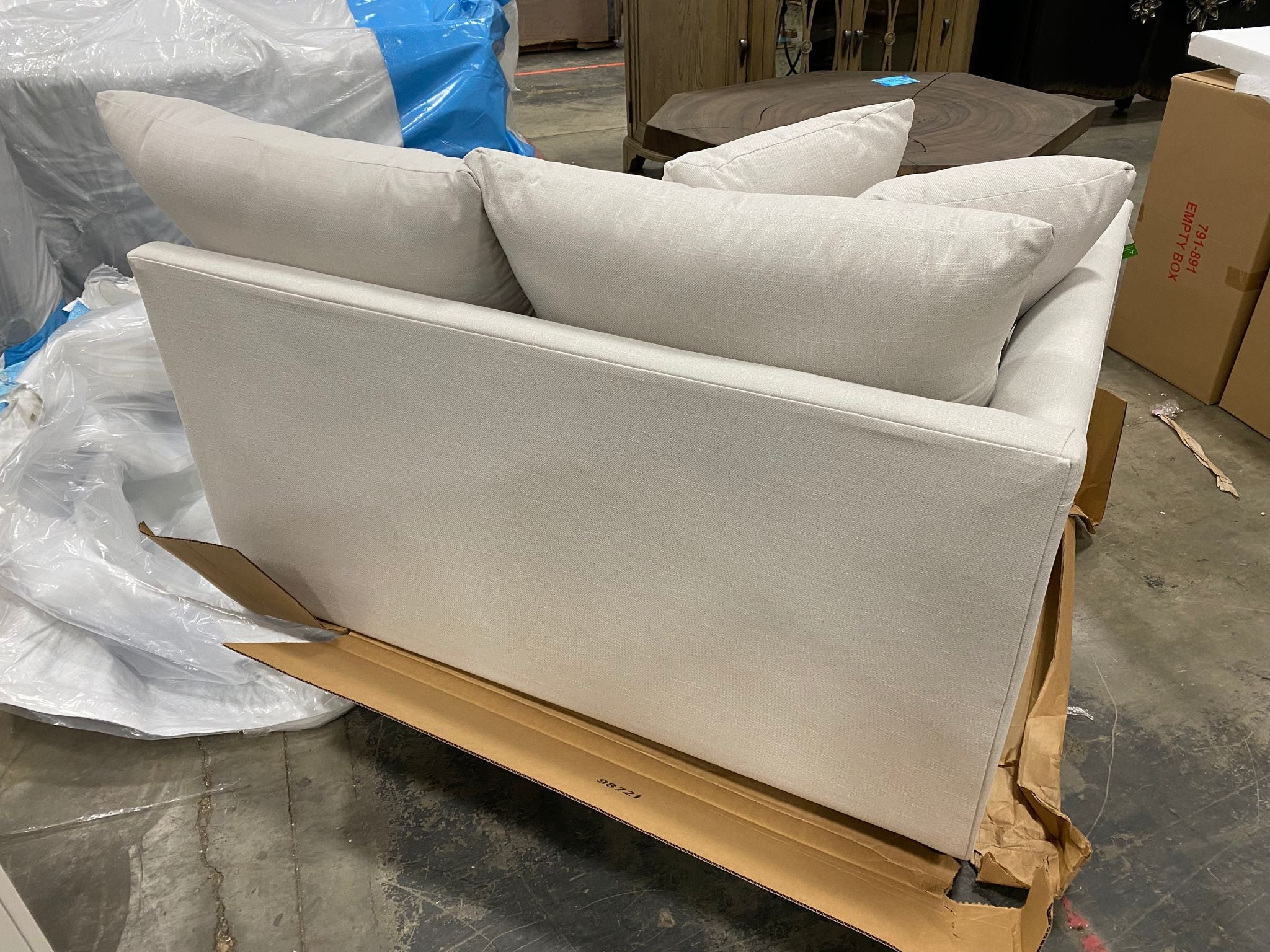 In plastic, The color is conversation pearl, AS IS condition: 2 seat Loveseat ONLY; Sofa piece NOT included. Item in good condition.