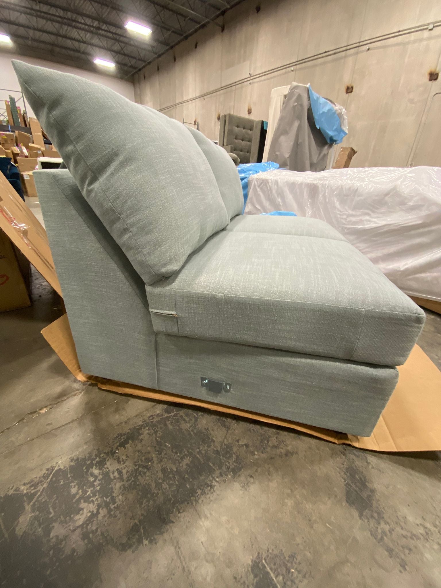 In plastic , The color is conversation capri, AS IS condition: Armless loveseat ONLY; Sofa and chaise NOT included. Item in good condition.