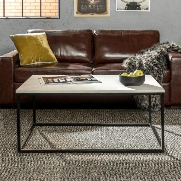 open box item- In box rectangular coffee table in white faux marble with black metal base. Assembly required.
