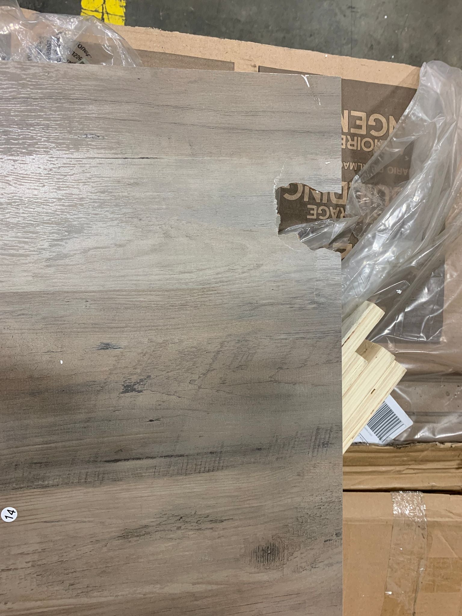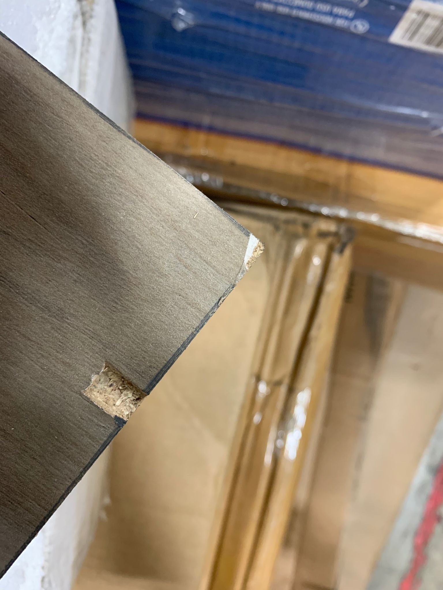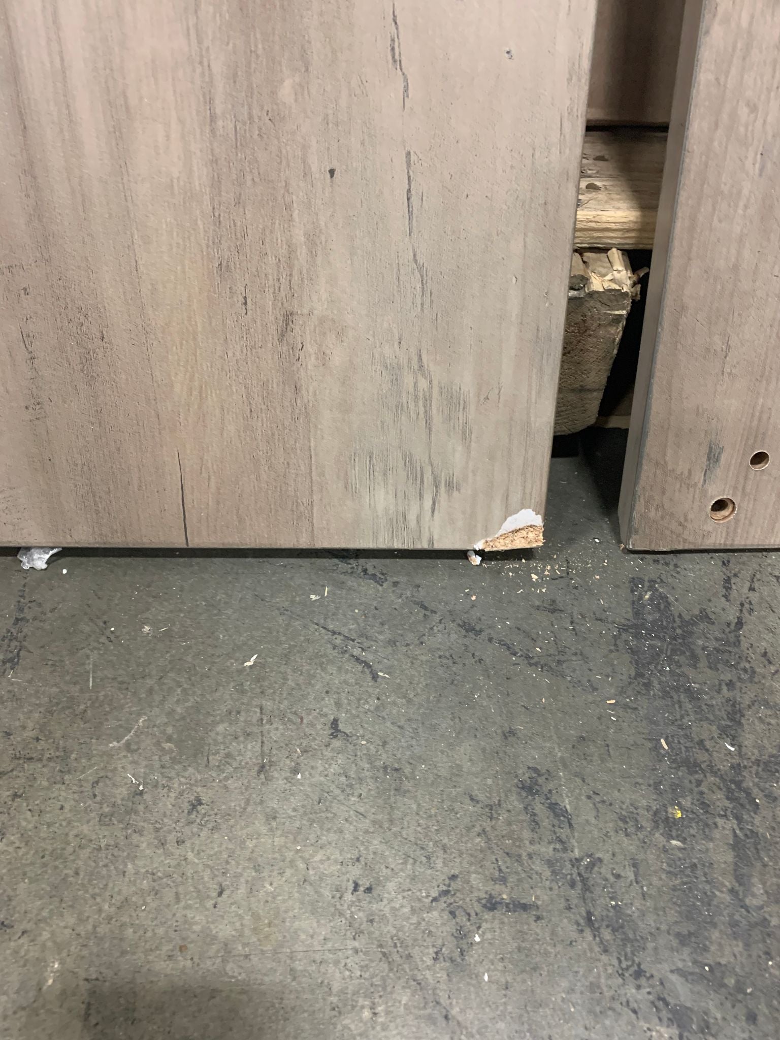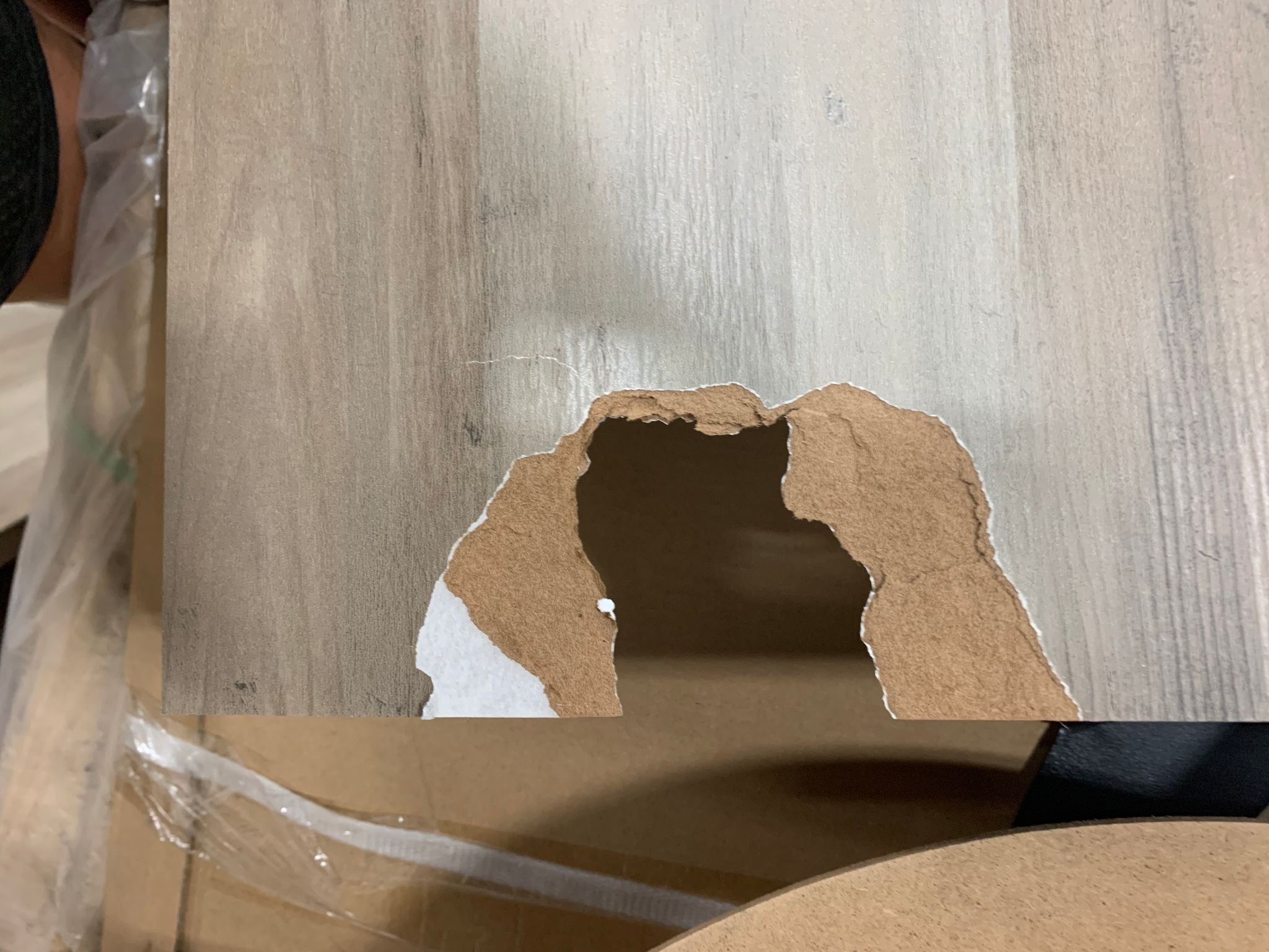 Open box, item is missing all the hardware and has chips and scuffs in several areas of the backing boards.