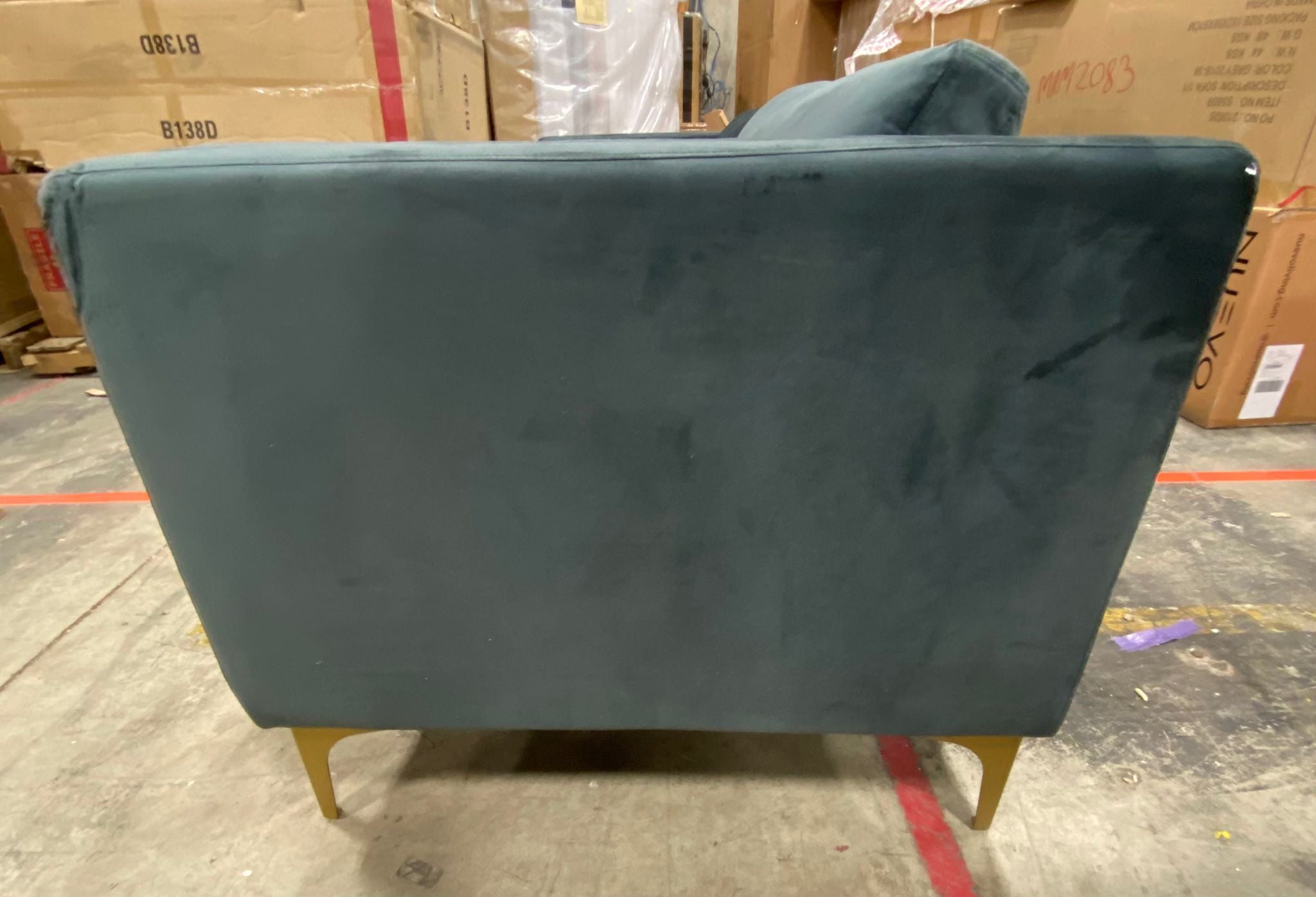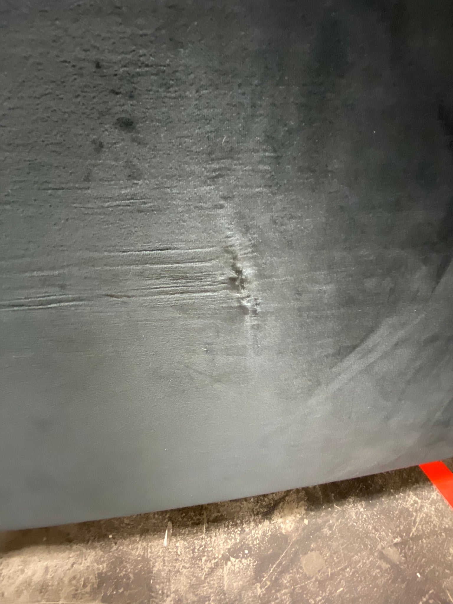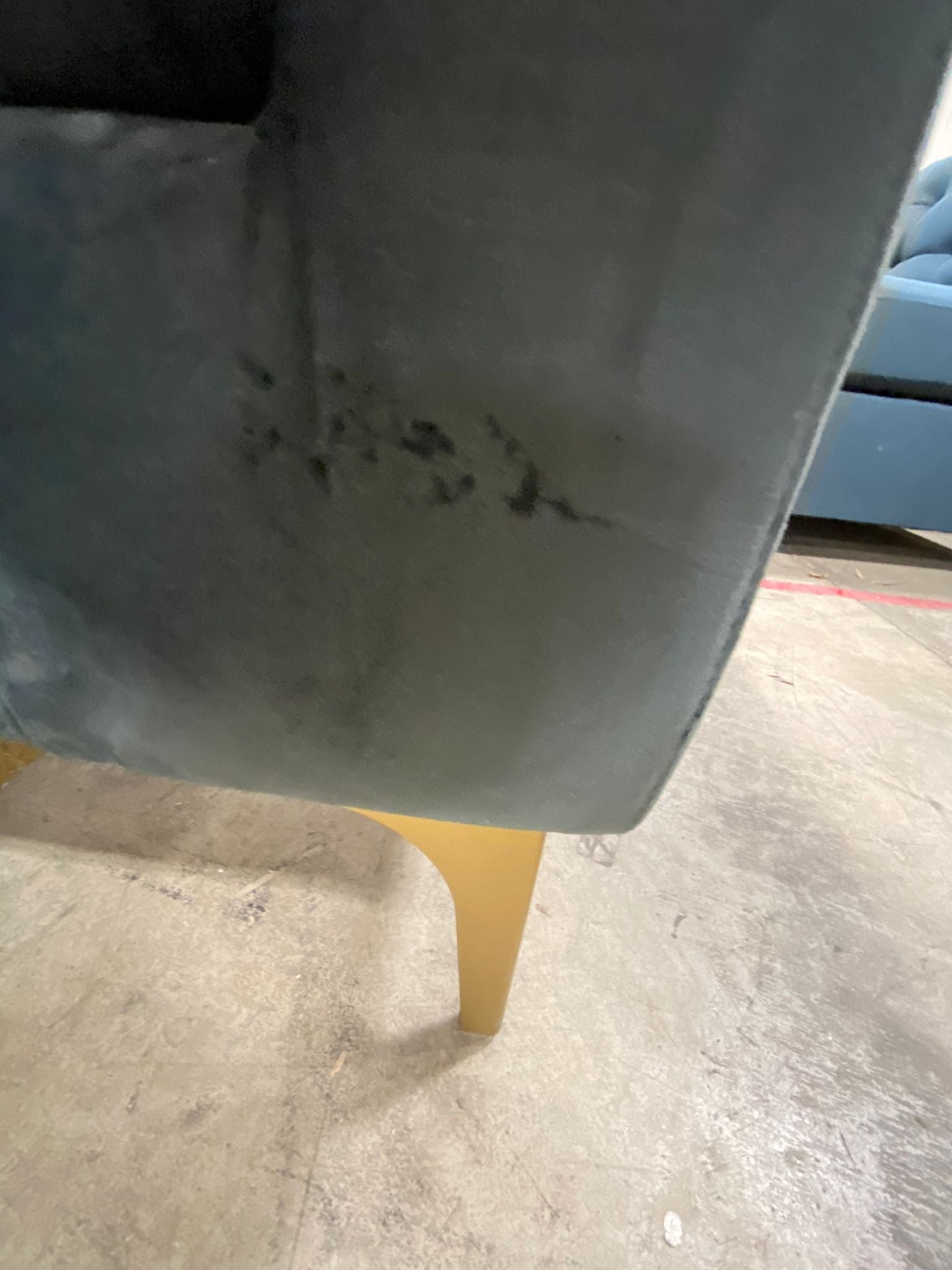 Out of box, The color is dark gray, slight cosmetic defect in the velvet on back of sofa. Small imperfections in the velvet throughout. Item in otherwise very good condition.