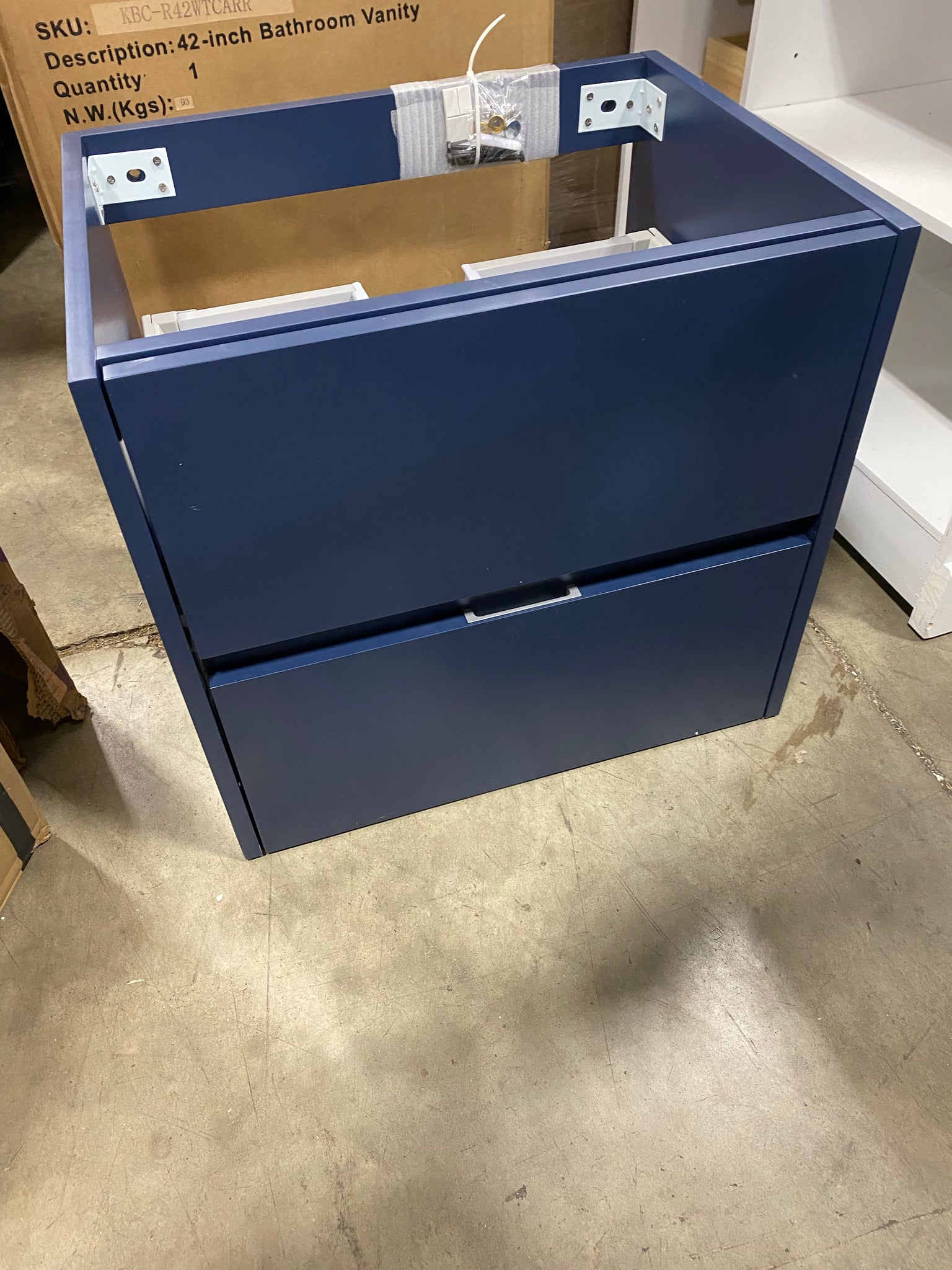 Out of box 24" single sink wall mount vanity with 2 drawers in Blue. Assembled. Base ONLY. Sink top NOT included.