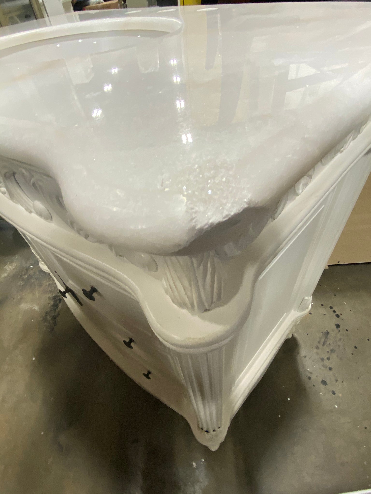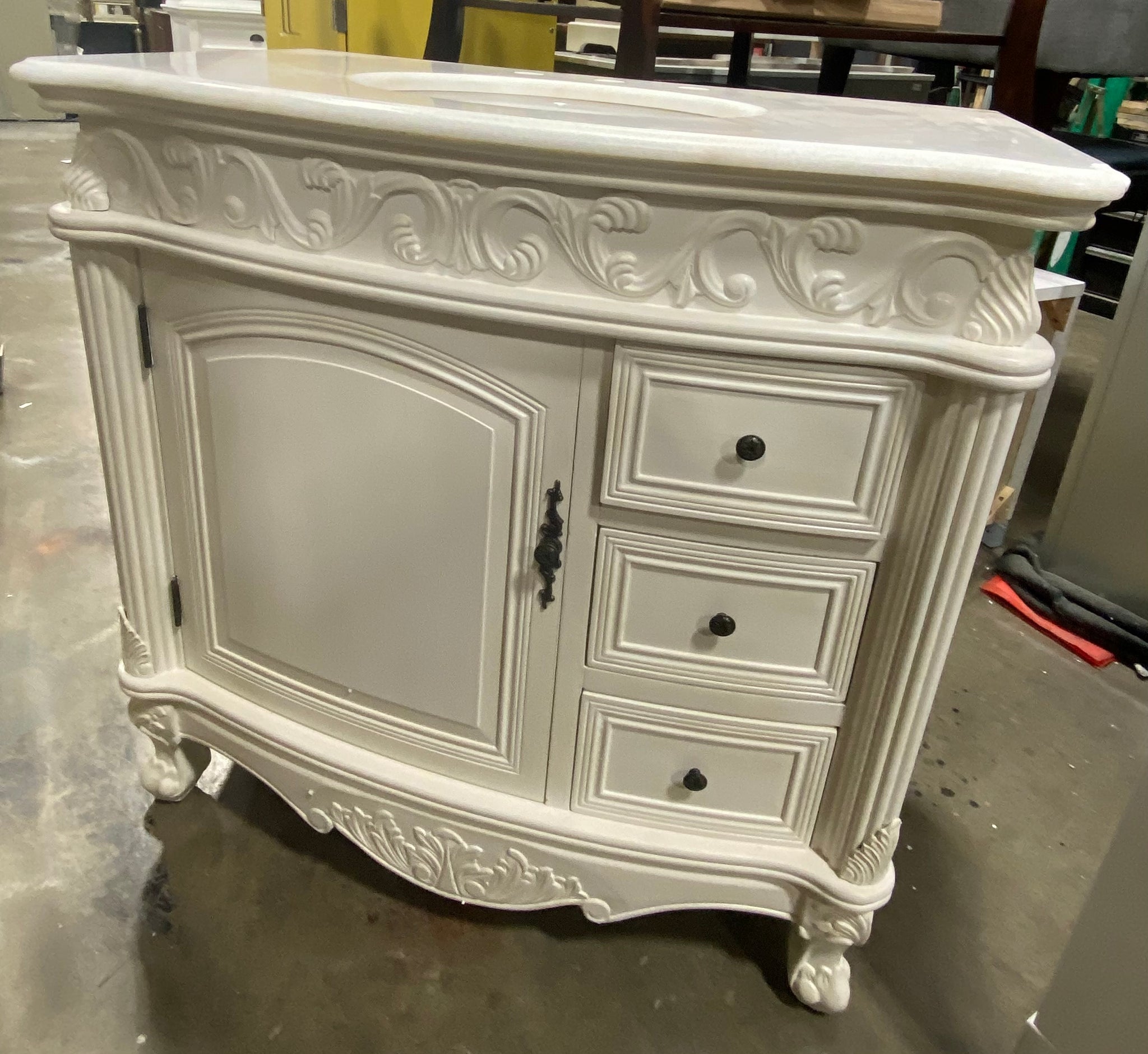 Please Note: Marble sink top chipped on right corner due to shipment; top has 3 surface hairline cracks. See photos. Item in otherwise great condition.