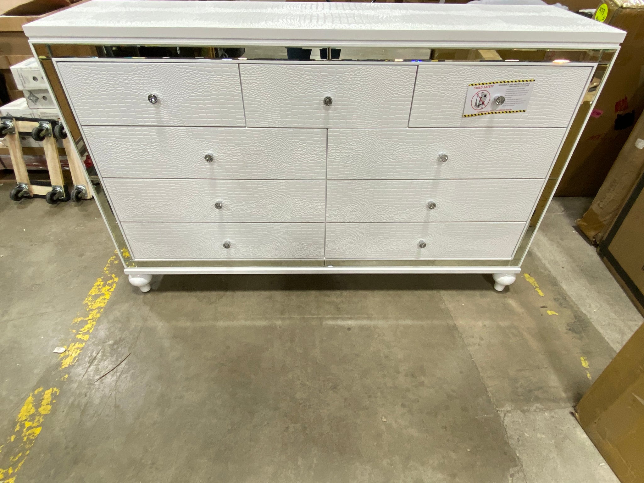 9 drawer embossed faux croc skin dresser in White with mirror edge accents. Item appears in great condition. See photos.