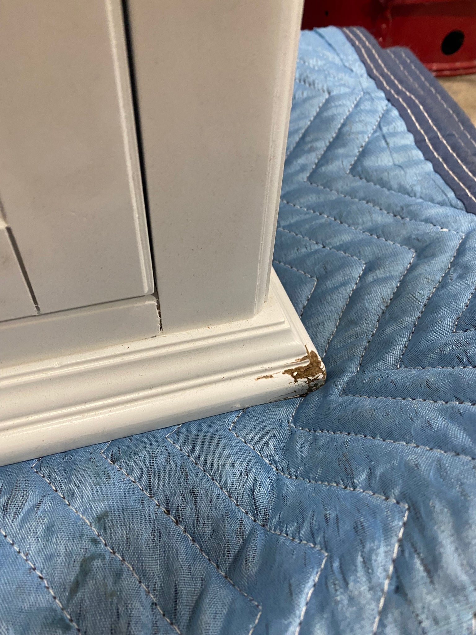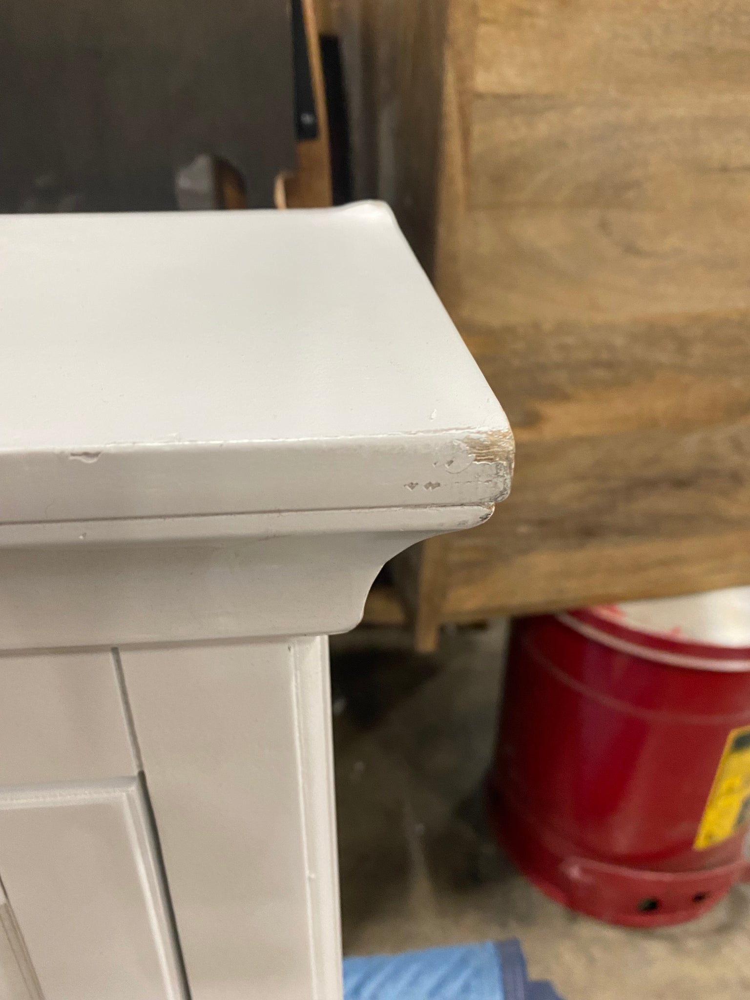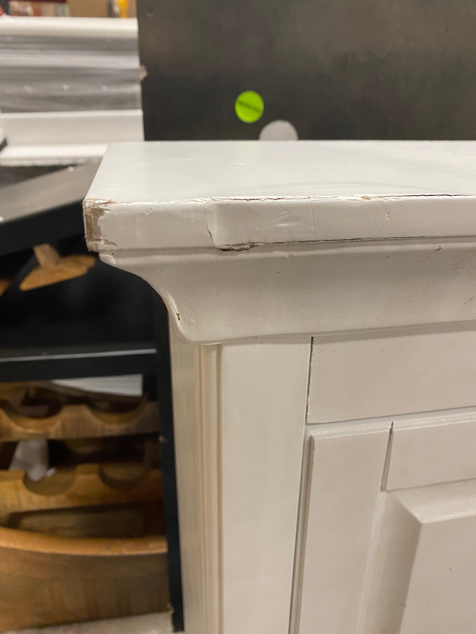 Out of box, The color is white, AS IS Condition: Dings/dents on all corners of cabinet. See photos.