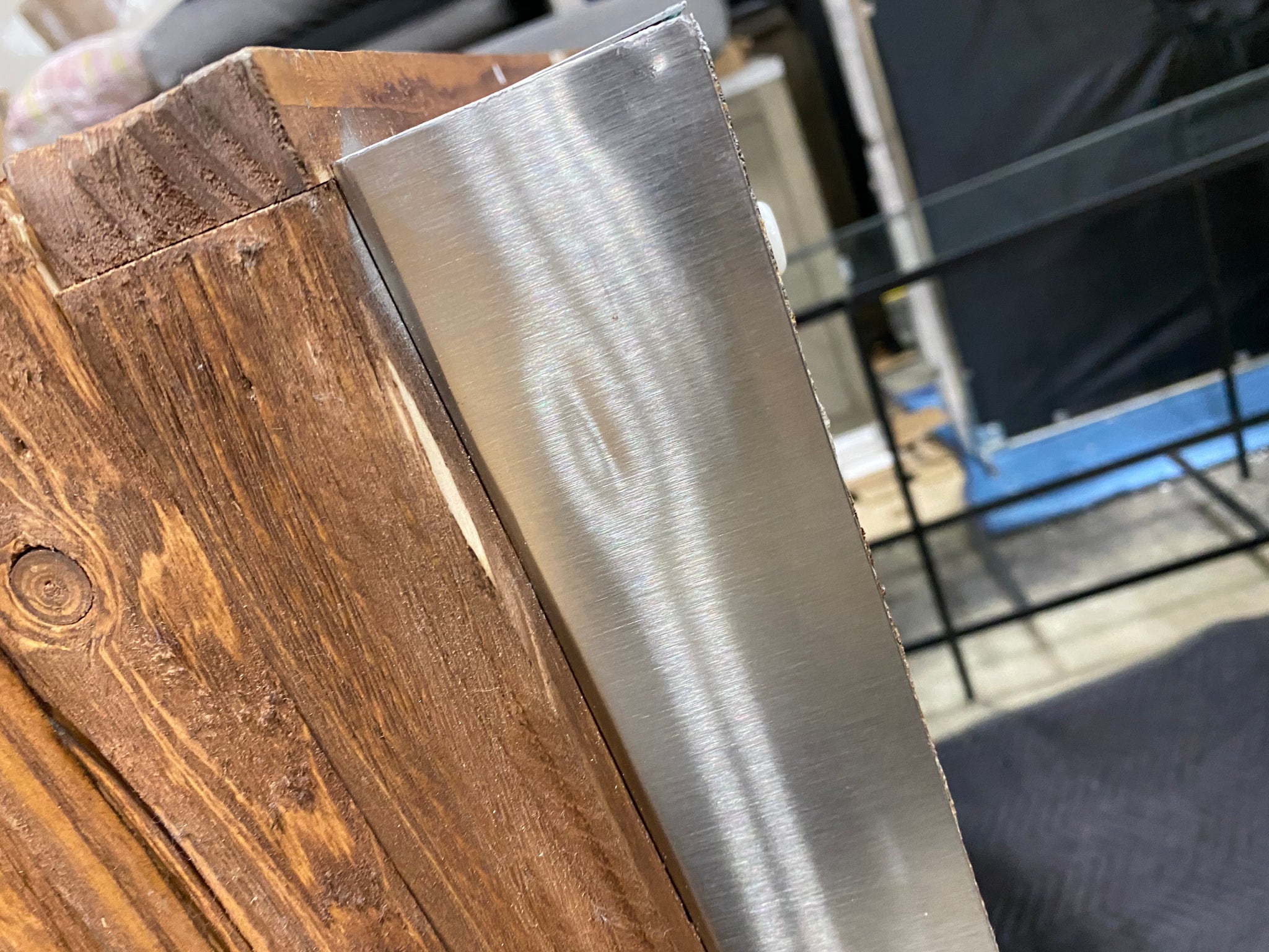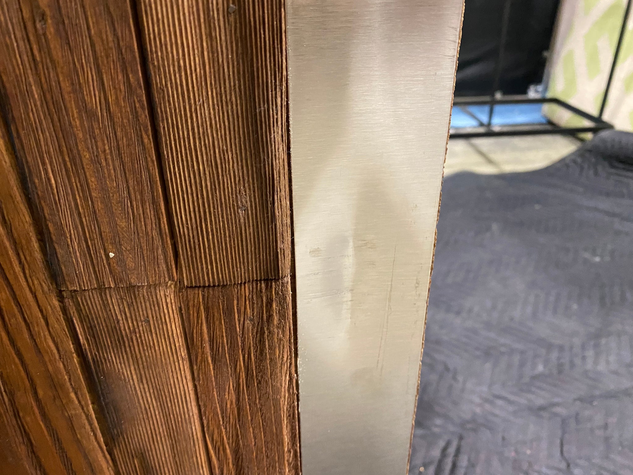 AS IS Condition: Small patch of wood missing on bottom edge; Dents on metal trim due to open shipment. Item base slightly warped resulting in table being slightly unlevel. See photos. Final Sale. Item non returnable.