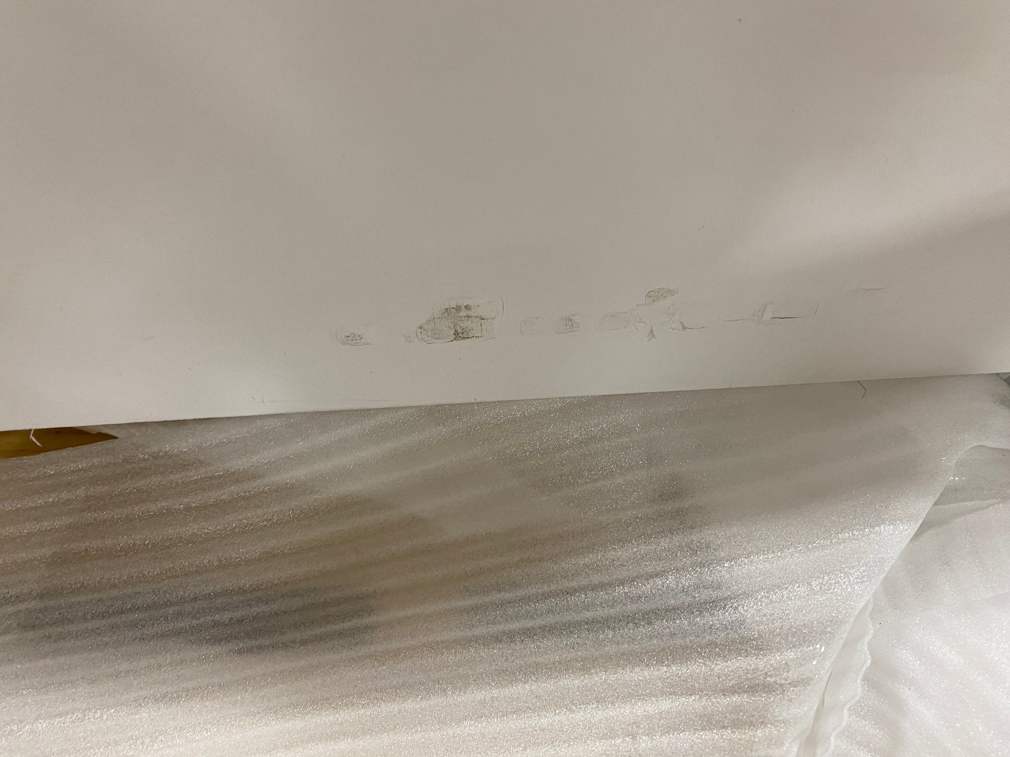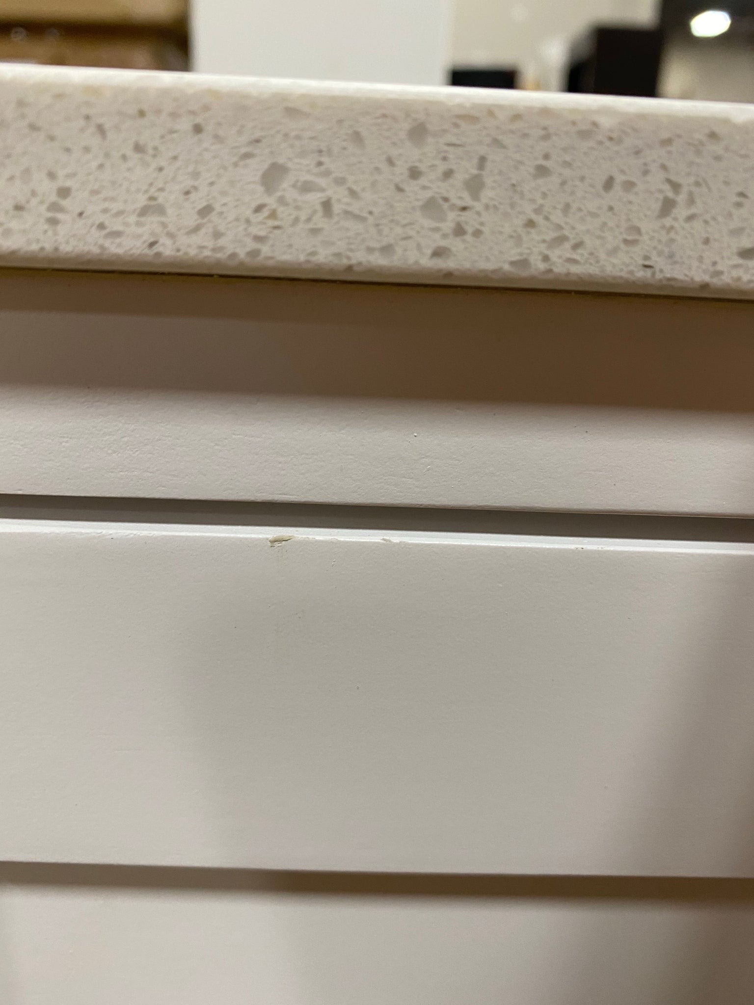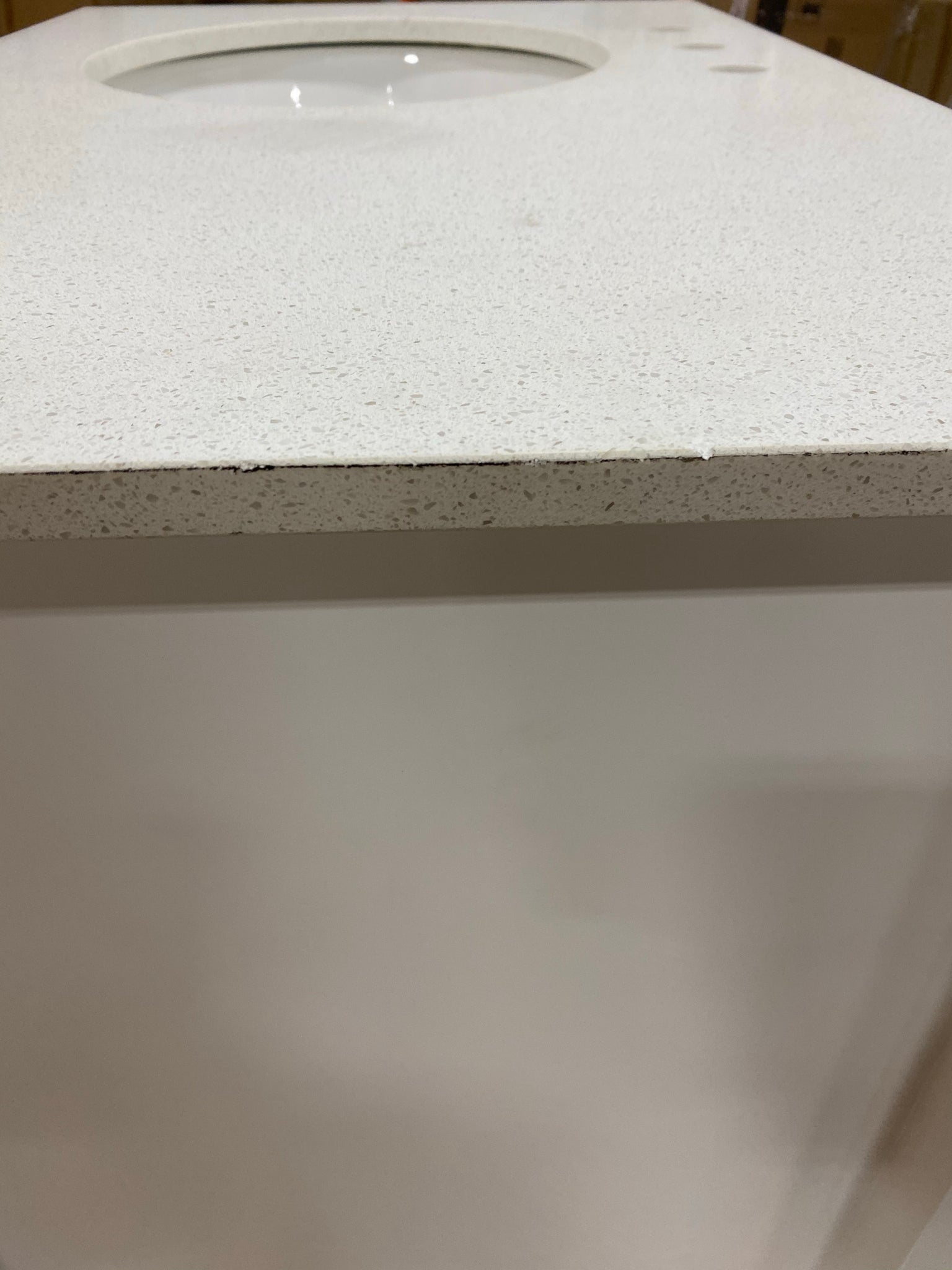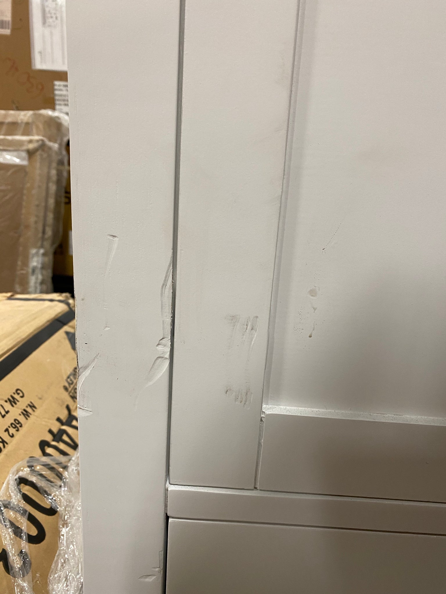 AS IS Condition- Vanity has dent/ding damage on front left side near edge; scratch damage near bottom edge on right side; blemish/dark marks on right side granite edge and on sink top. All cosmetic damage-Item is in structurally great condition otherwise. Final Sale. Item is not returnable. See photos.