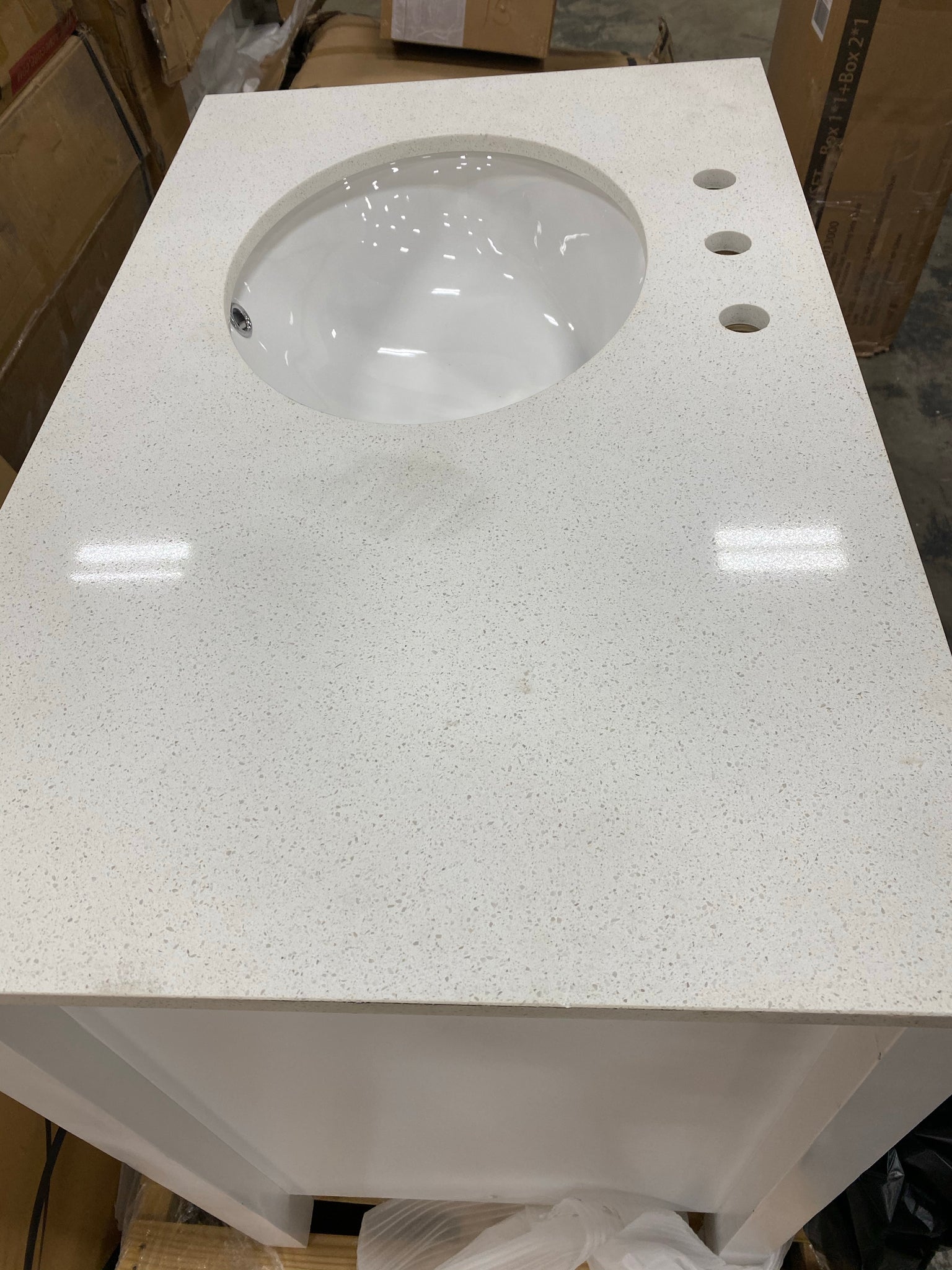 Out of box 36" single sink vanity in White with White Granite top. Assembled.