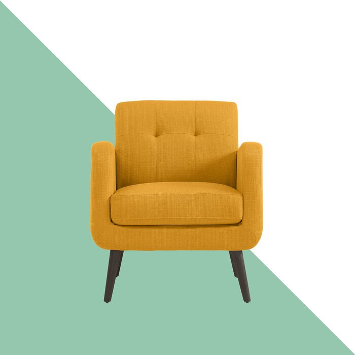 Open box item. This box has been previously opened. Retro armchair upholstered in a mustard yellow polyester linen with button tufting. Founded on a pinewood, poplar, and ply frame, this armchair features a full back, track arms, and four flared dowel legs. This armchair also features thick fiber-wrapped foam core cushions that are removable and provide comfort and support. Its weight capacity is 300 pounds. Assembly is required.