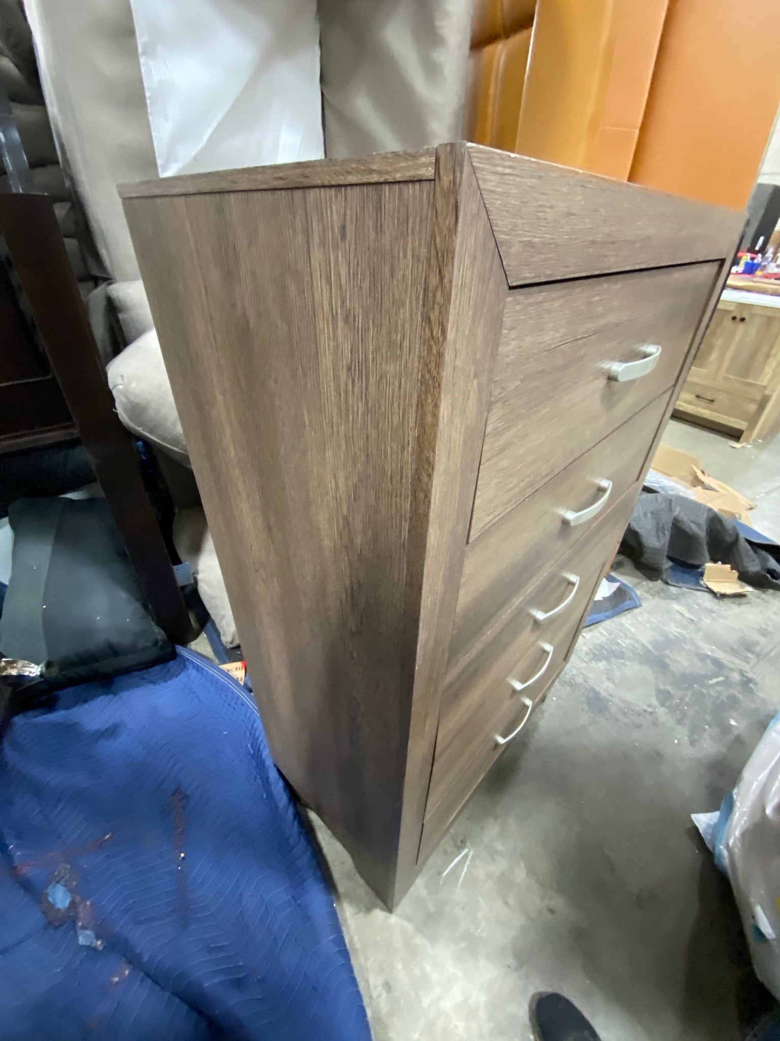 5 drawer chest in Light Oak finish. Item lighter than stock photo.
