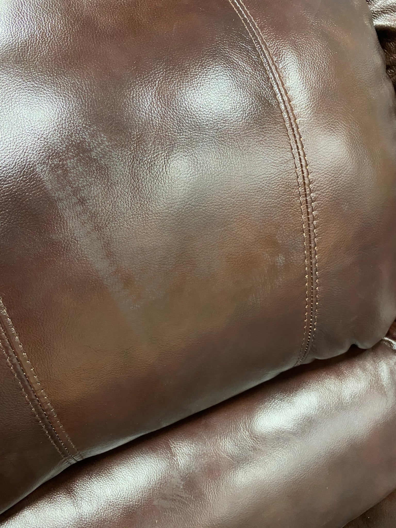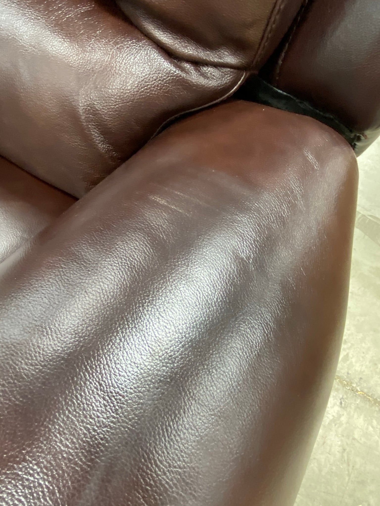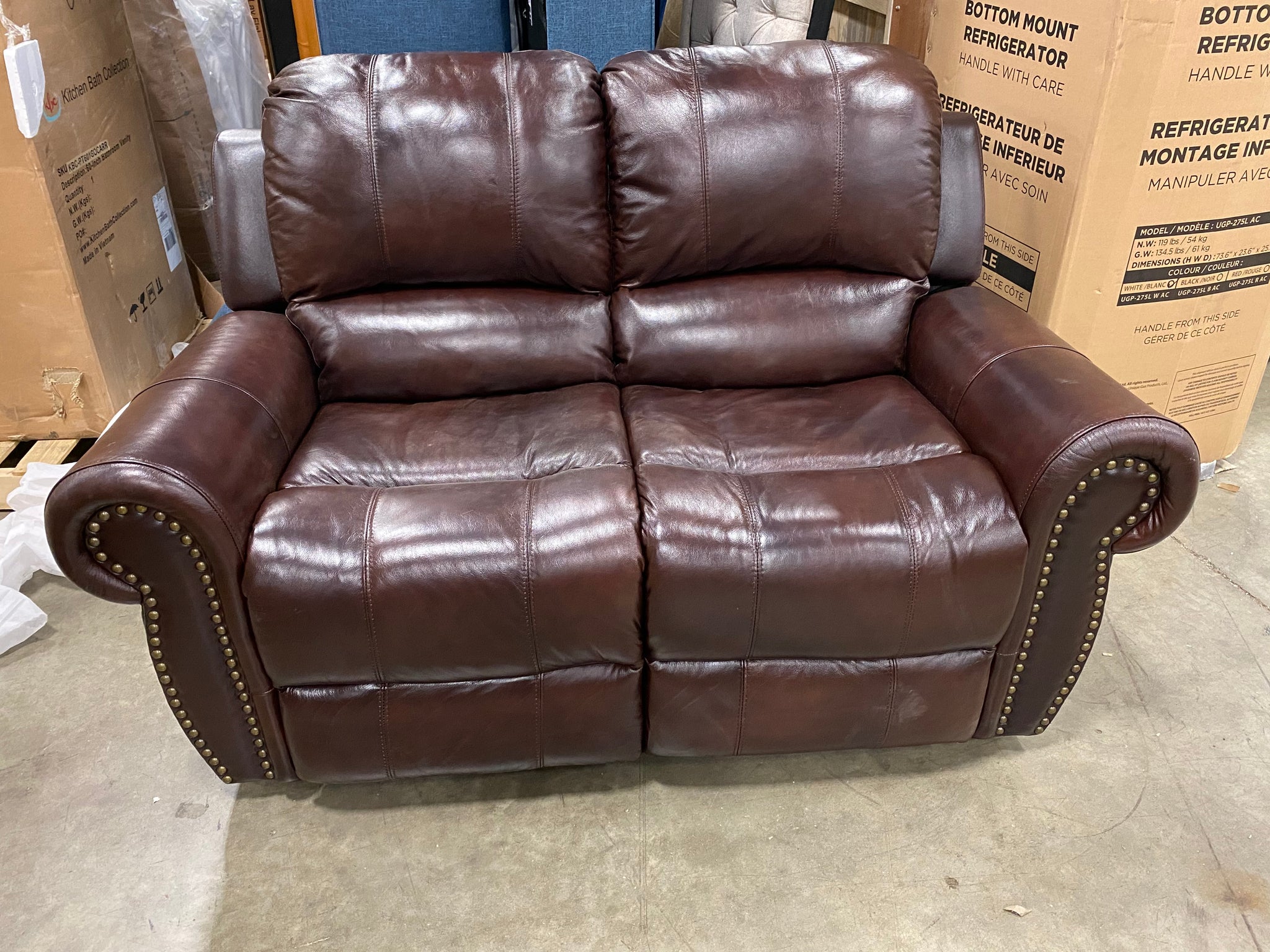 Out of box 3 piece reclining living room set in mahogany brown leather with nailhead trim. Assembled.