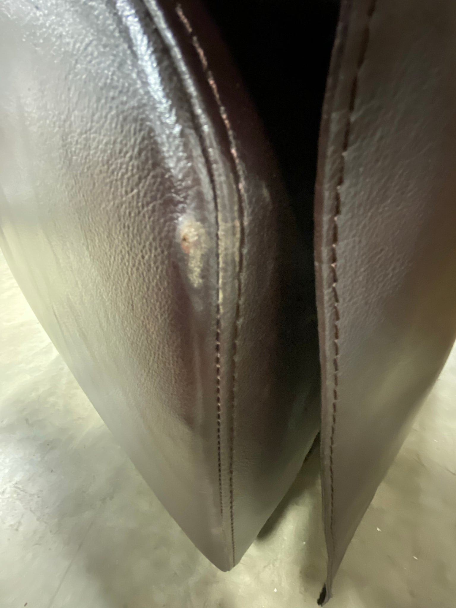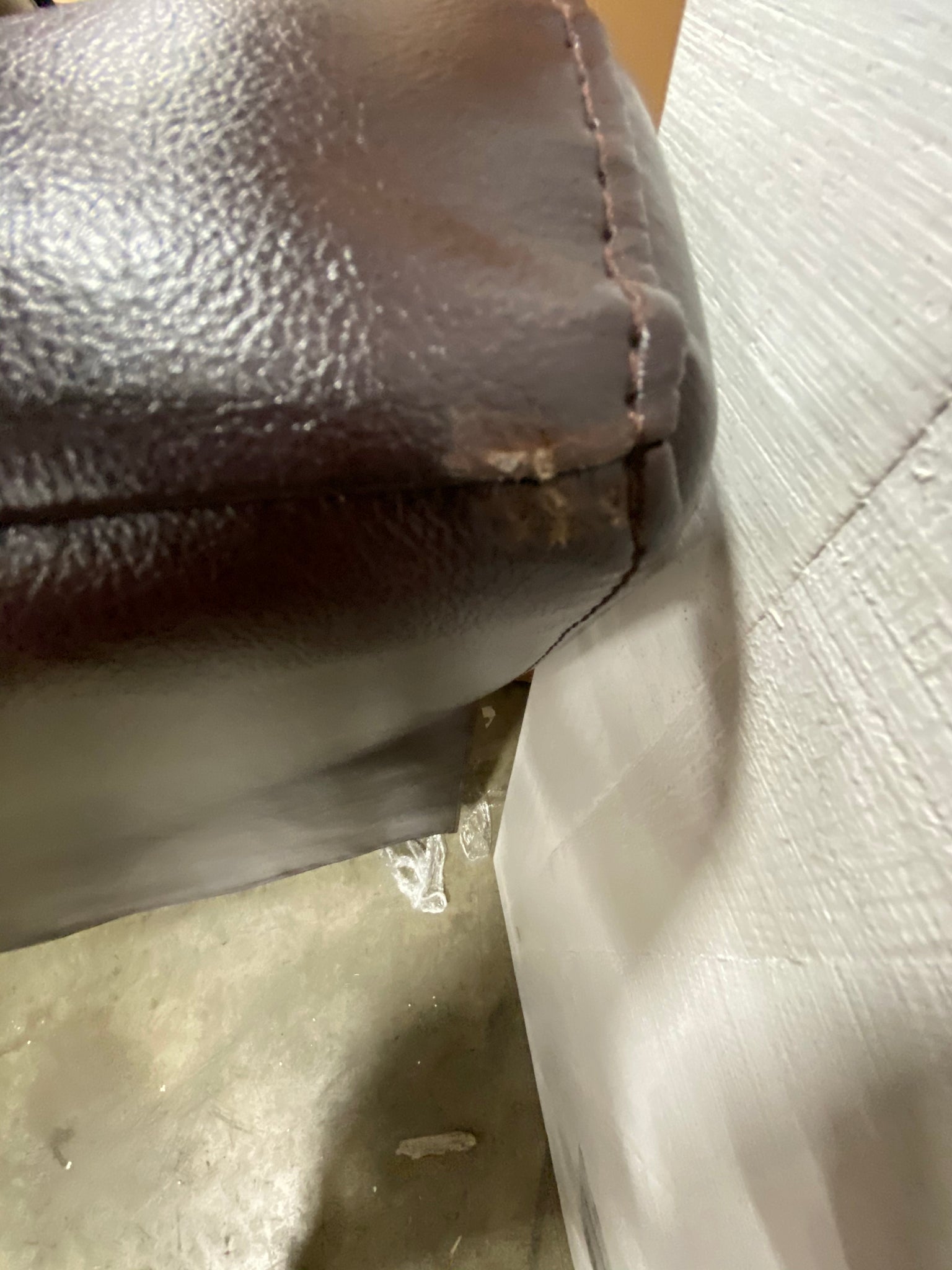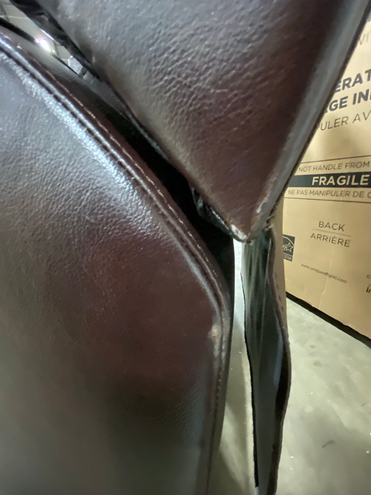 Out of box 3 piece reclining living room set in mahogany brown leather with nailhead trim. Assembled.
