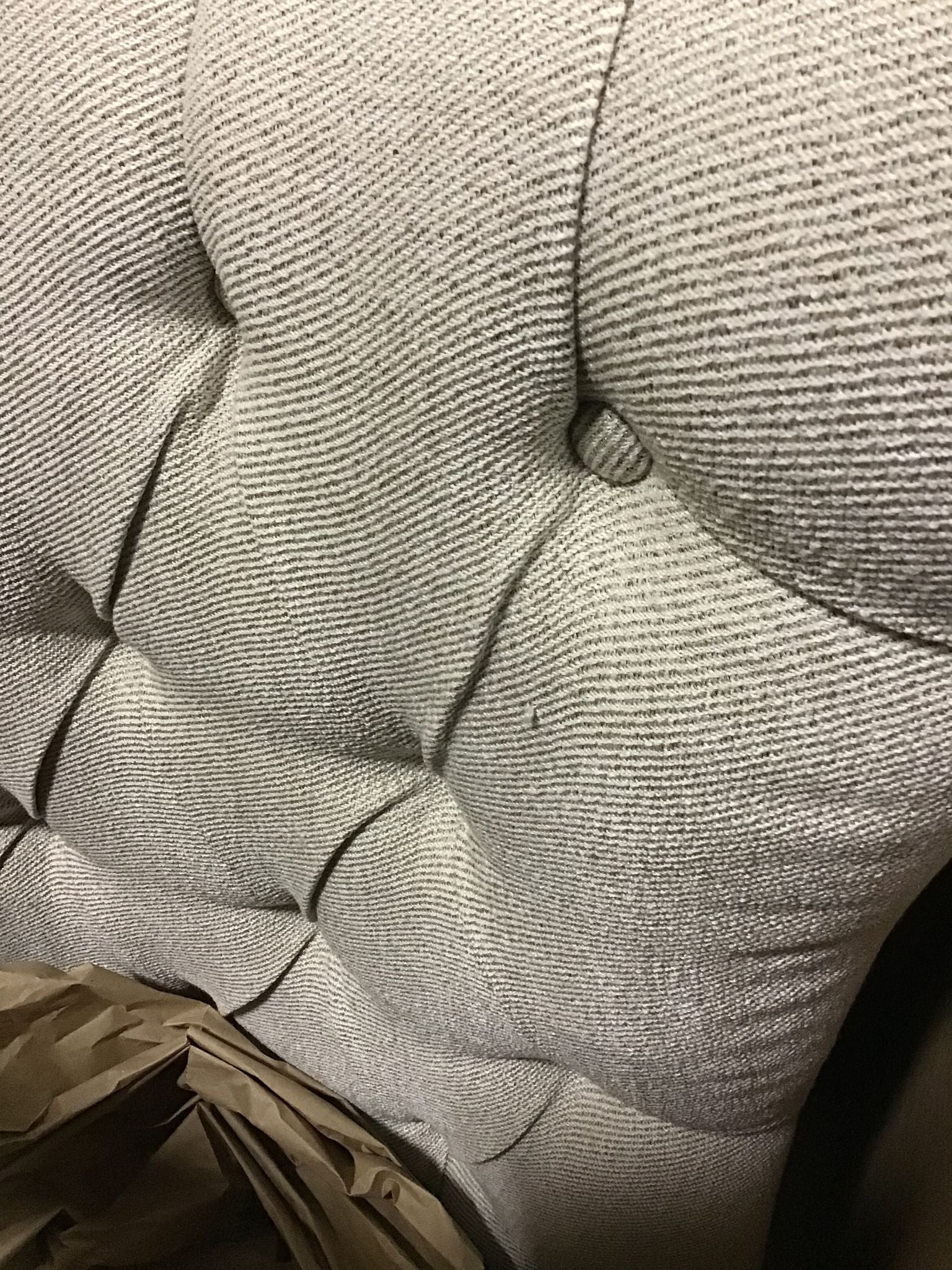 Open box, The color is wheat, Loose thread on the back of the chair. See photo.
