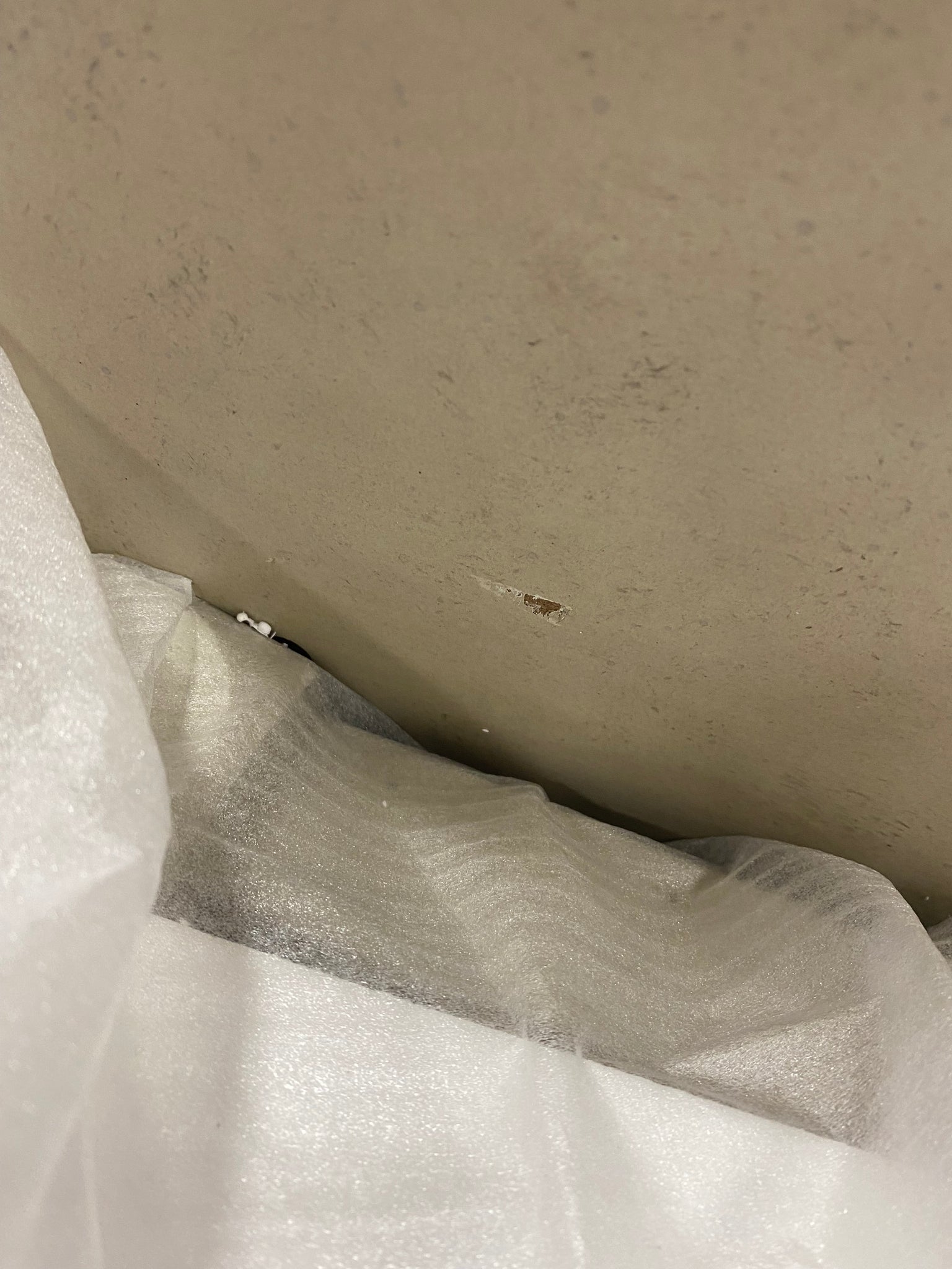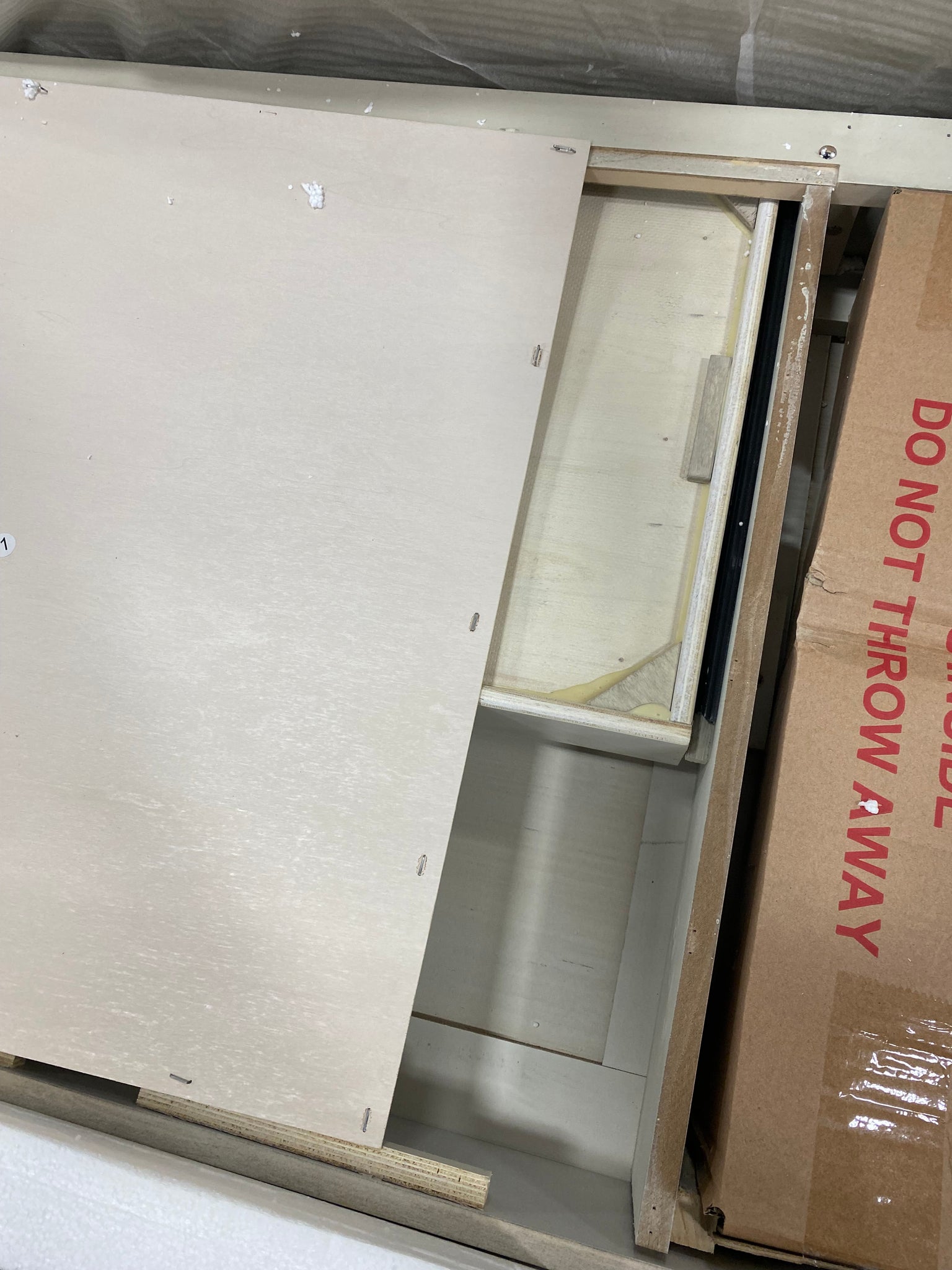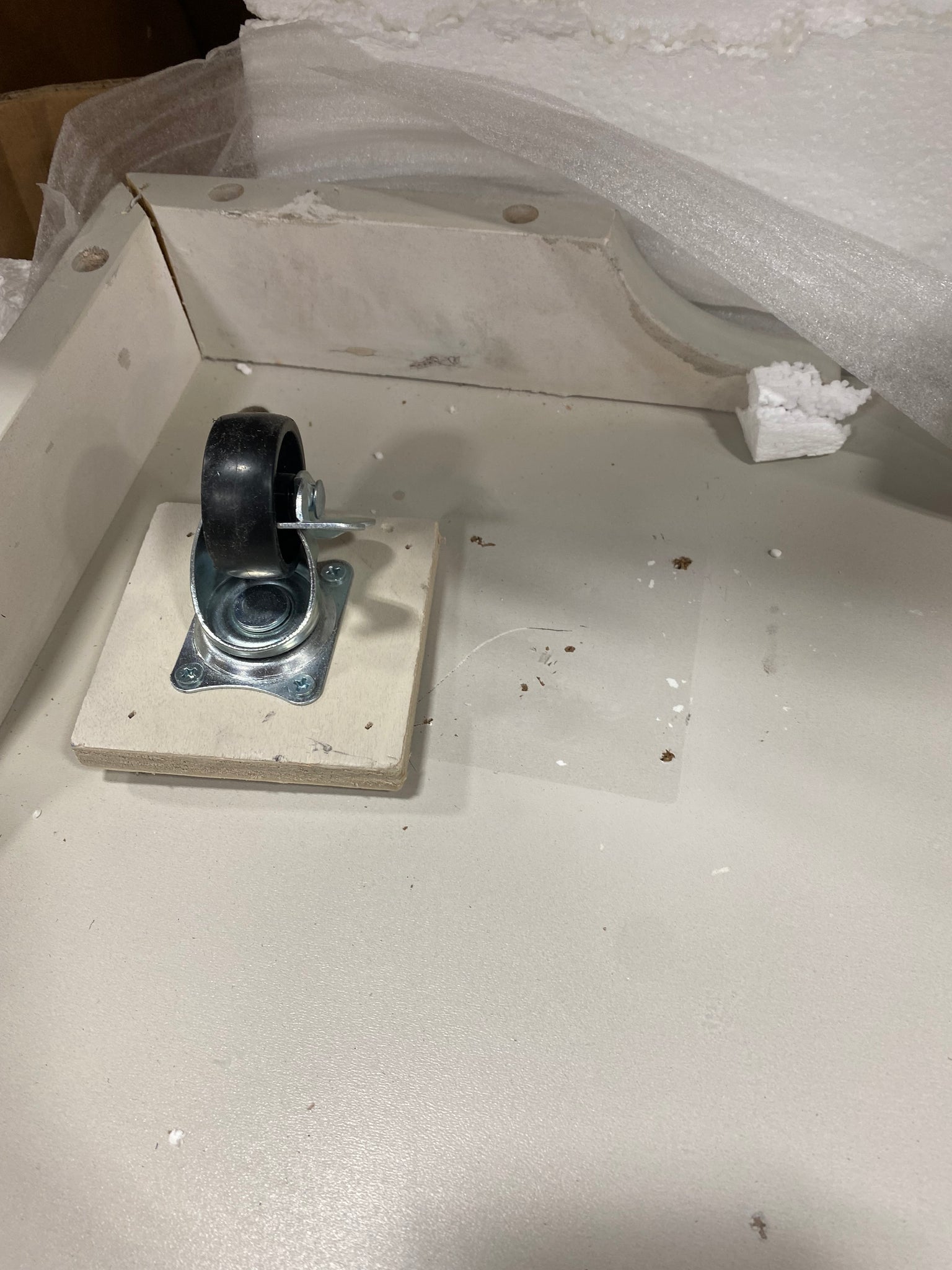 AS IS Condition: Bottom shelf damaged on 2 corners. Slight ding on corner edge of top. 2 wheels have come off on bottom. Need glued back on. Underboard needs stapled on underneath drawer. See photos.