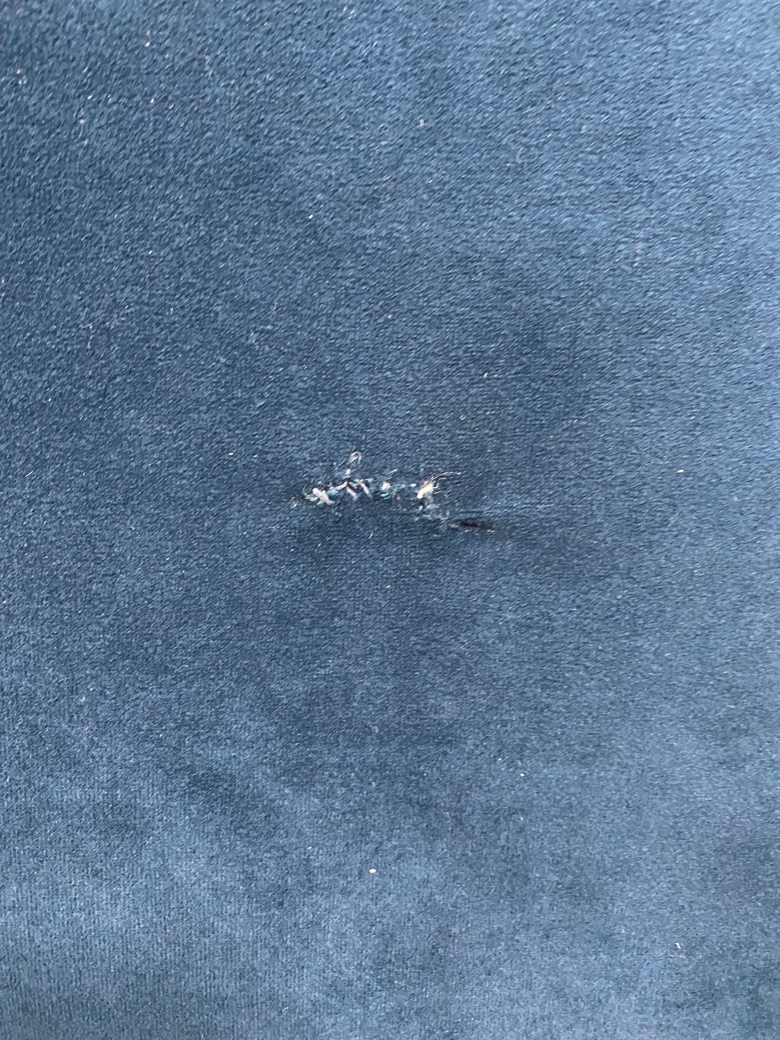 Out of box, The color is indigo, Item has small tear (repaired) on reversible seat cushion. Item in otherwise good condition.