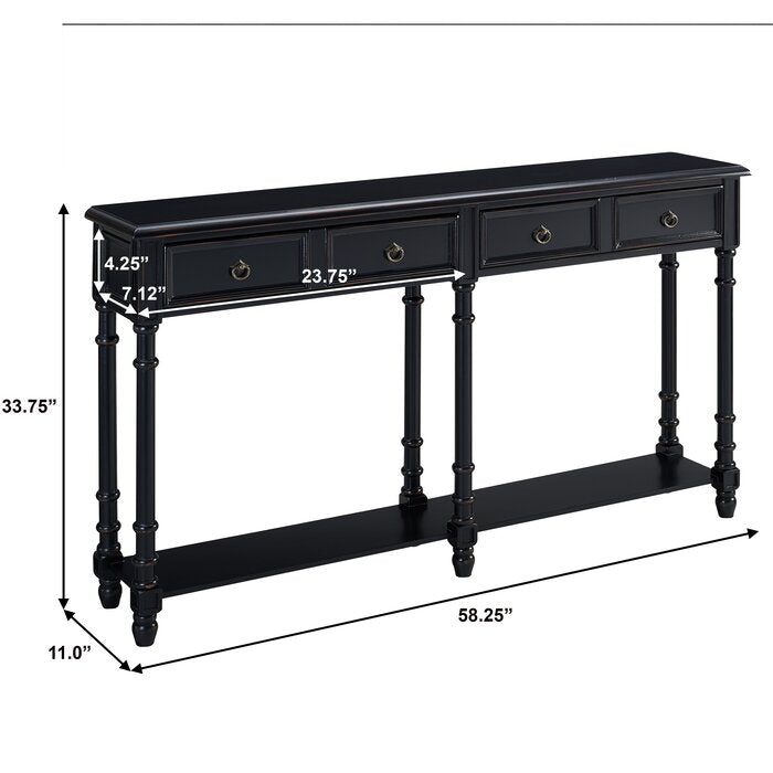 Open box item. This box has been previously opened. Console table made of manufactured wood in a distressed black finish features 2 drawers and a bottom shelf for ample storage. The weight capacity of the table itself is 125 pounds and the weight capacity of the bottom shelf is 25 pounds. Assembly id required.