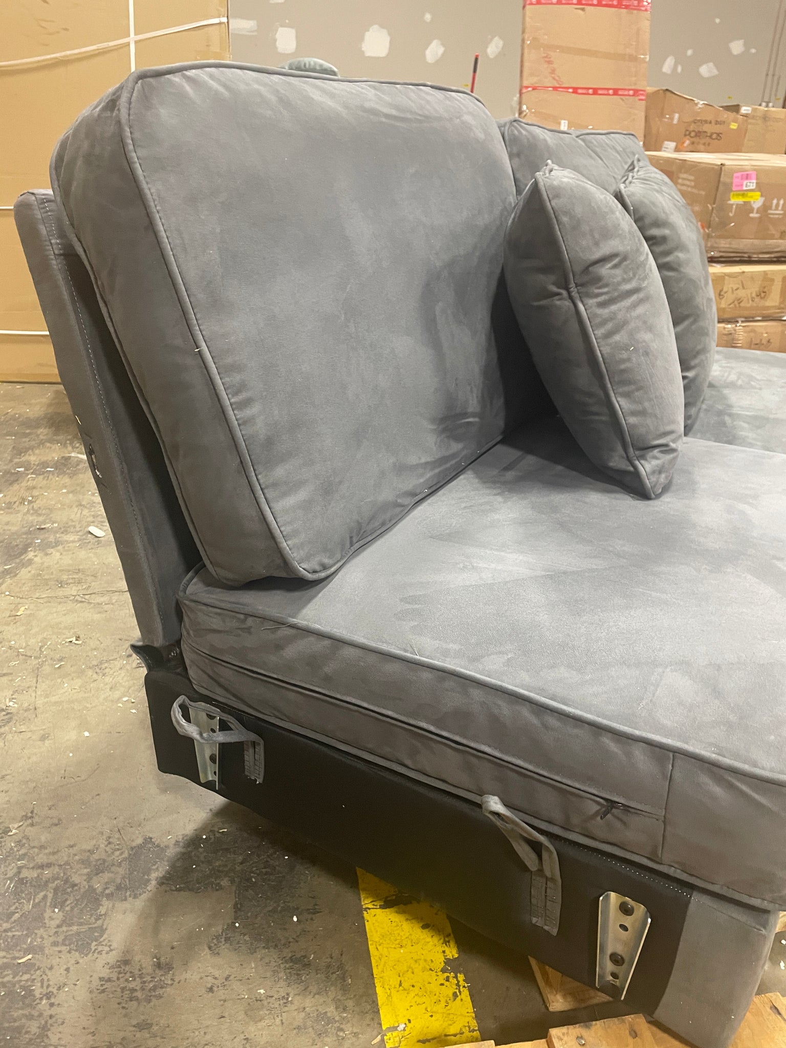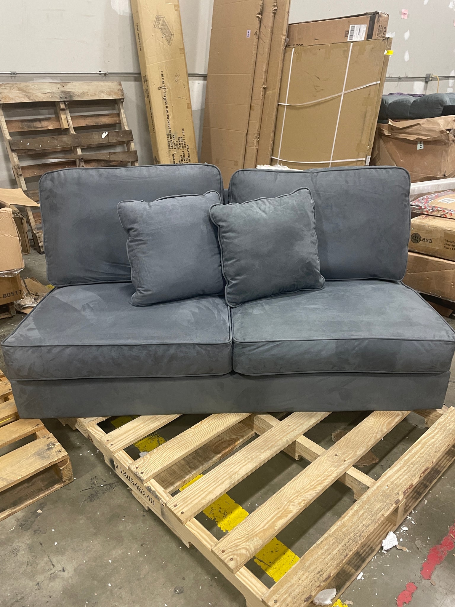 Out of box item, this is for an Armless sofa, the color is smoky blue velvet. This piece does not include the arms of the sofa or the legs of the sofa. Good basement or garage sofa. Some warehouse dust from being out of package but overall good condition.