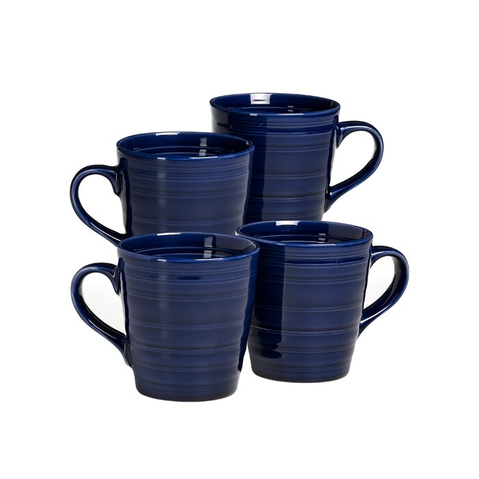 Set of 4 blue stoneware mugs that are dishwasher and microwave safe.