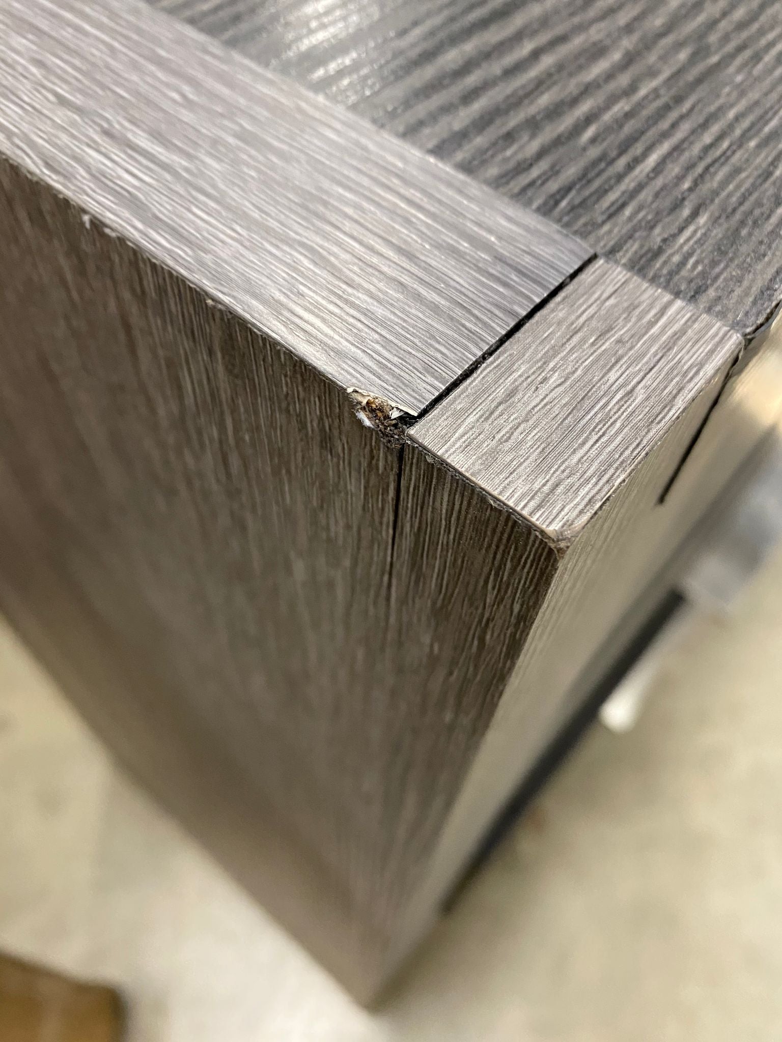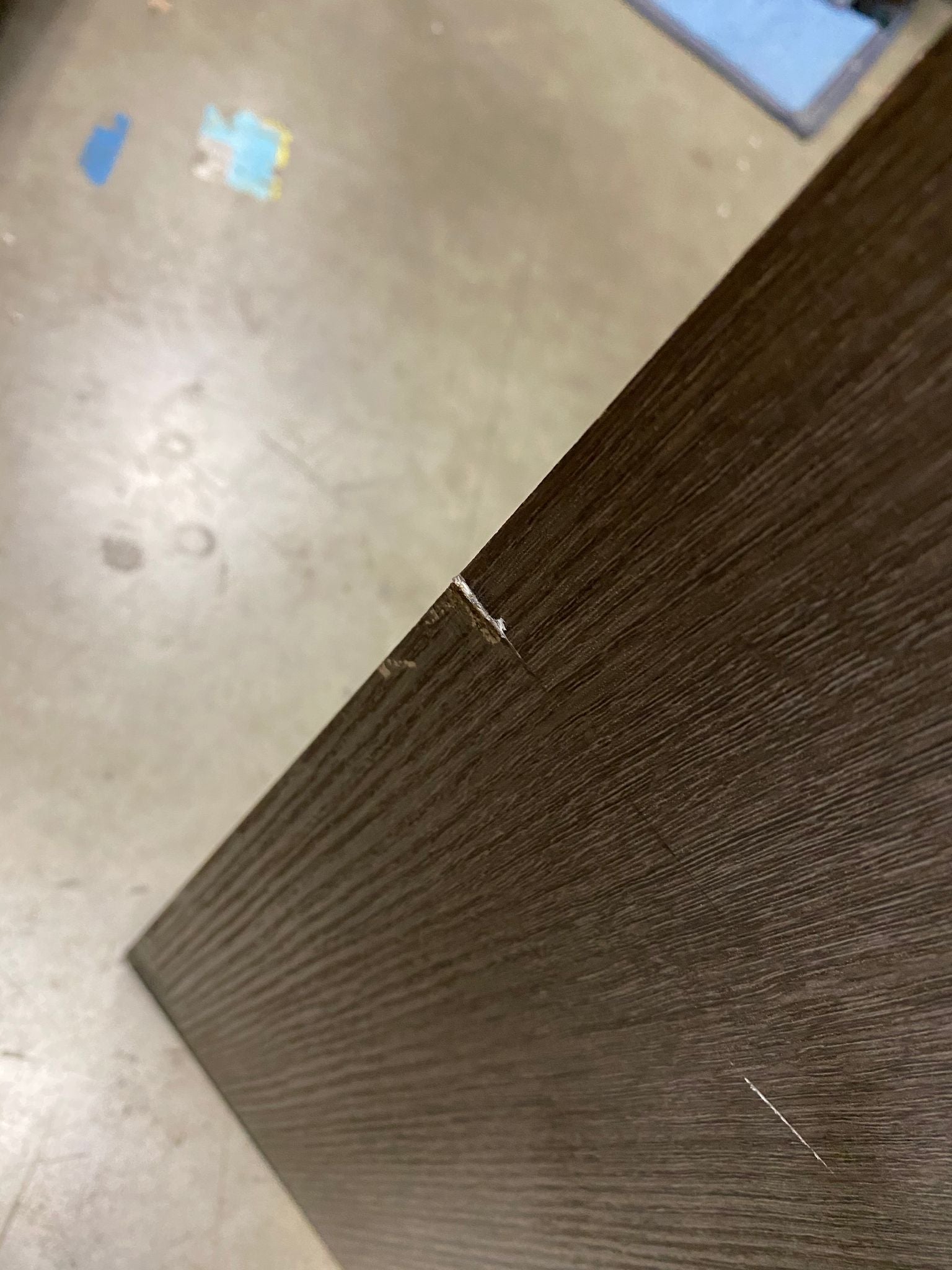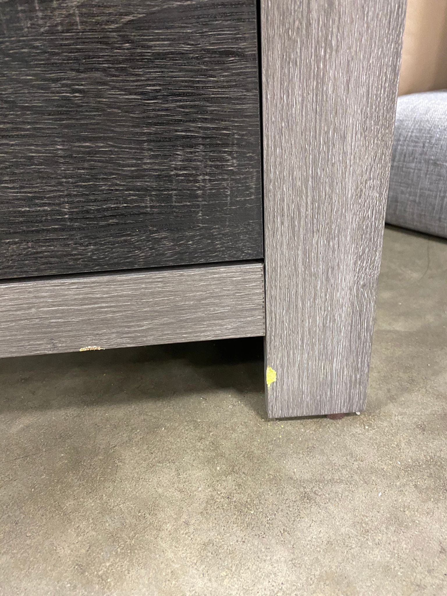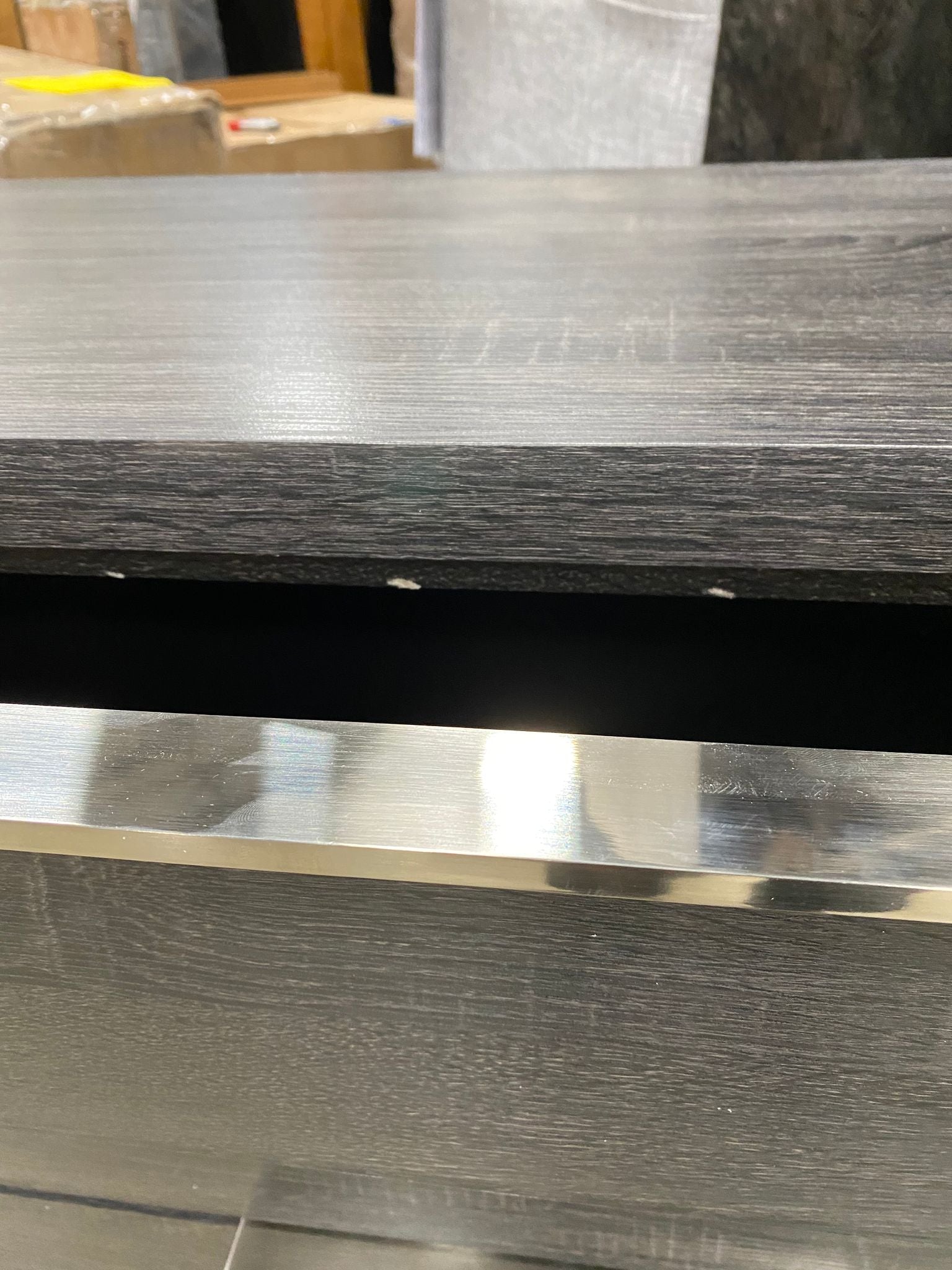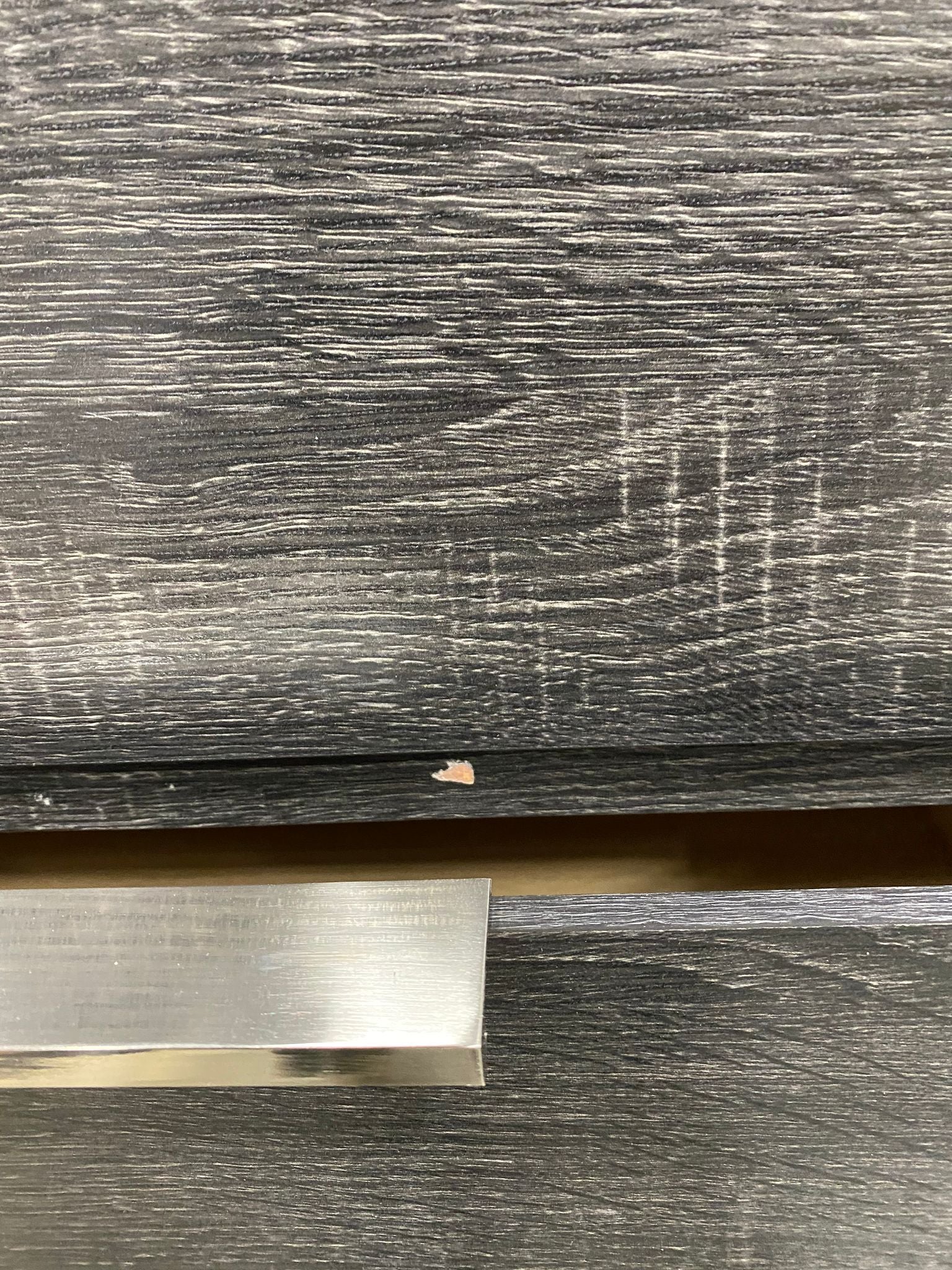 Out of box, AS IS Condition: Slight dings along top/back edges of dresser; small chip on right bottom leg front; small worn ledges where drawers close on 5 of the drawers(Please Note: not visible when drawers are closed.)