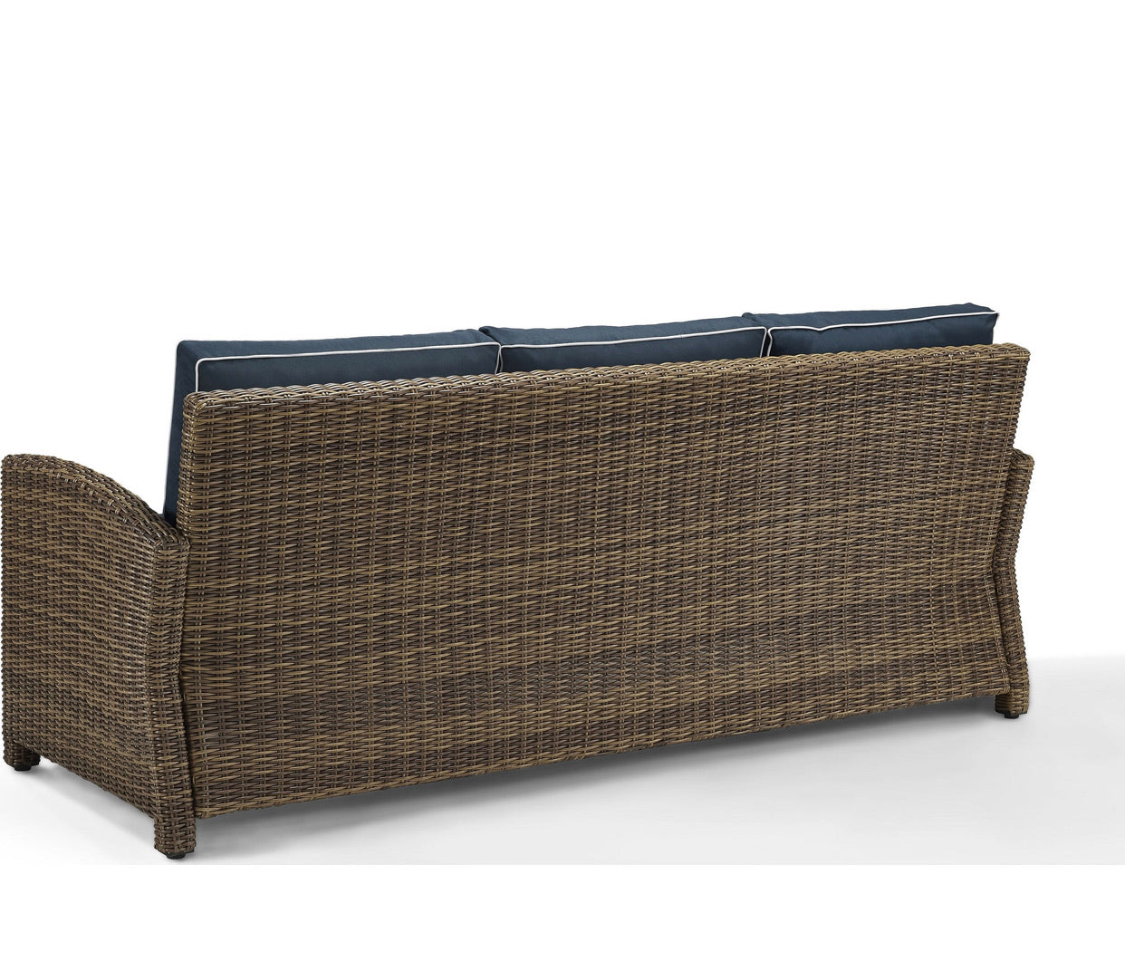 In box outdoor wicker rattan 3 seater sofa in Brown. Comes with 3rd party navy blue cushion covers. Original pictured cushion covers NOT included with sofa. Assembly required. 2 boxes.