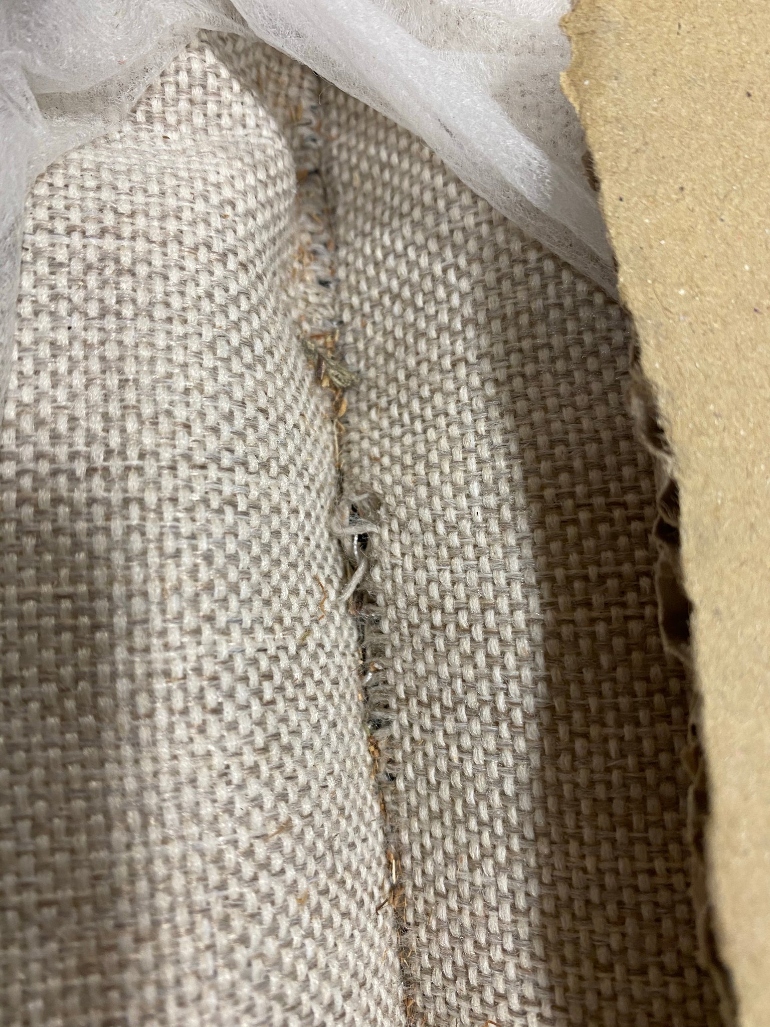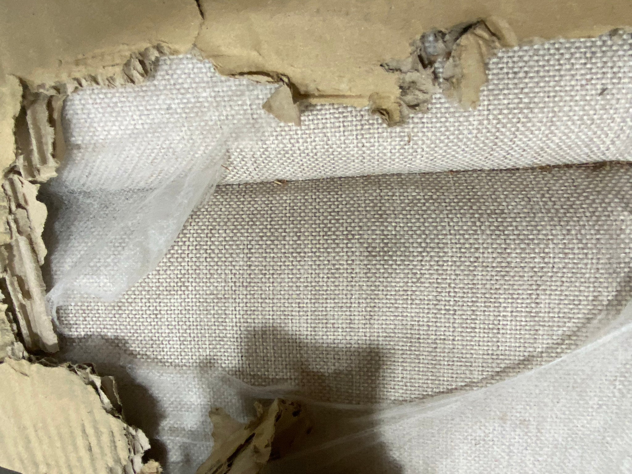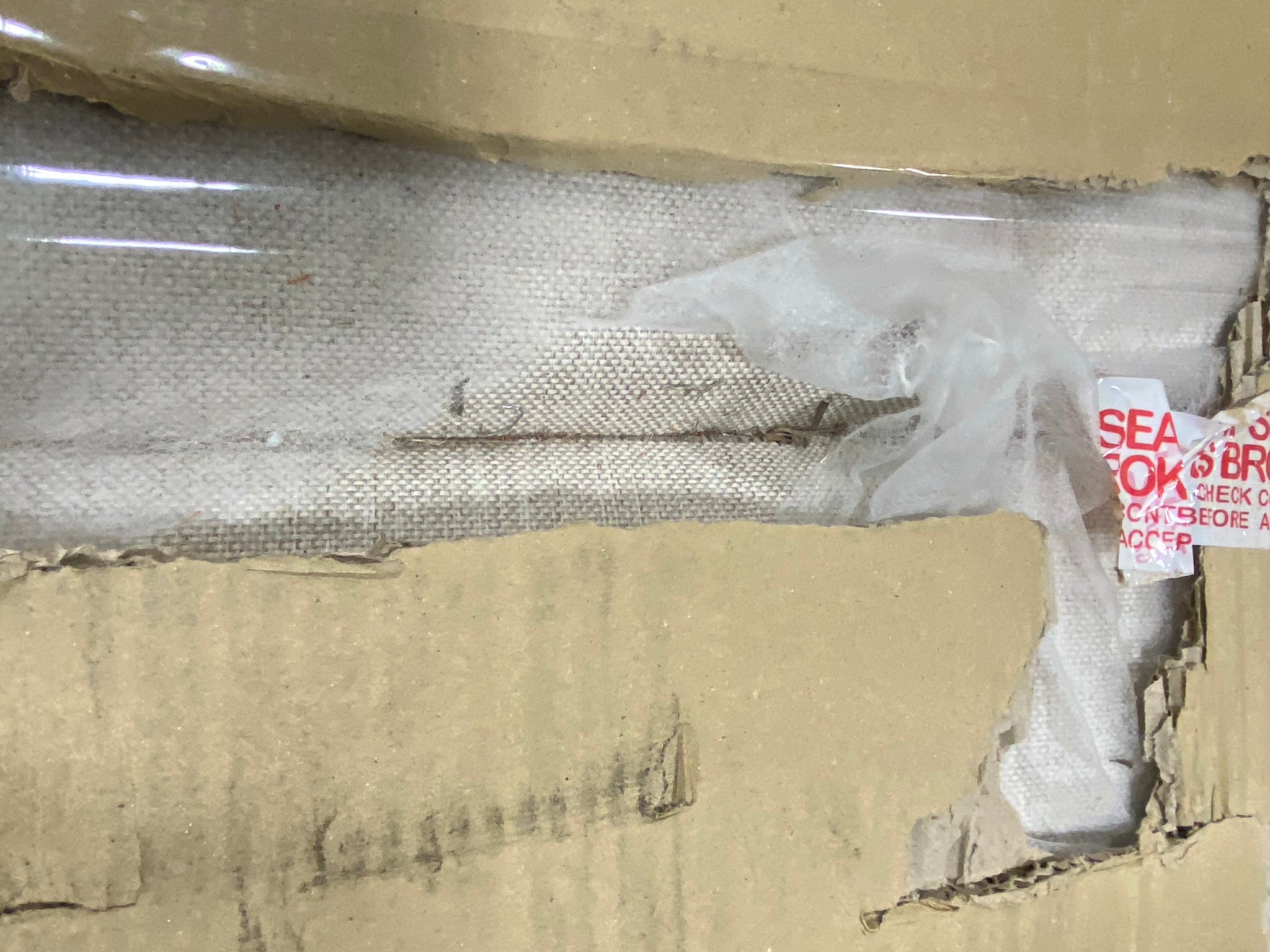 Please Note: Small opening where seam has opened in tufted seam due to box damage; Some areas have debris due to openings in the box. See photos. Item in otherwise great condition.