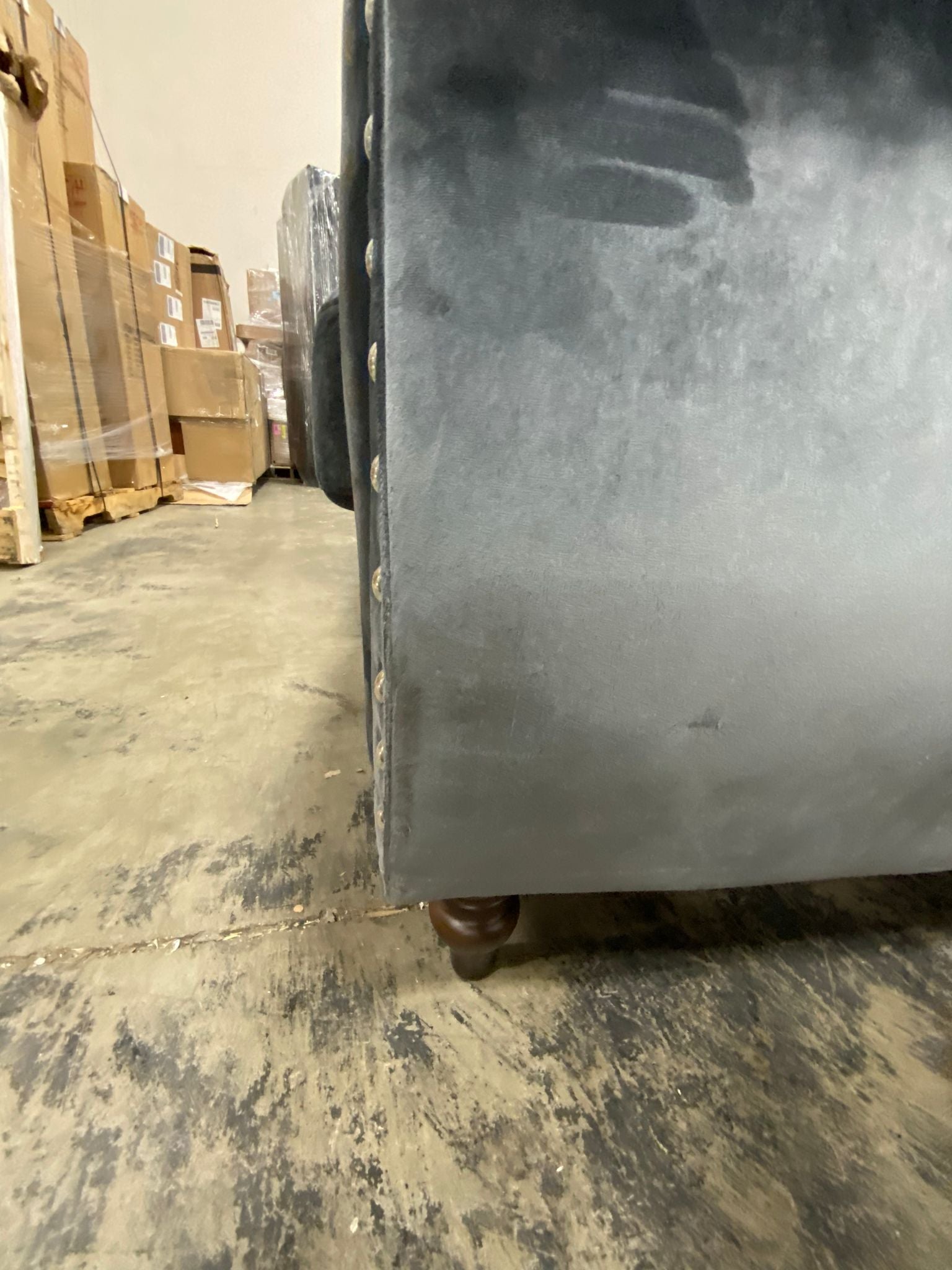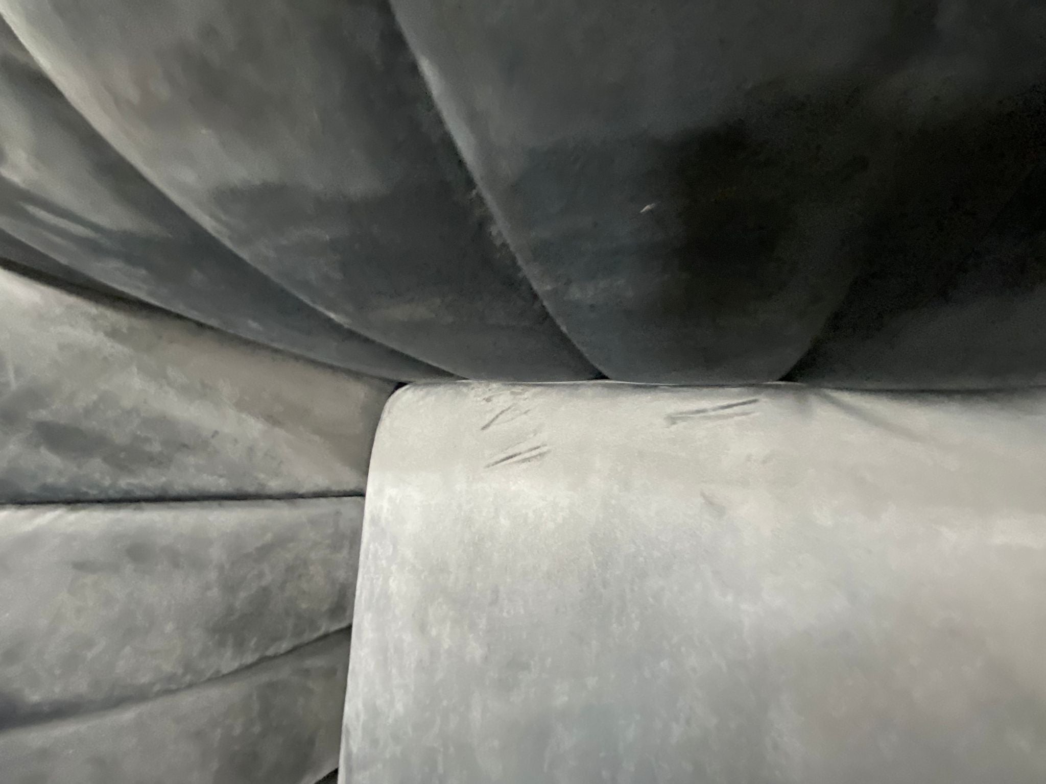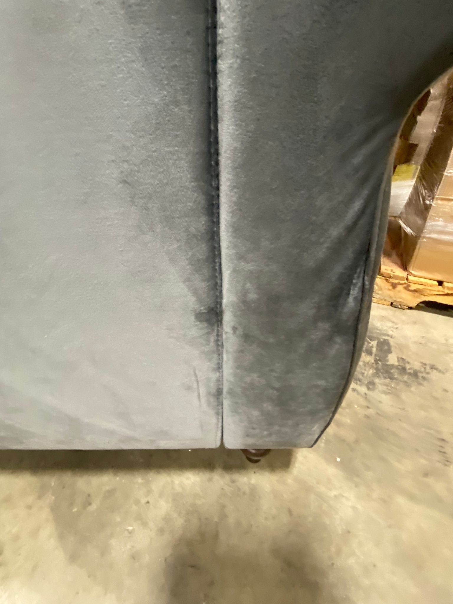 Out of box, The color is gray, Item has some imperfections in the velvet on back side/side panels/cushion seat of sofa. Side panels have some mild scuffing due to open shipment. See photos. Item in otherwise good condition.