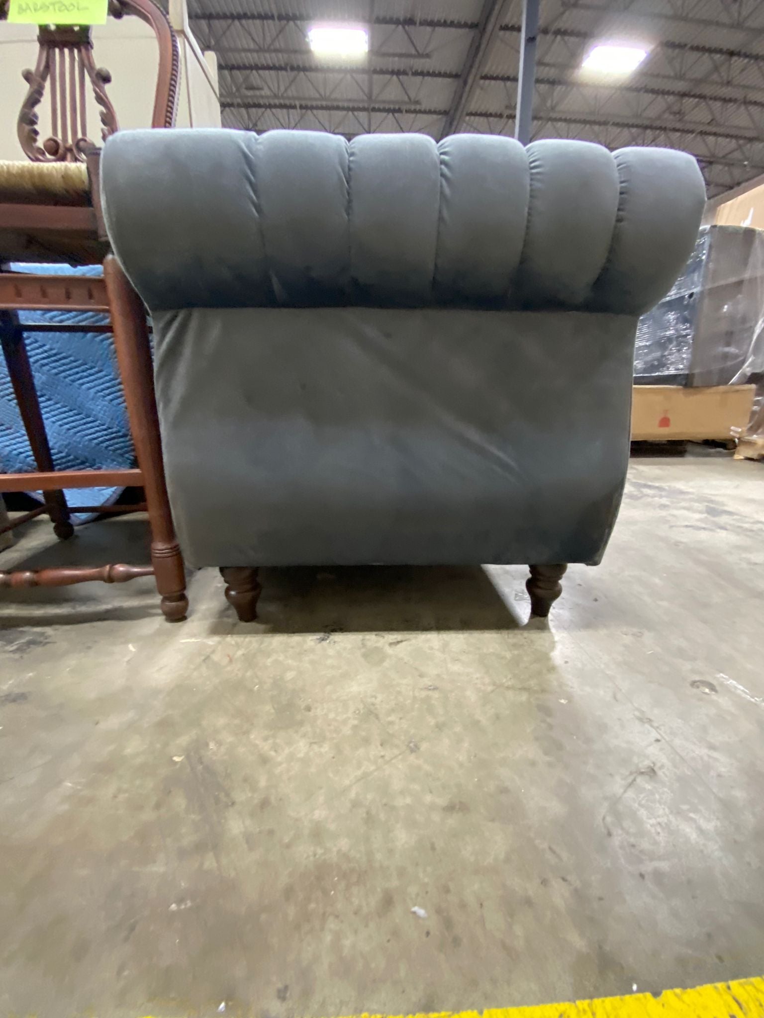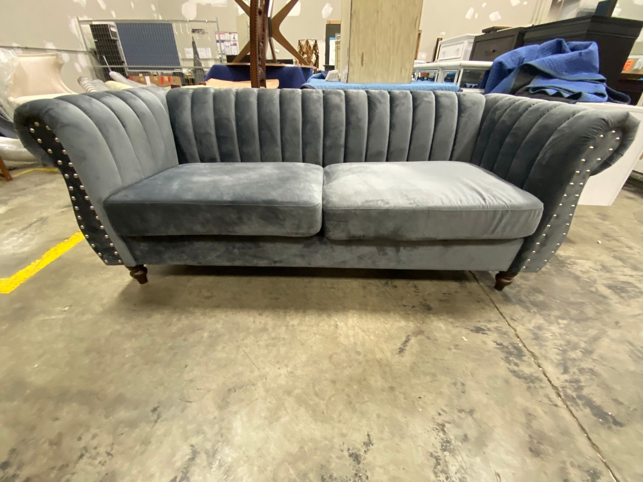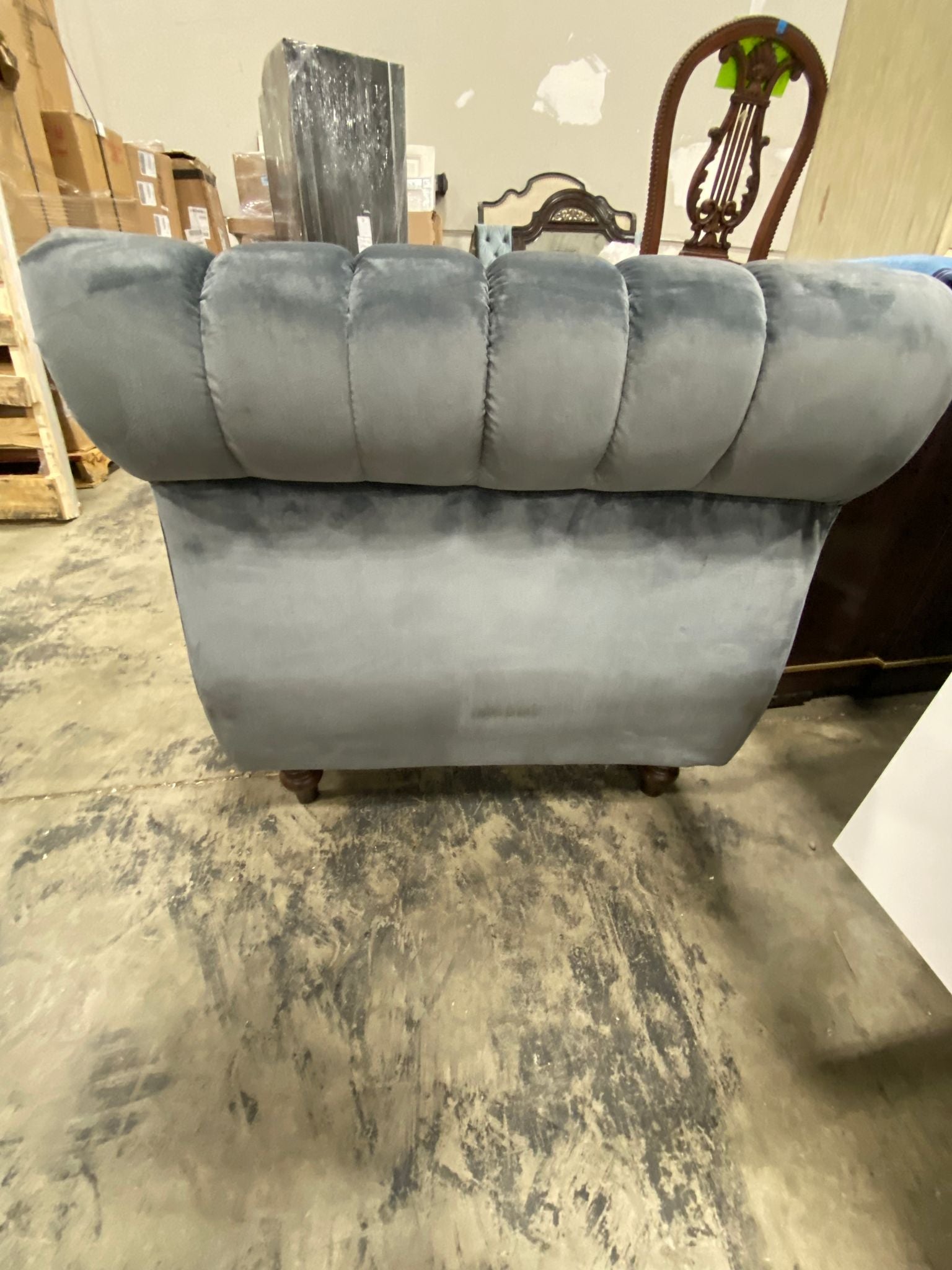 Out of box, The color is gray, Item has some imperfections in the velvet on back side/side panels/cushion seat of sofa. Side panels have some mild scuffing due to open shipment. See photos. Item in otherwise good condition.