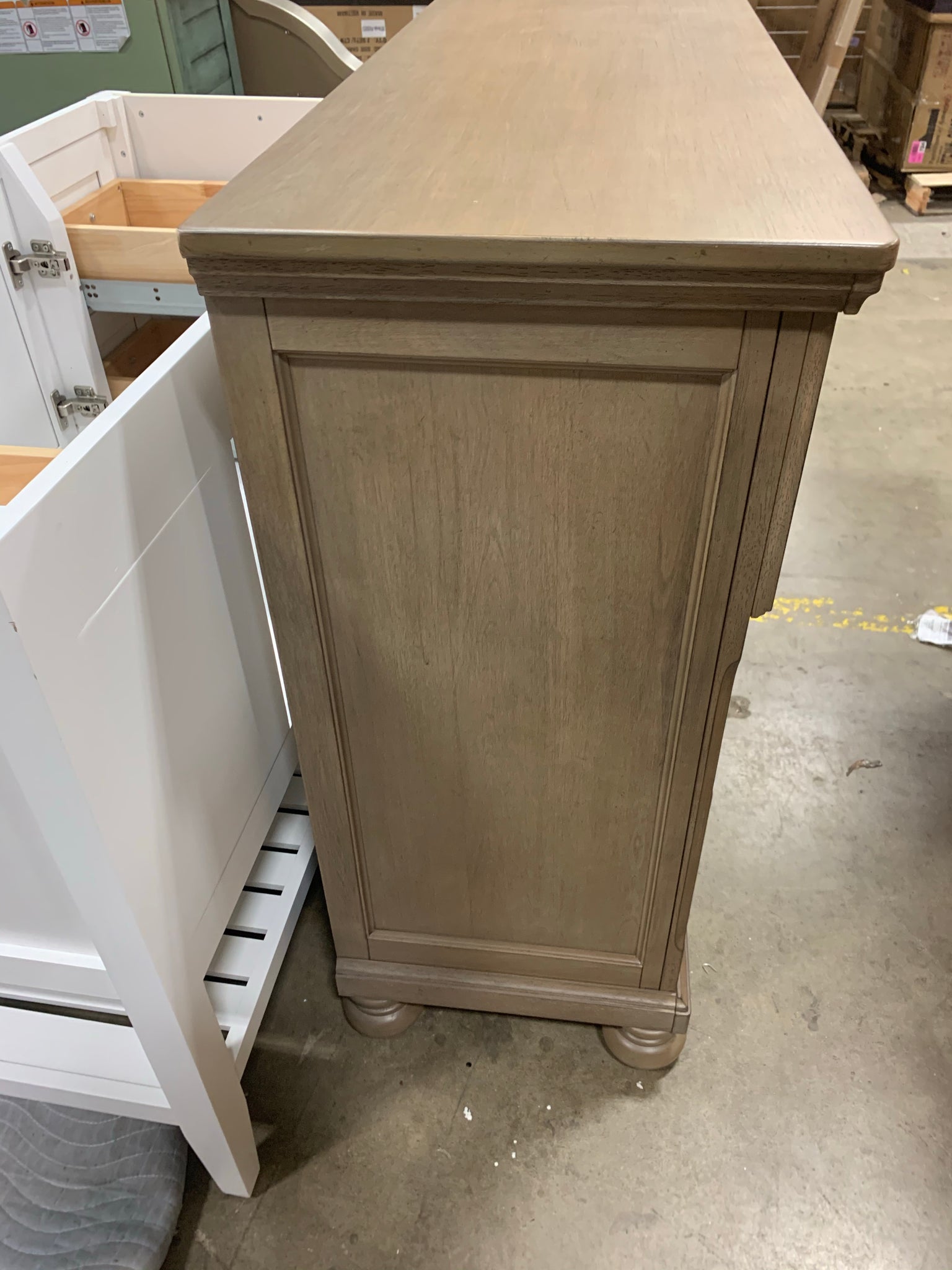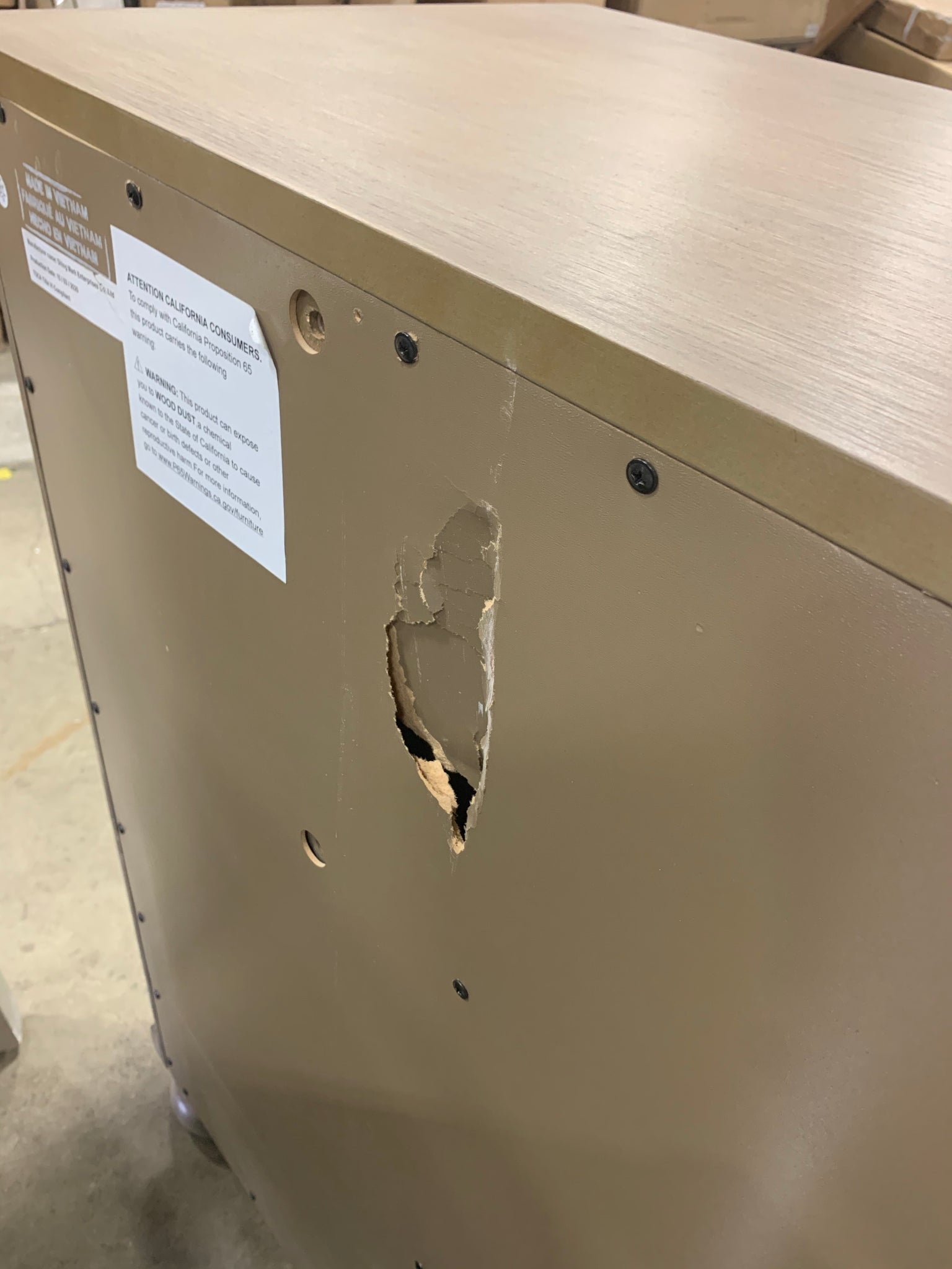 This item is in great out of box condition. There is a whole in the back but besides that this dresser is in excellent condition.