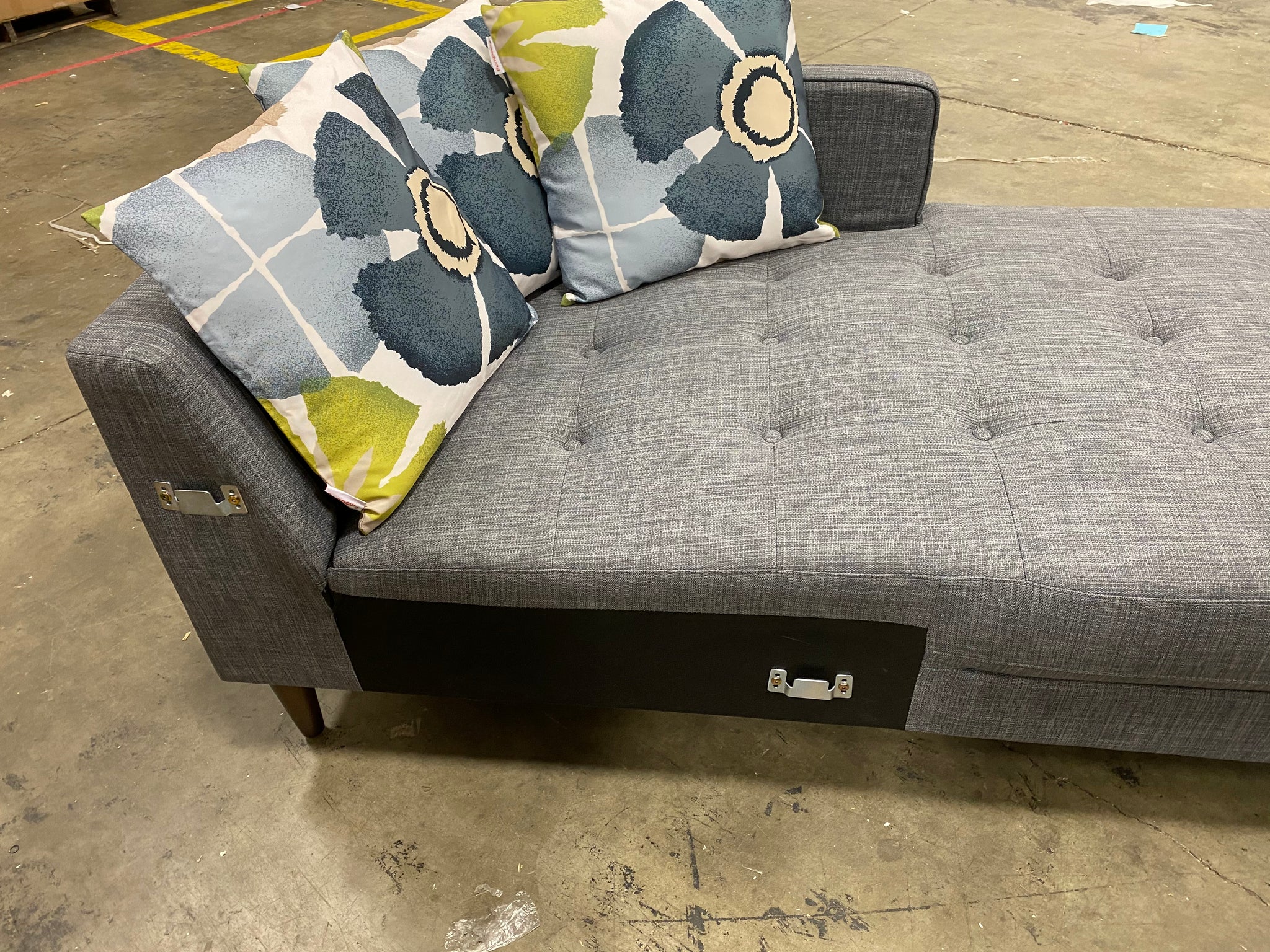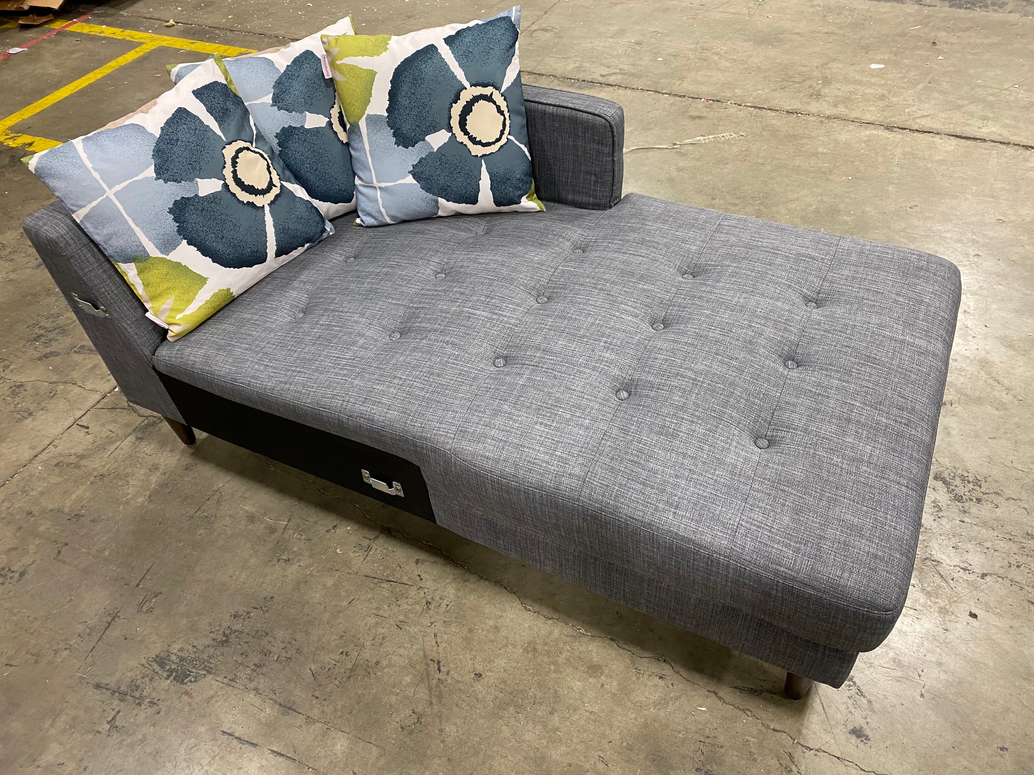 Out of box upholstered chaise lounge in Blue linen with 3 patterned indoor/outdoor throw pillows.