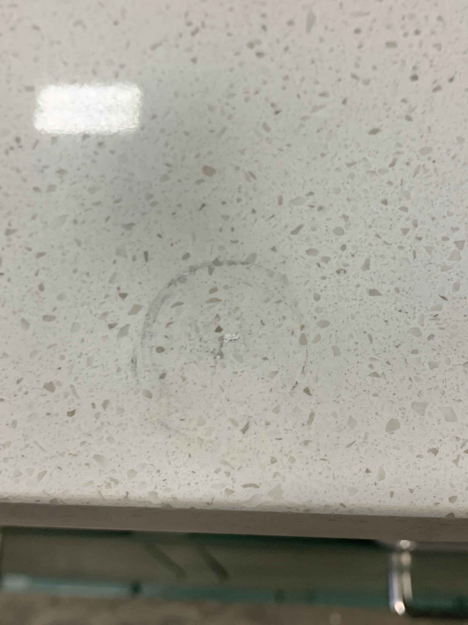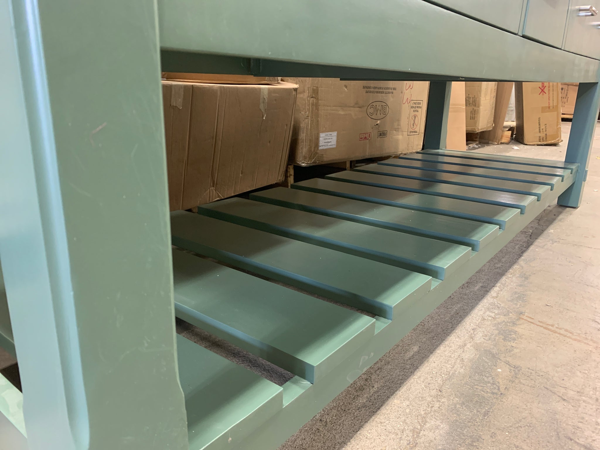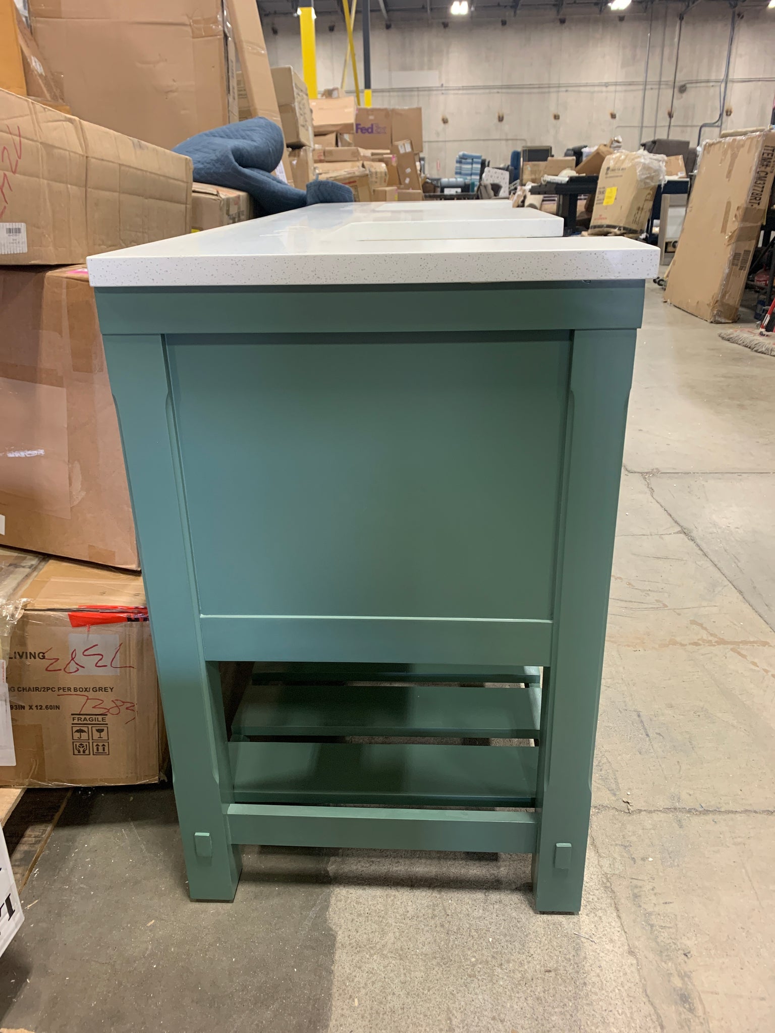 This is an out of box item! It is in great condition and the color is Sage Green! There also is a 4 inch backsplash that is included but is not attached so there is assembly required.