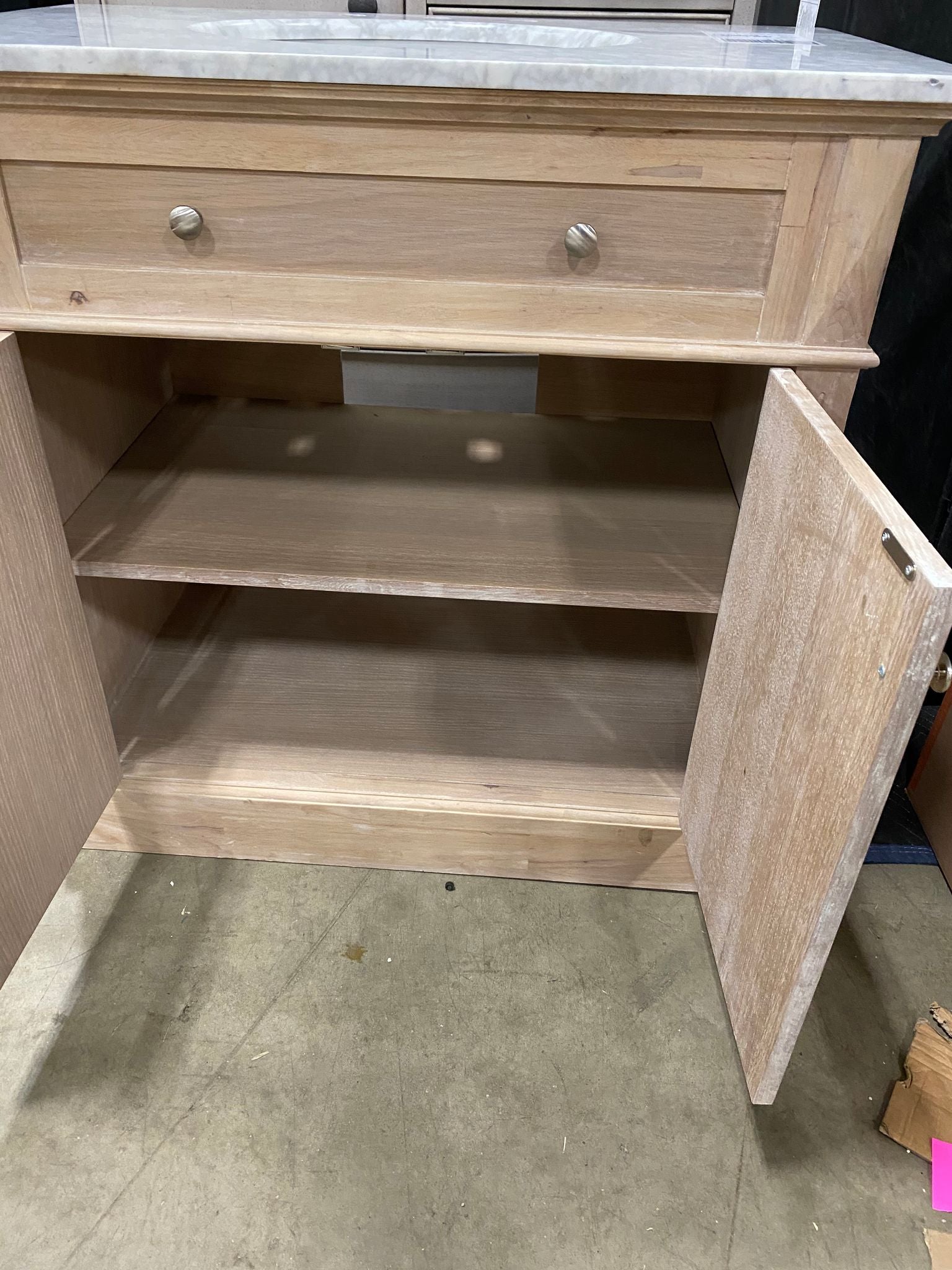 Out of box, Item has some slight scuffing/chip on back left corner/front right edge of marble sink top. Backsplash is not included. Item in otherwise very good condition.