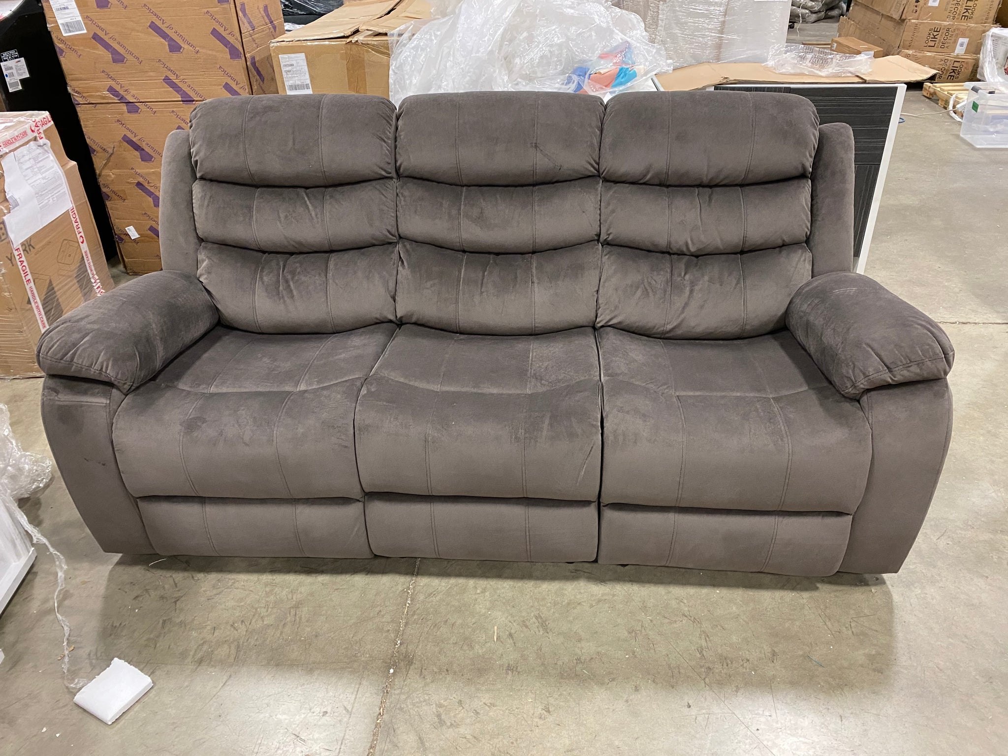 Out of box 3 seater sofa with 2 reclining ends in Cocoa Brown Microfiber. Item is lighter than stock photo. Assembled.