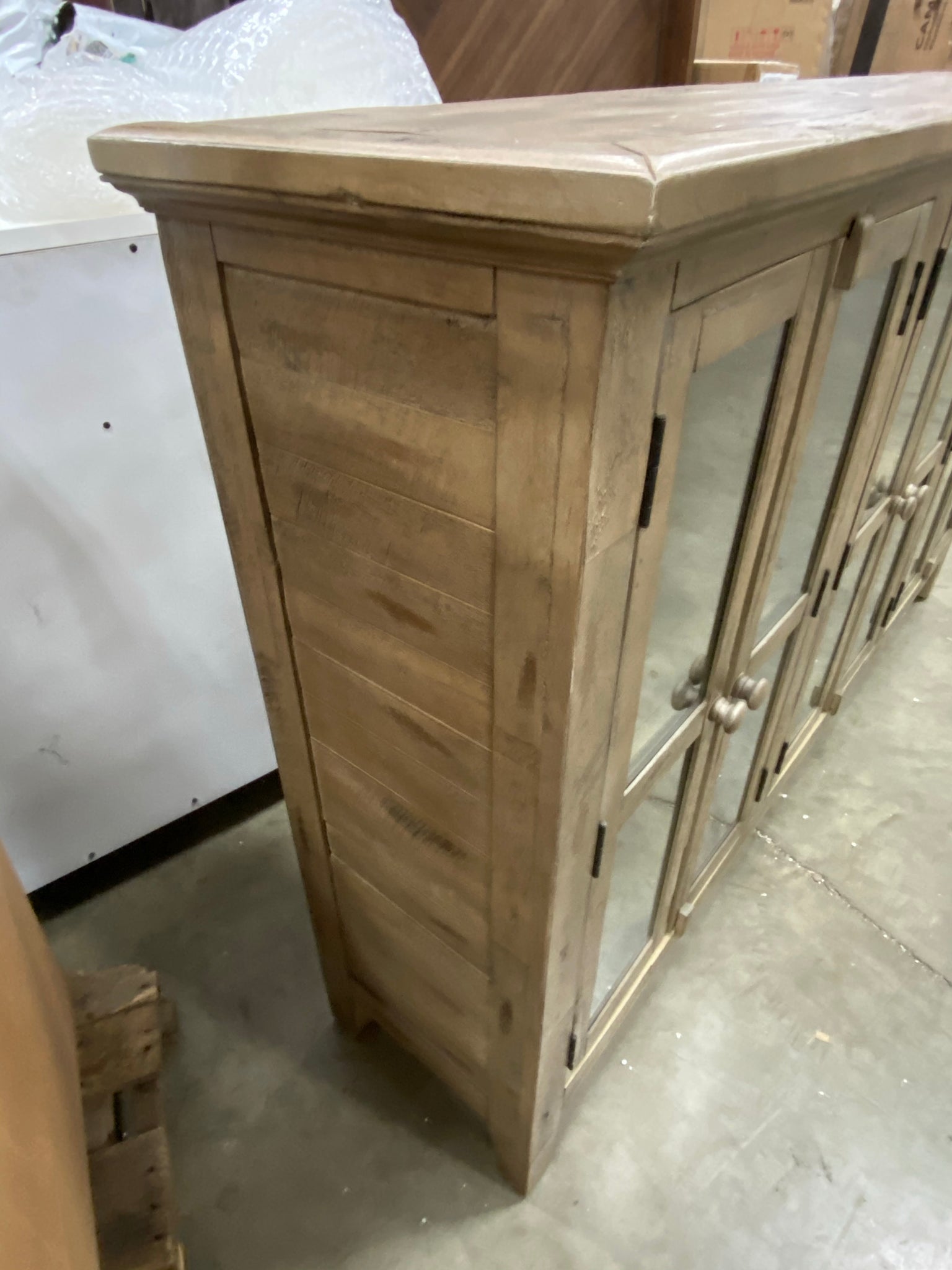 6 door glass front wooden sideboard in Weathered Gray. Item has light brown tone.
