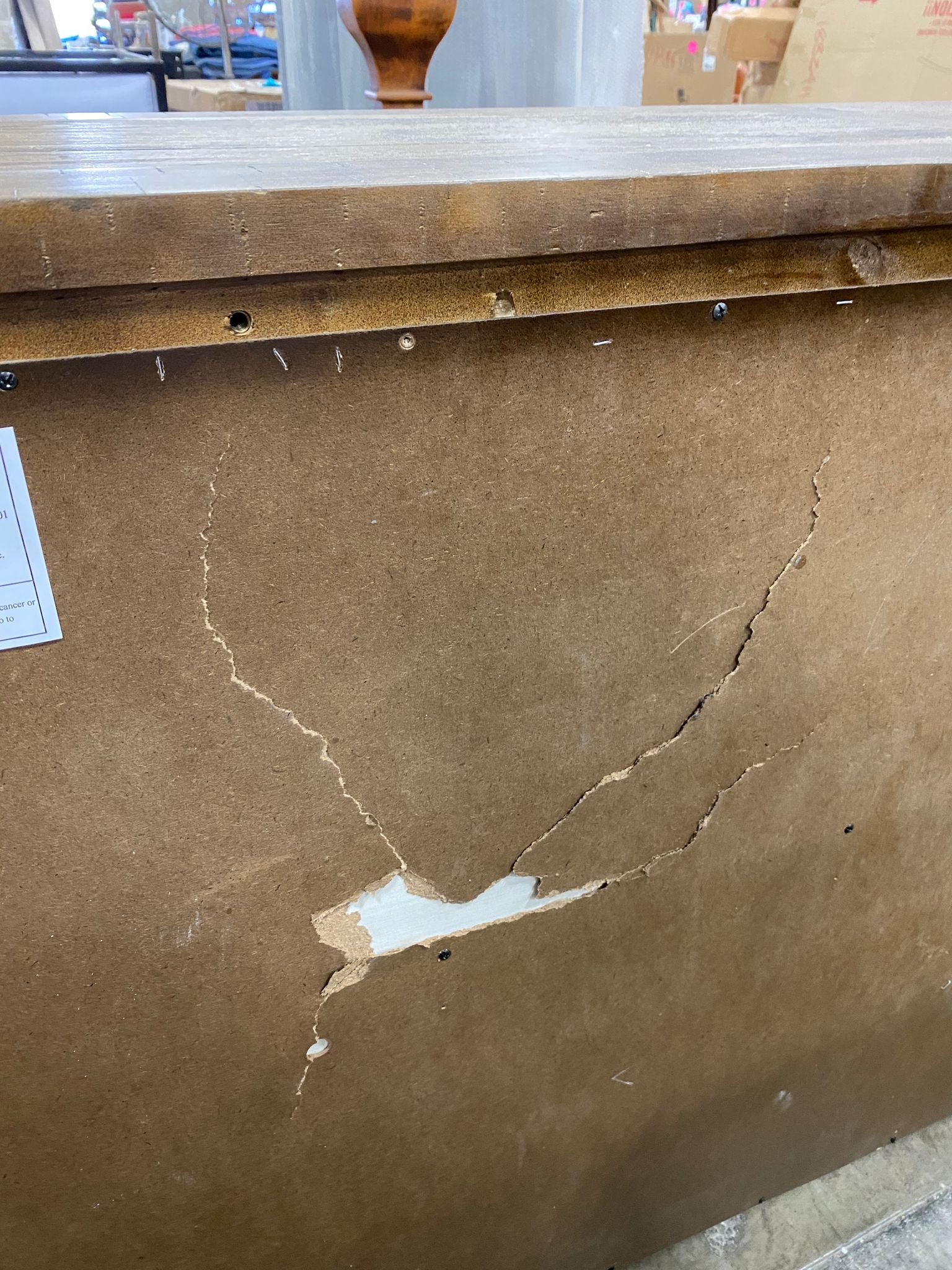 Out of box, Item has some damage on back (repaired) due to shipment. Small chipped area on front left corner edge. Item in otherwise good condition.