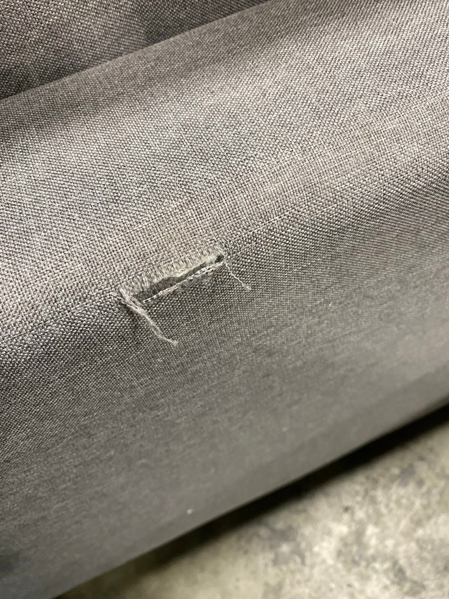Square arm sofa with bolster pillows in Gray. Small tear on back of sofa. See photo. Item in otherwise great condition.