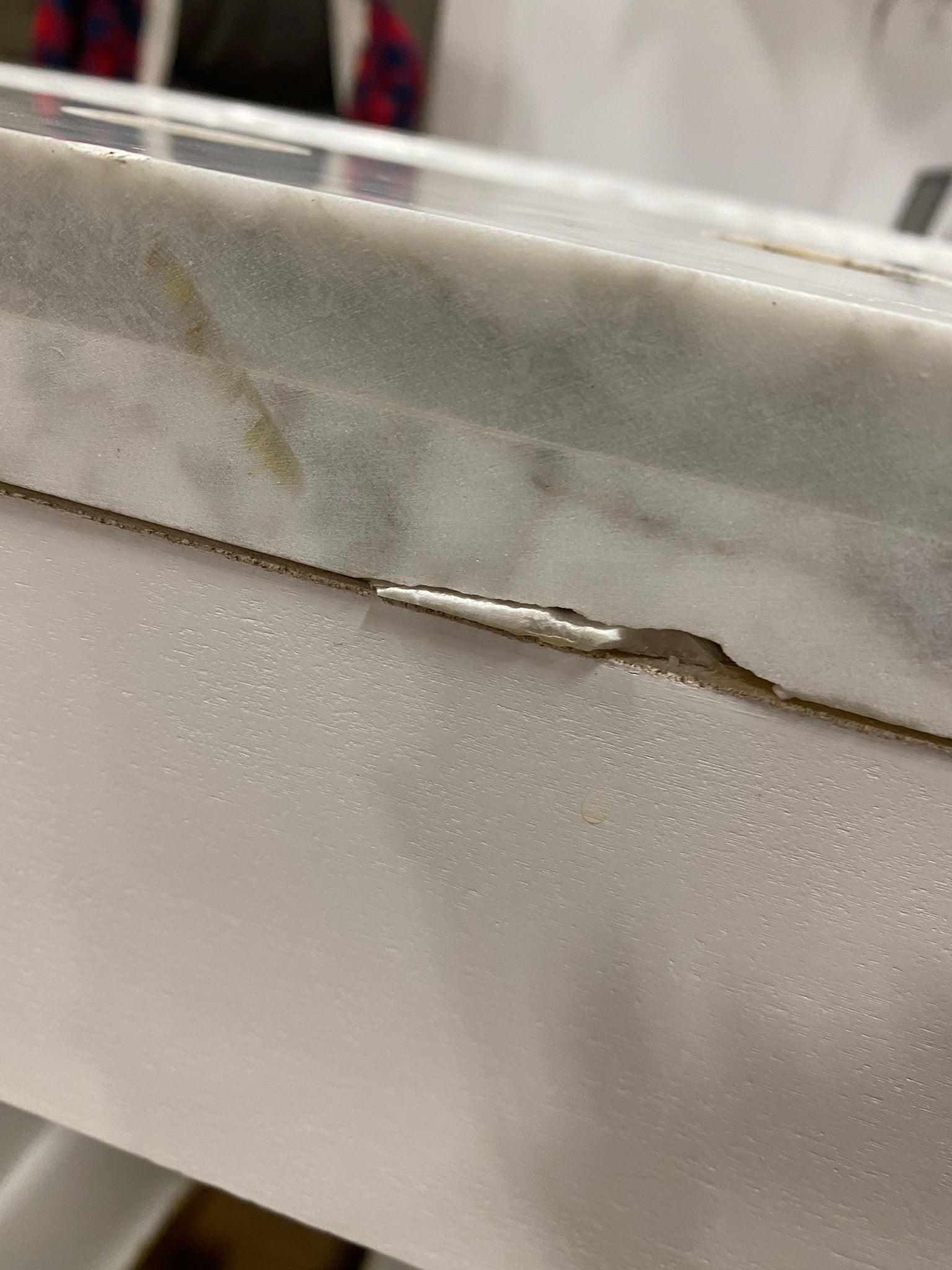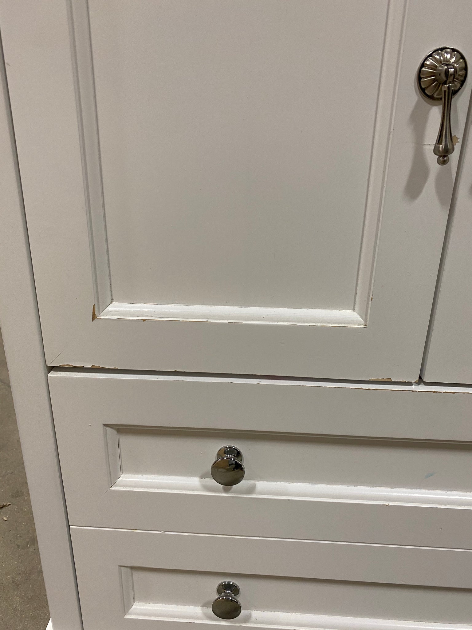 AS IS Condition: Pre installed. sink has hairline crack; chips/scuffs along edges throughout. 2 drawer knobs missing. Inside shelf and drawer cut for installation prep; hairline crack on top corner edge of base. No backplash included.Final sale. Item non returnable.