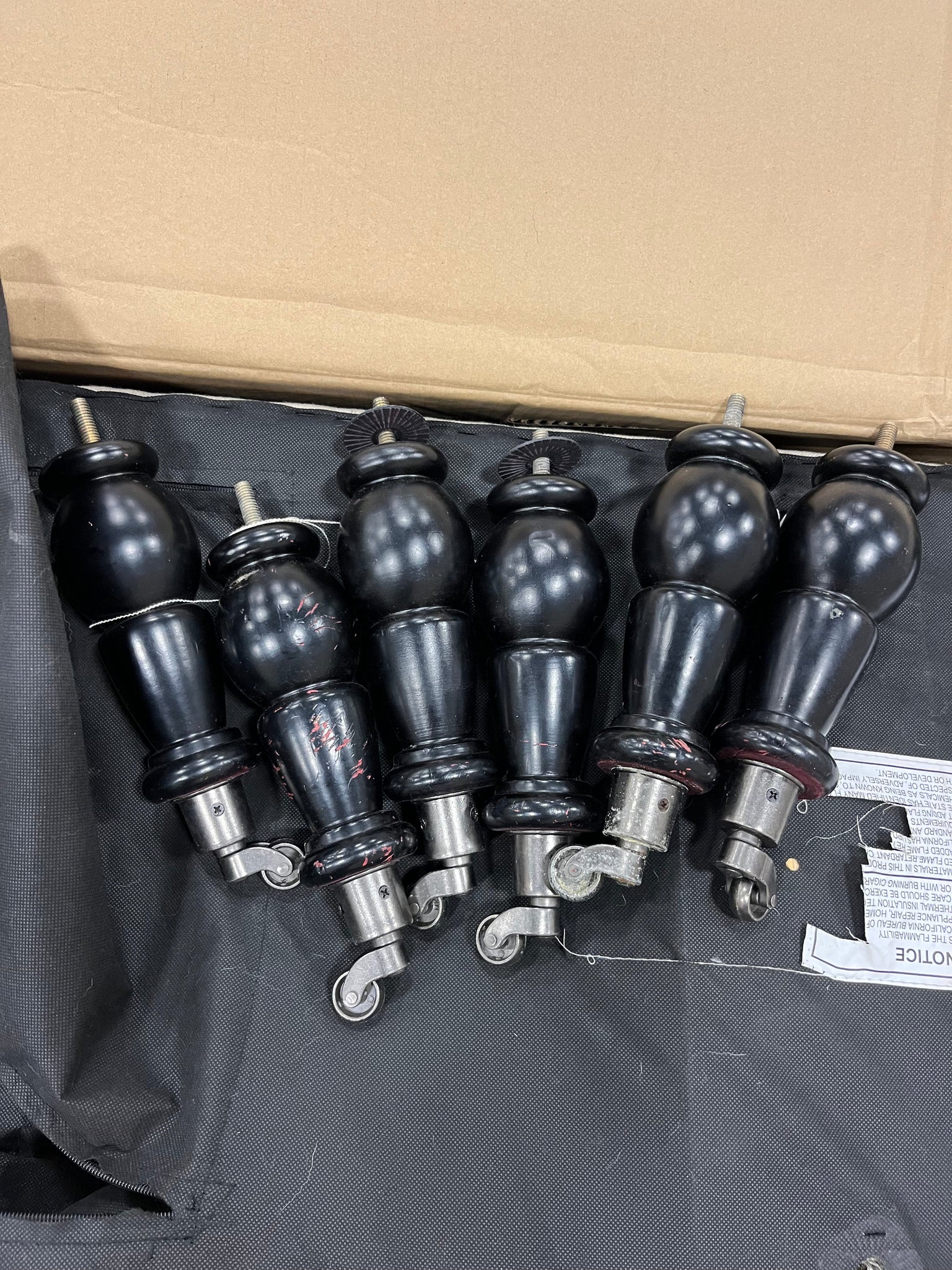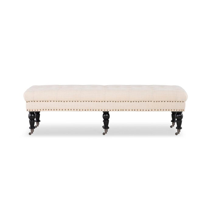 Note: Bench shows signs of heavy use. Legs heavily gashed and wheels need oil and cleaning. Great re-covering project. See in house photos for details.