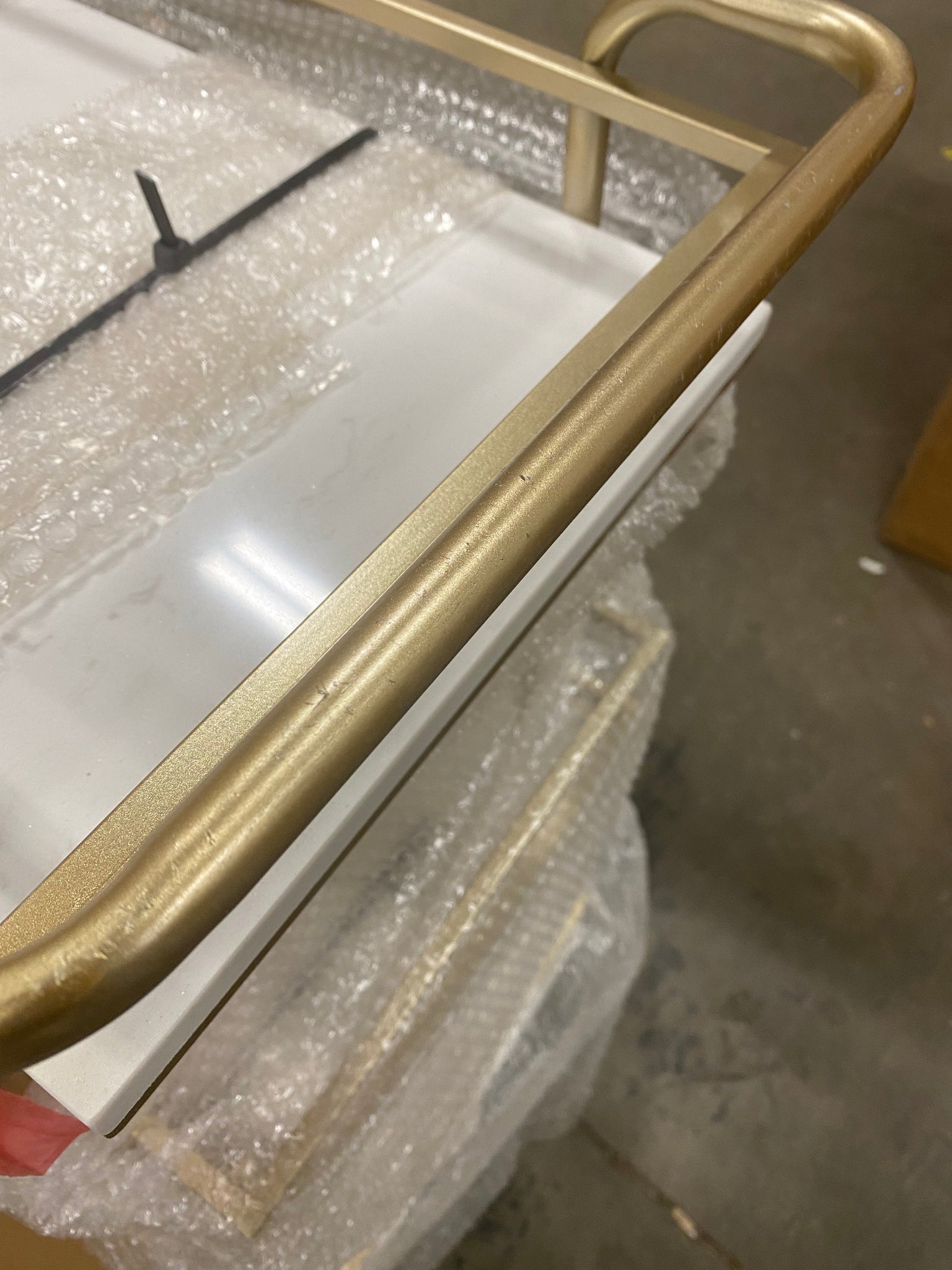 Note: Center glass shelf MISSING; Slightly bent foot. Scuffs/scratches on handles. See photos.