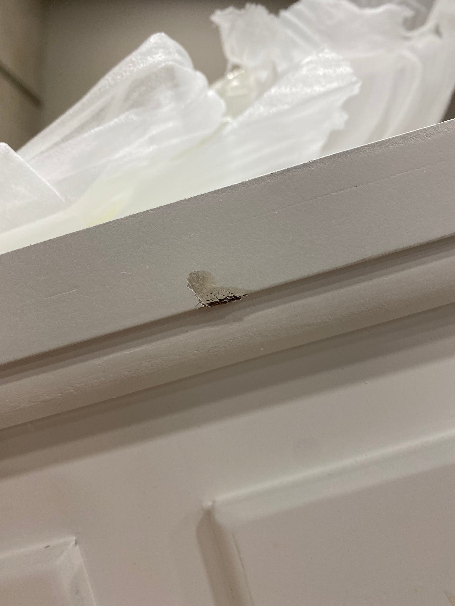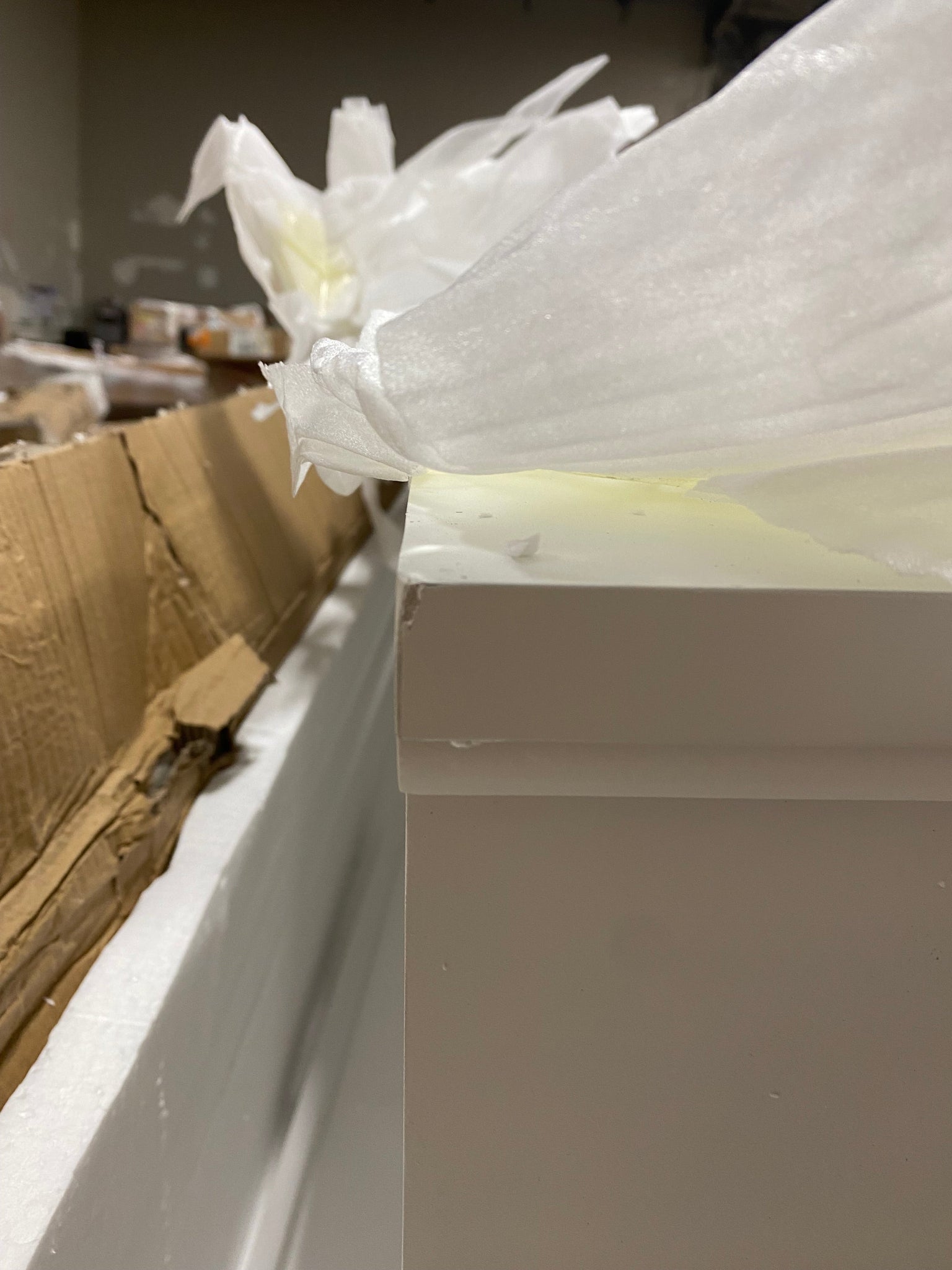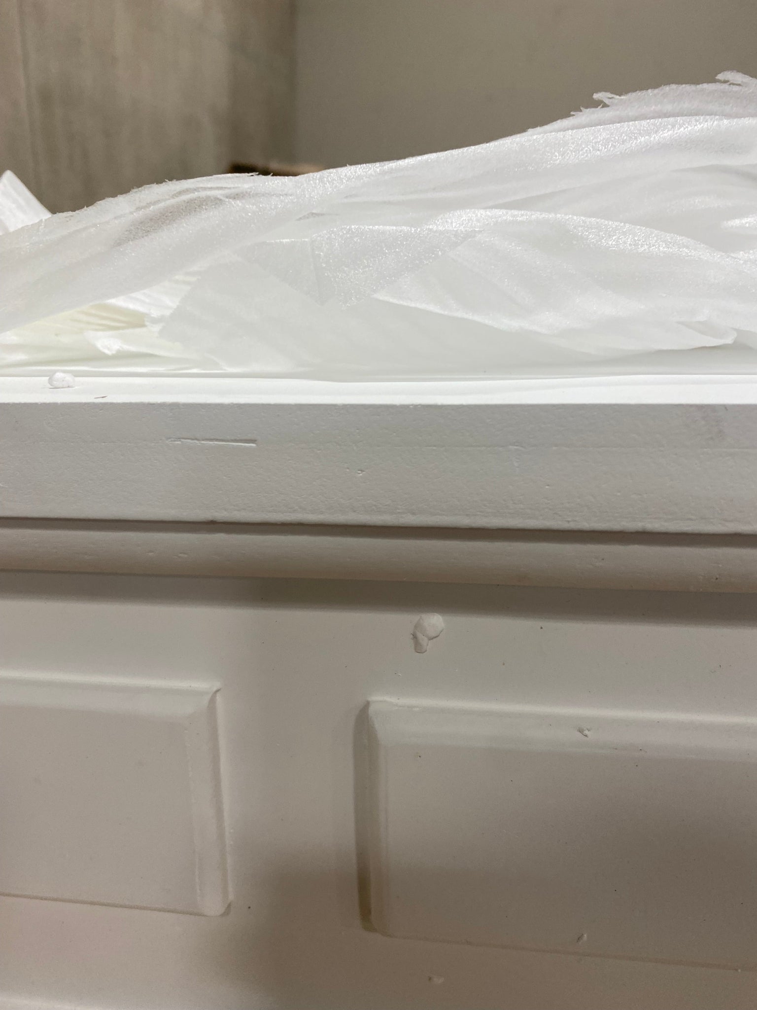 Note: AS IS Condition: The item is damaged in the front left corner. Small dents/imperfections throughout the front of the top mantelpiece. Spotting on the mantel top. See photos.
