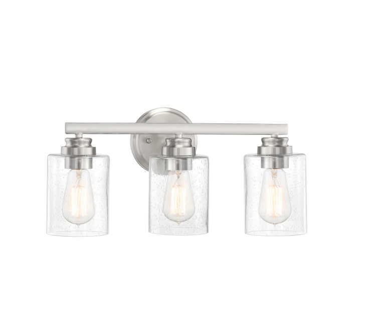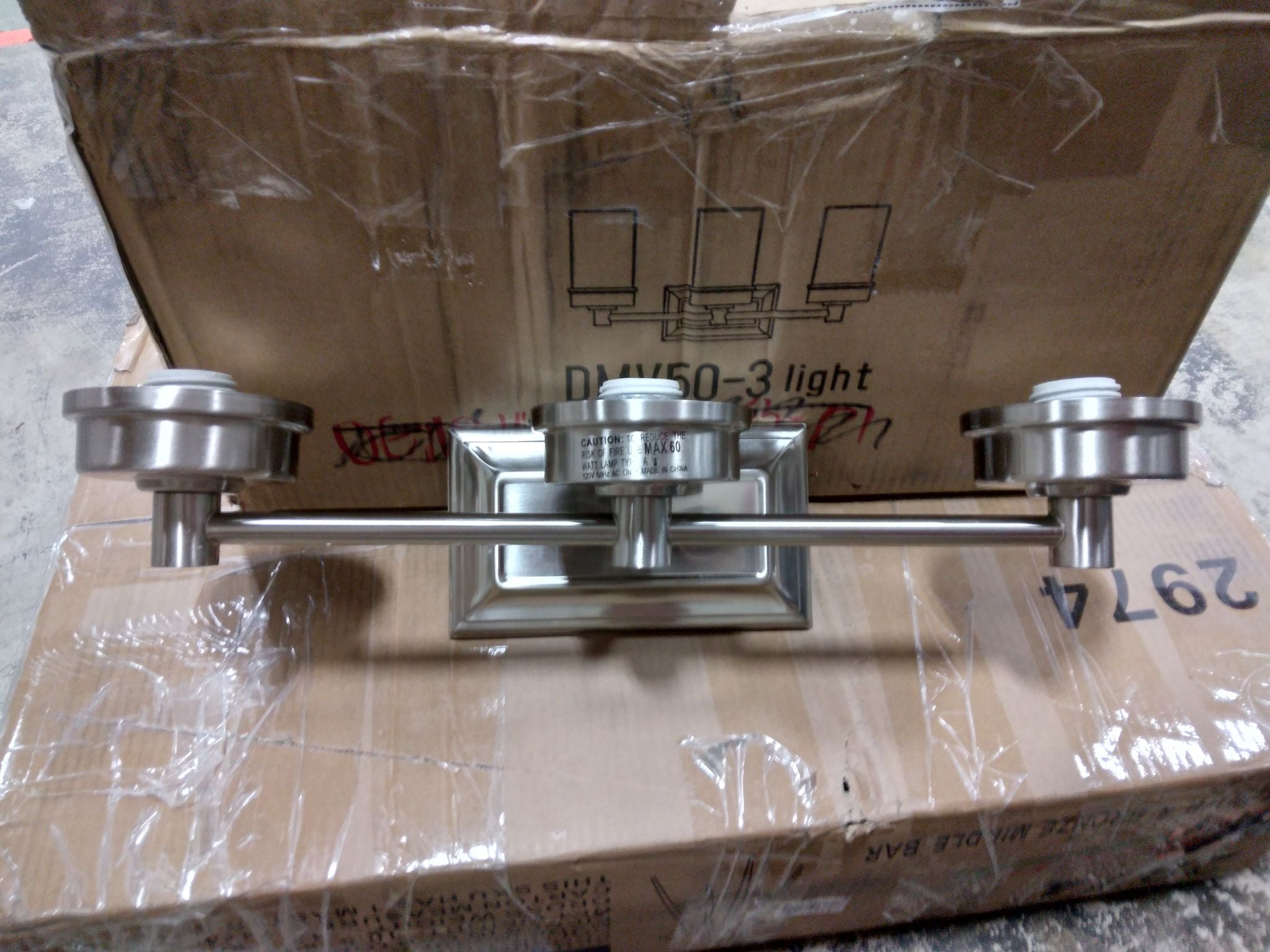 Open Box, The color is brushed polished nickel , Size: 3 light, Previously opened. This light has a slightly different wall piece. It is a rectangle instead of a circle. See for photo.
