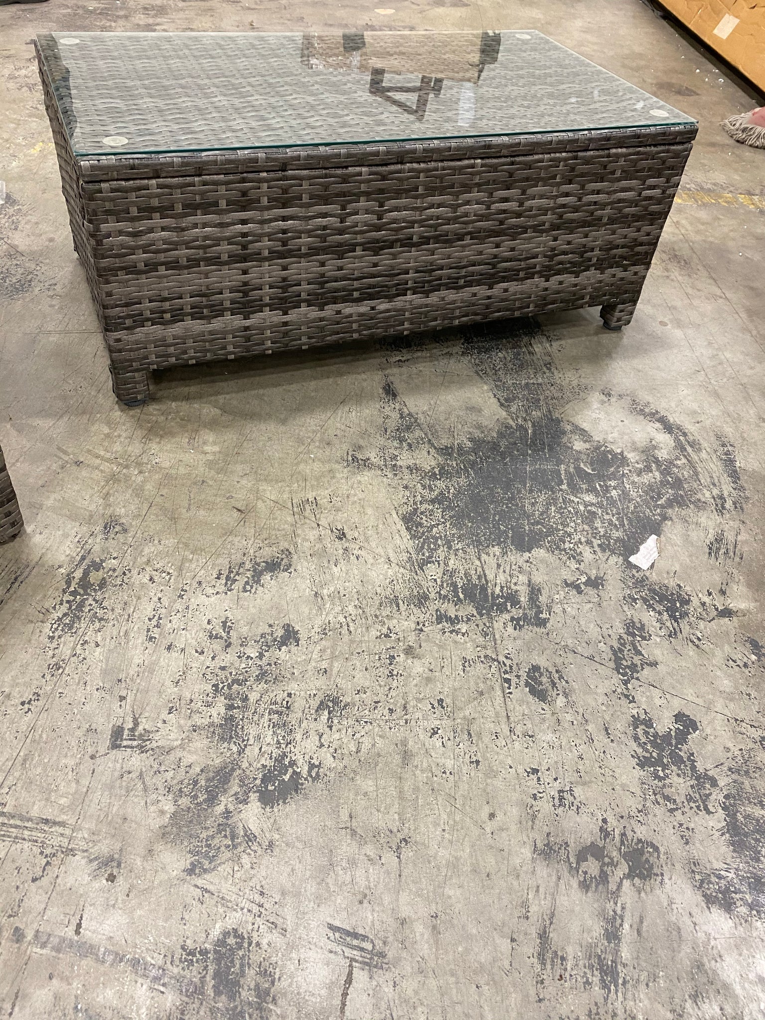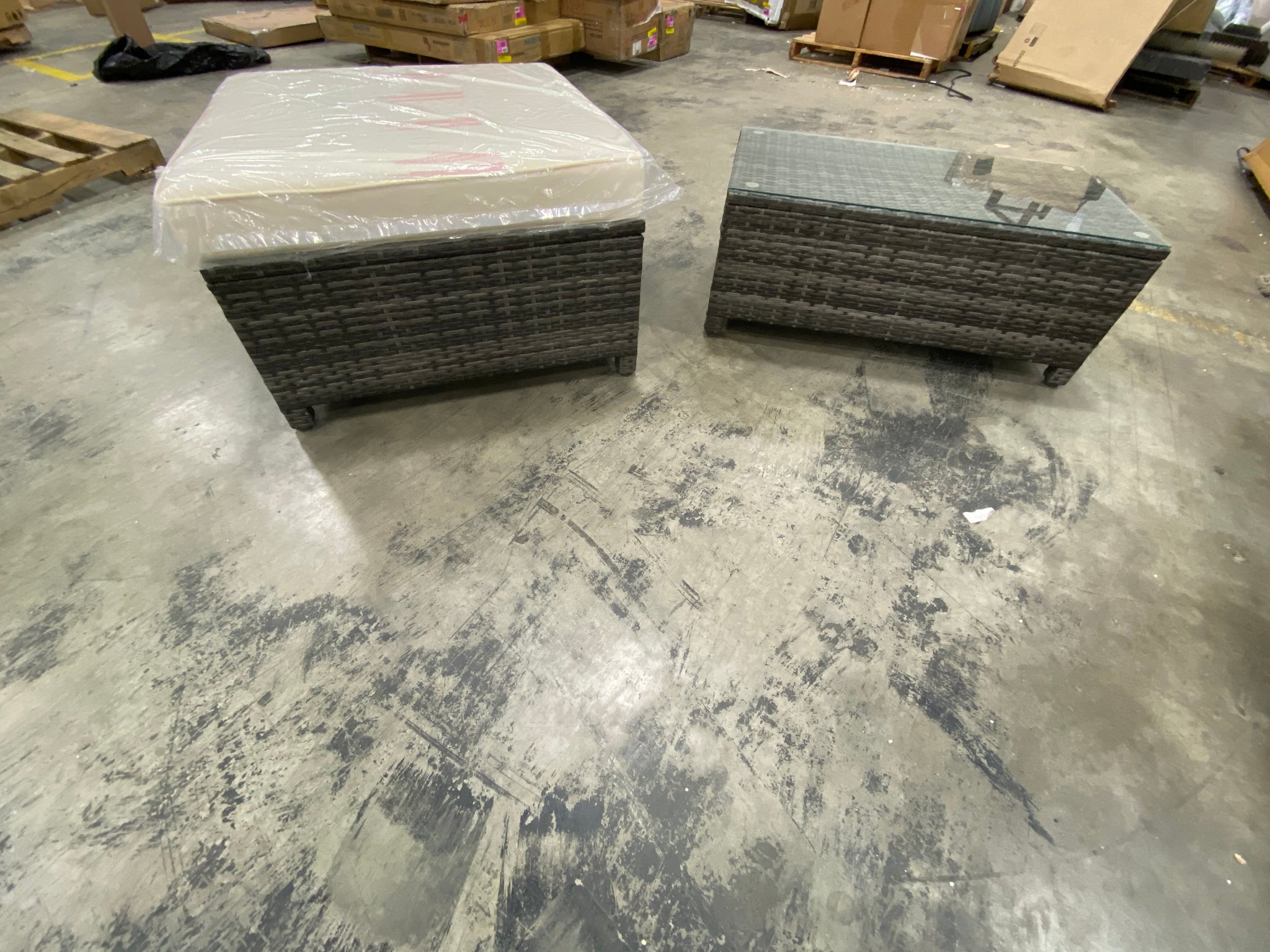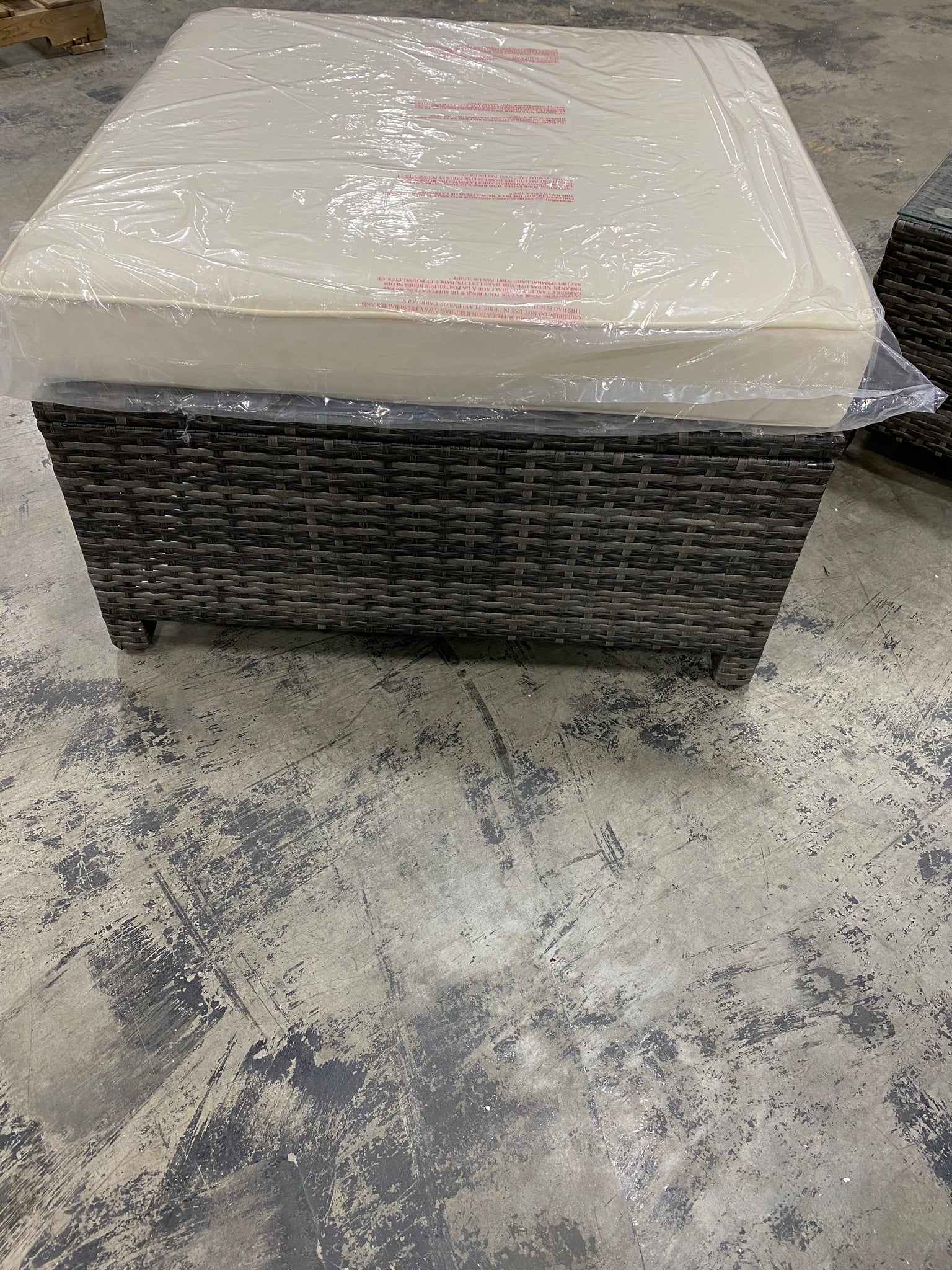 Out of box square ottoman in Grey with Beige cushion. Coffee table with clear glass top.