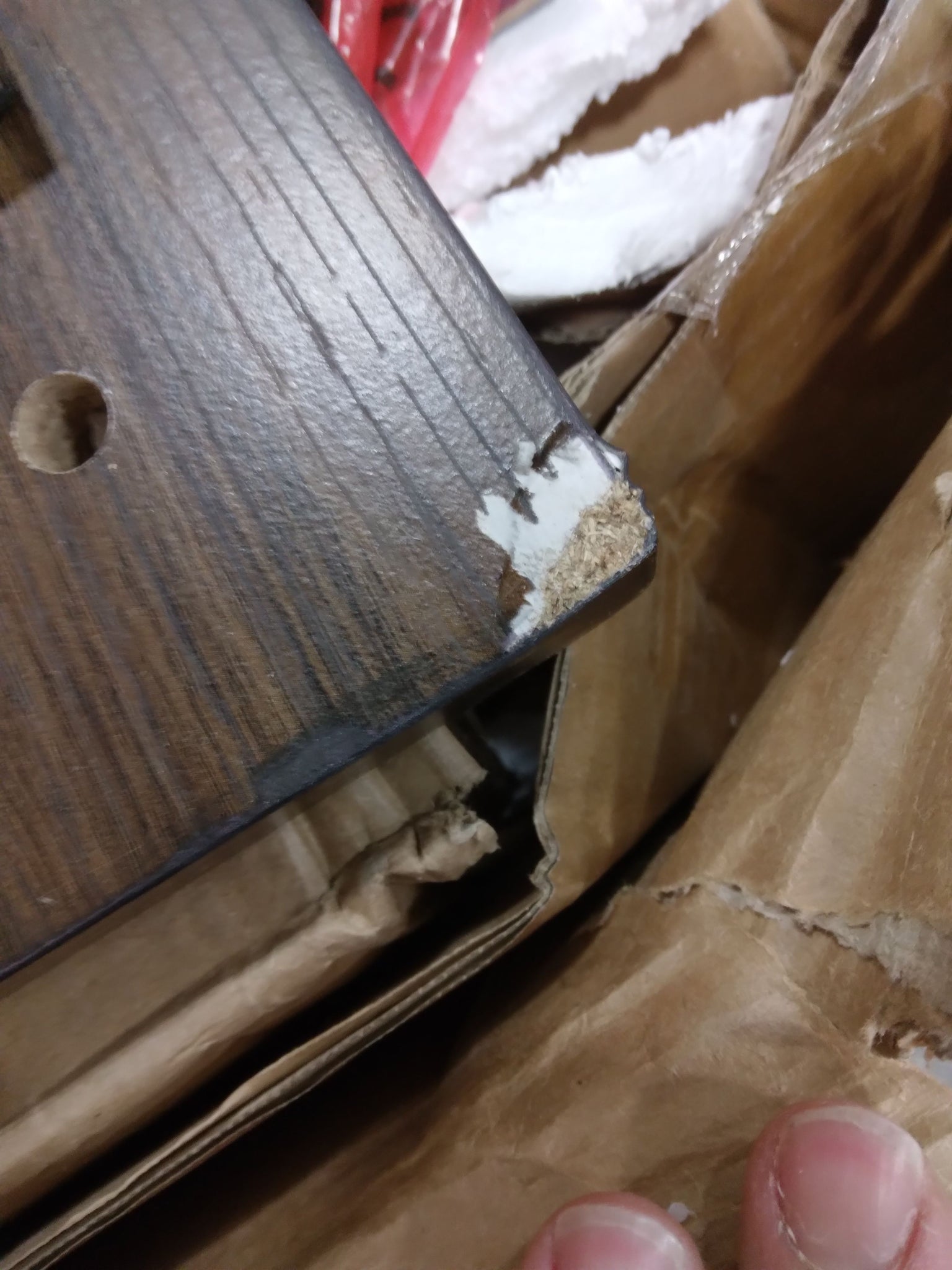 Open Box, The color is dark walnut, Previously opened. There is a chip on one corner piece. See for photo.