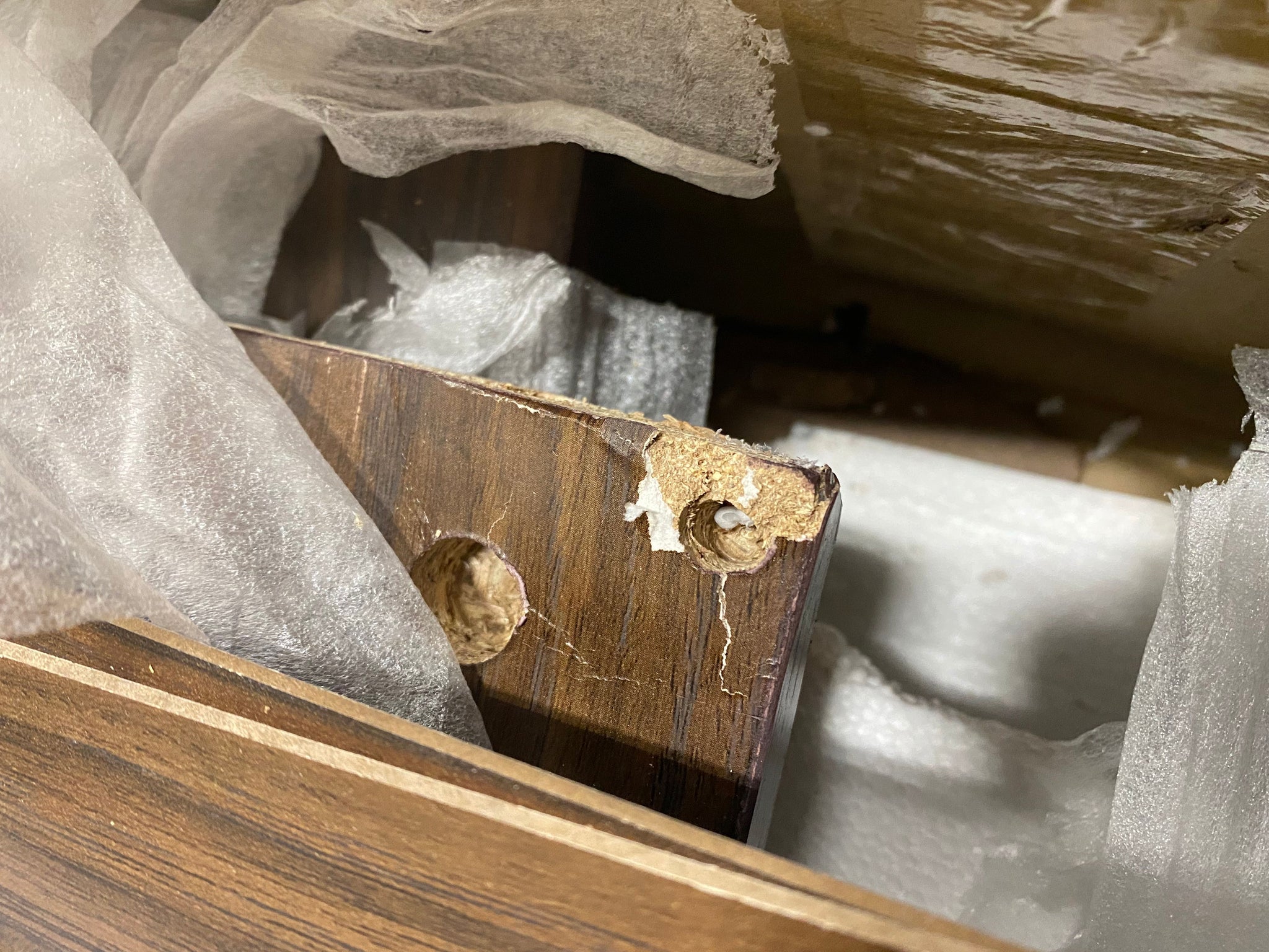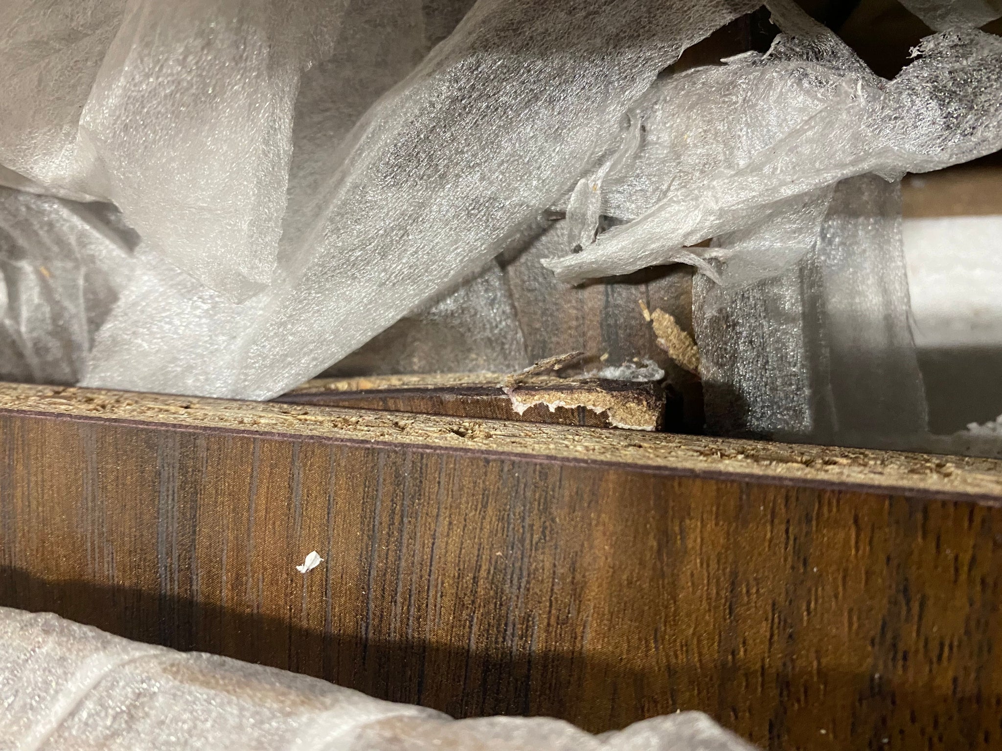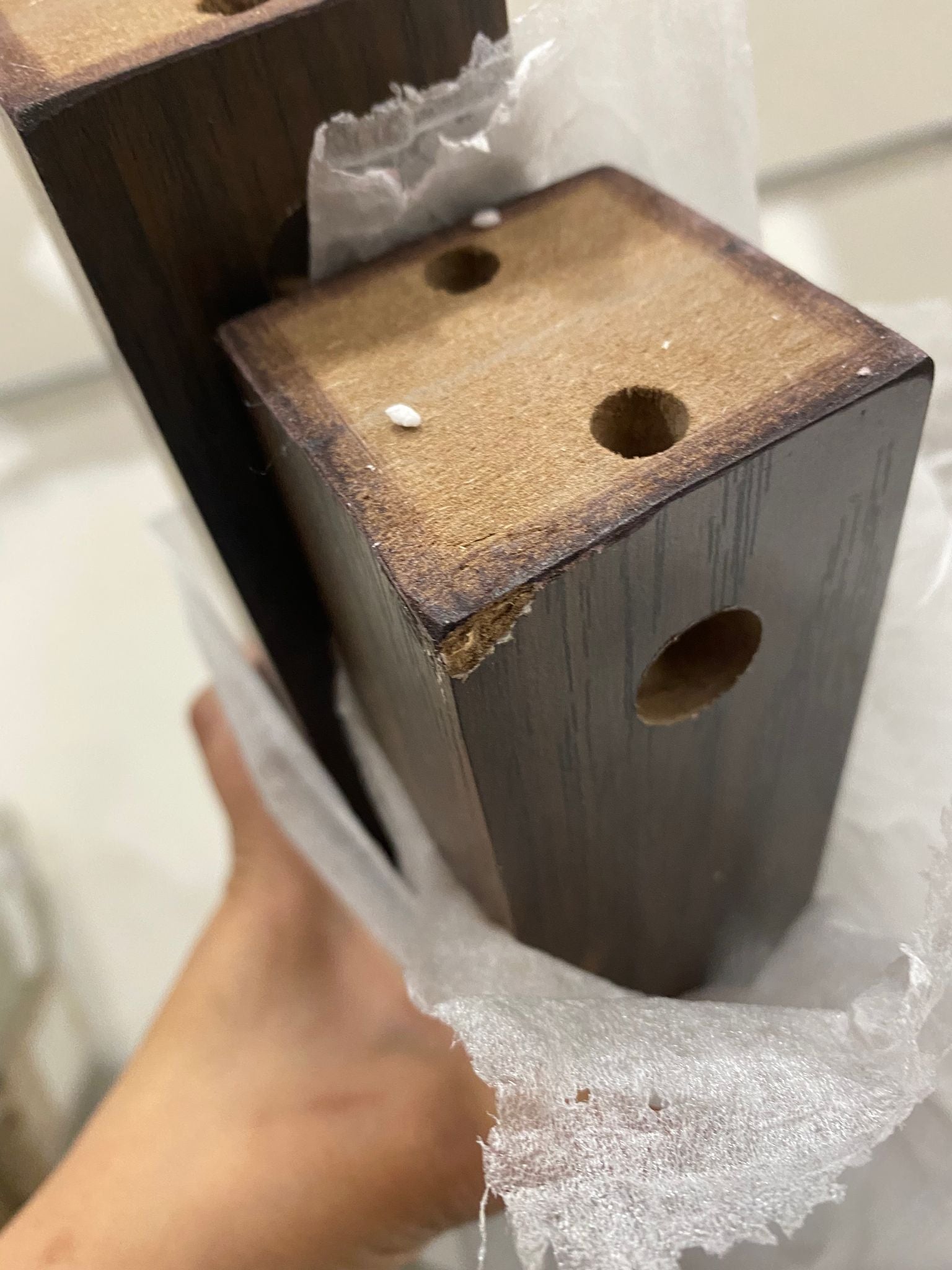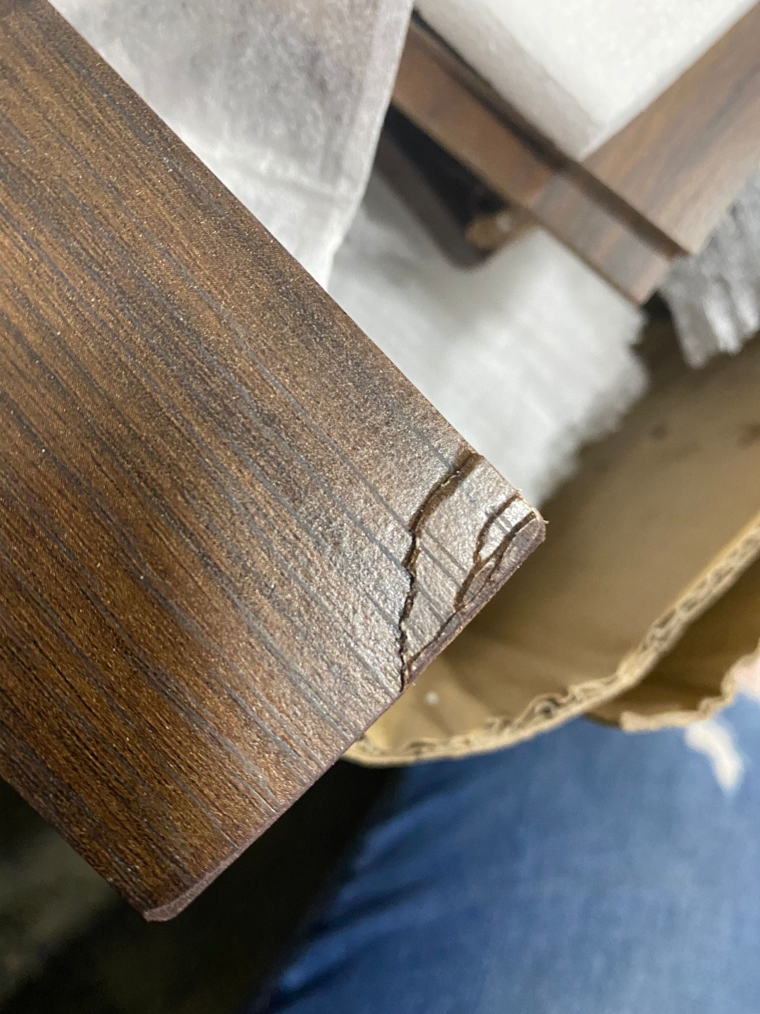 Open Box, The color is dark walnut, Please Note: Item has some damage on corners some boards/legs. See photos.