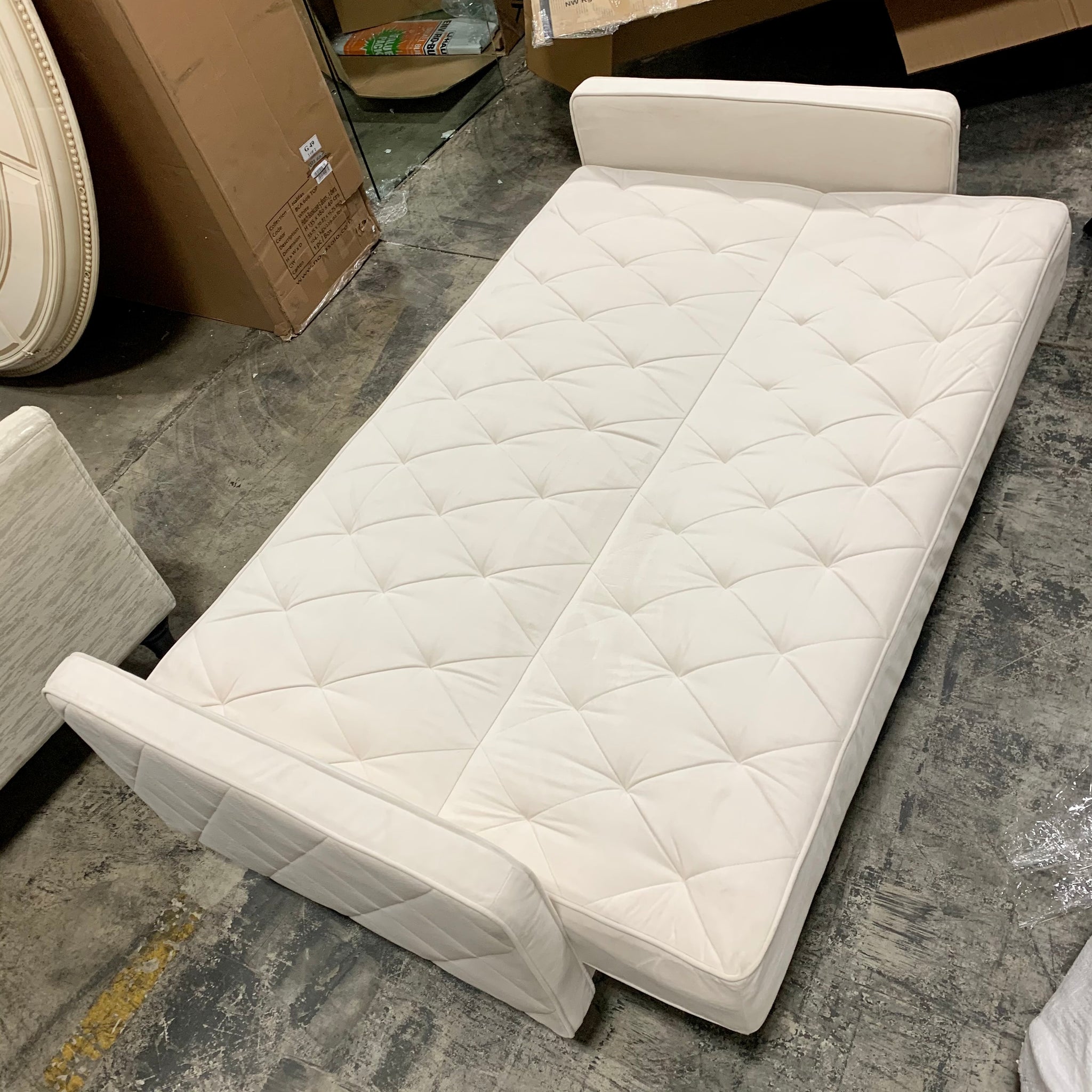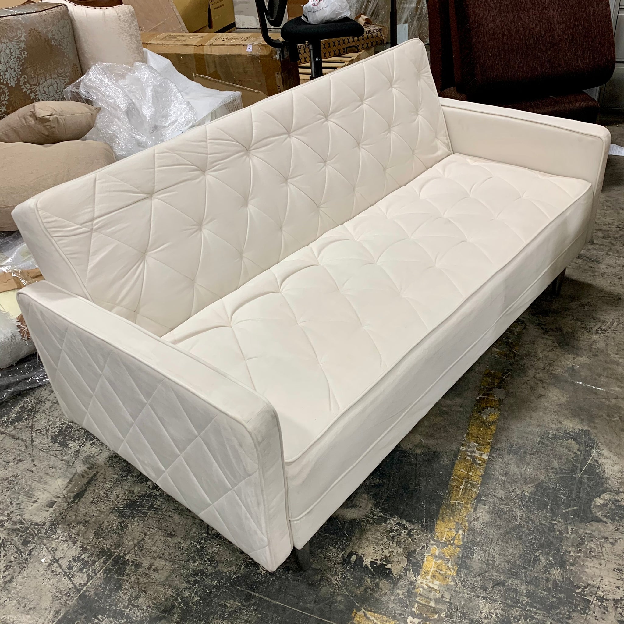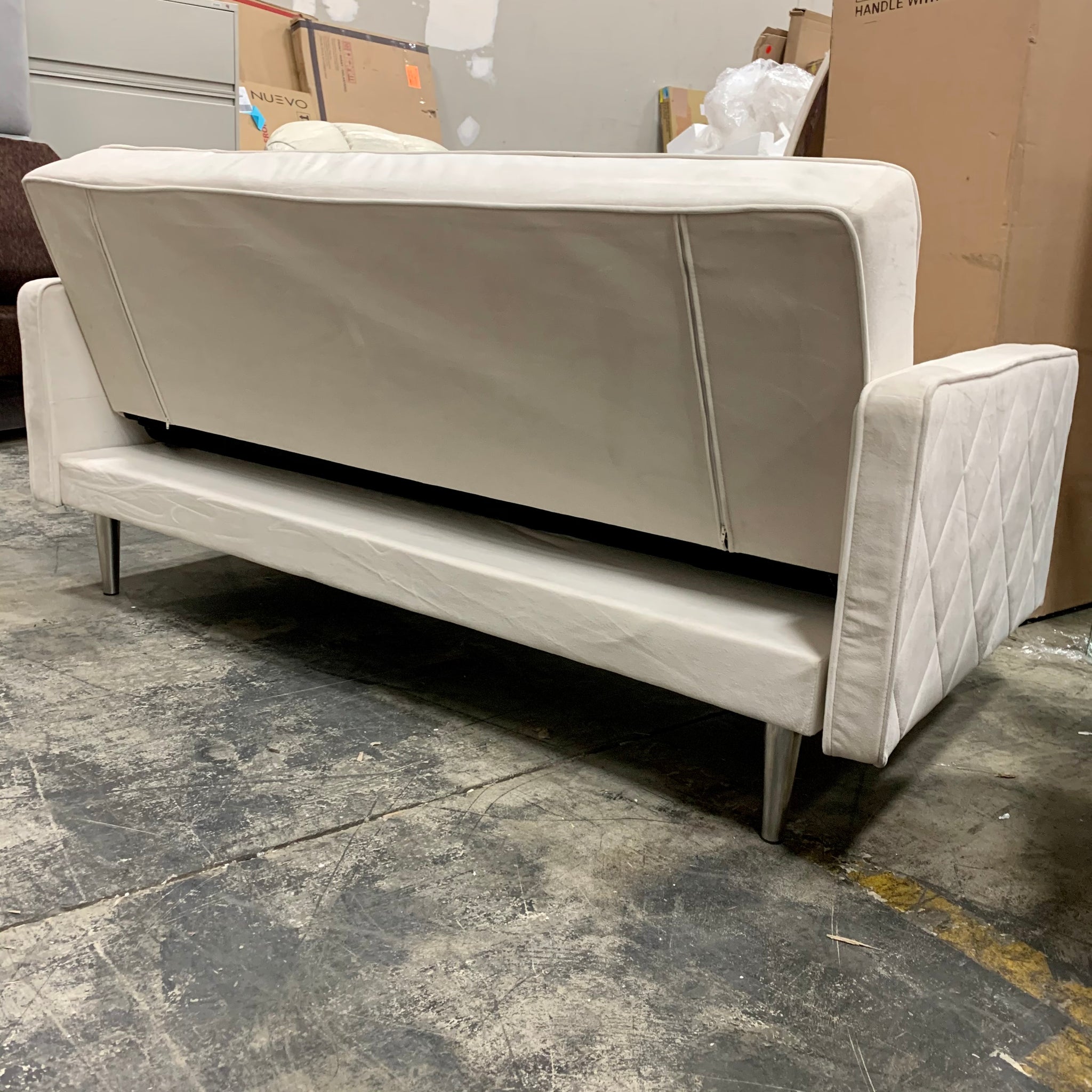 Fully assembled convertible square arm loveseat upholstered in pearl velvet/polyester fabric with metal legs in a chrome finish. This loveseat manually reclines into a twin size sleeper. Item has a few minor cosmetic. blemishes due to open shipment but otherwise appears to be in great condition.