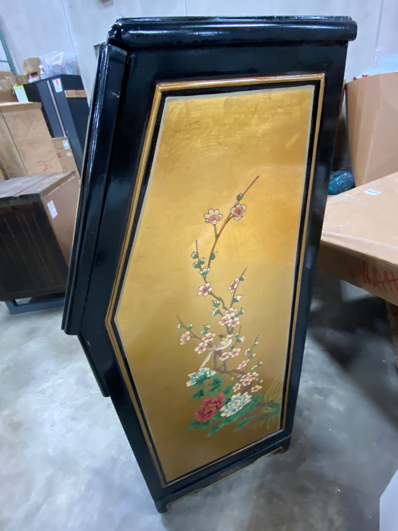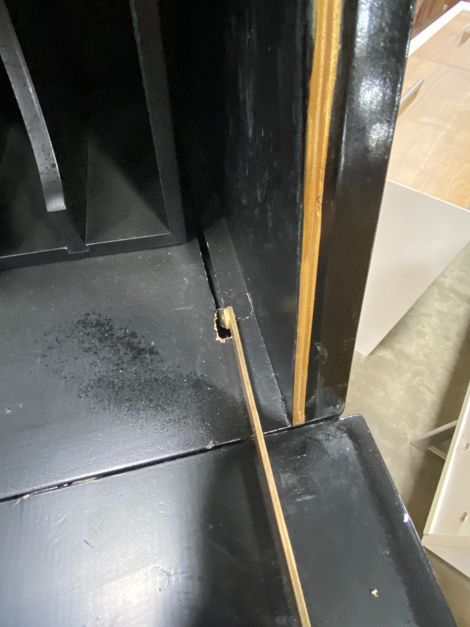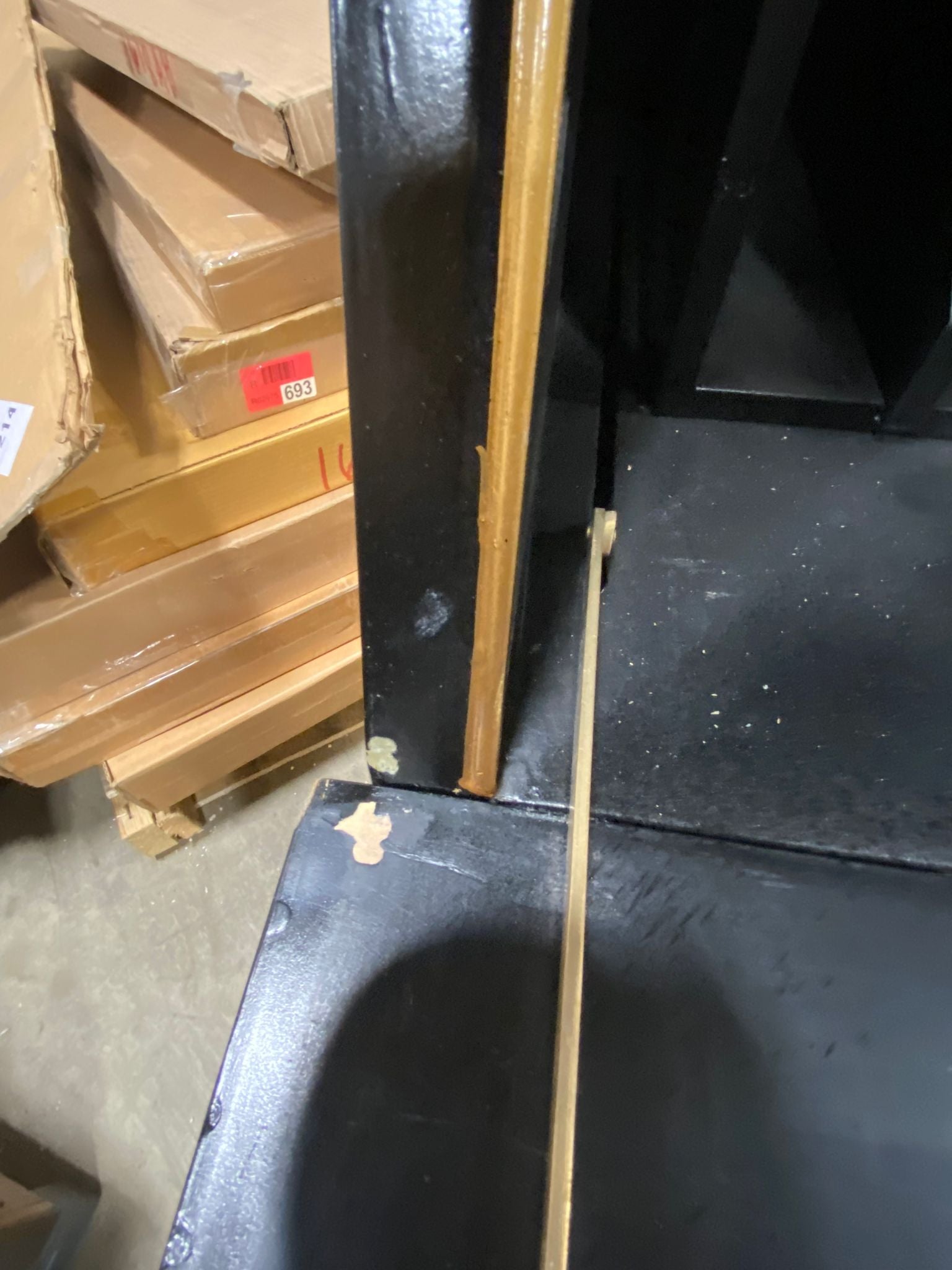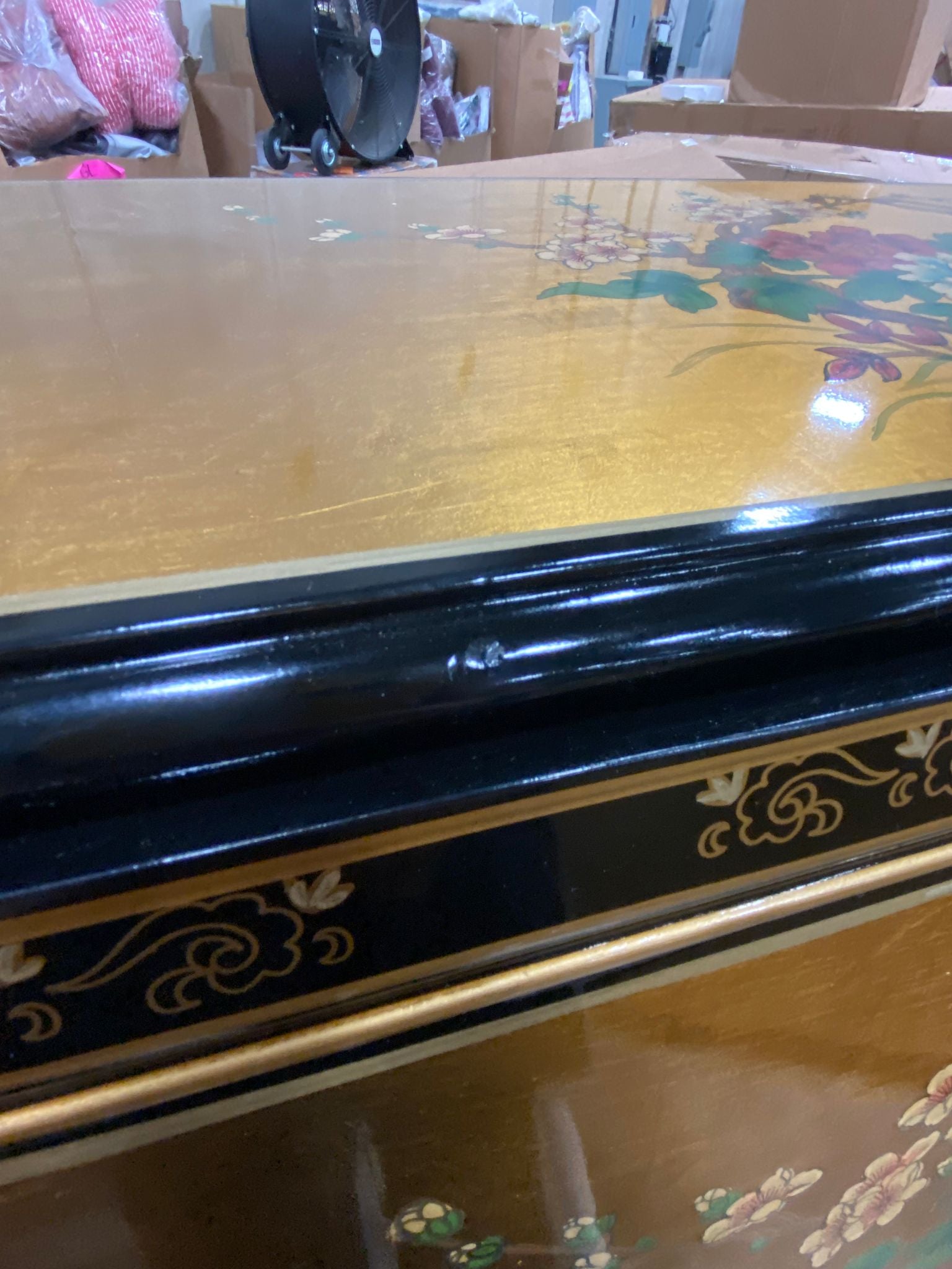 Out of the box, Item has slight dings on edges throughout due to shipment. Small chipped areas on inside of desk lid/near hinge. Item in otherwise good condition.