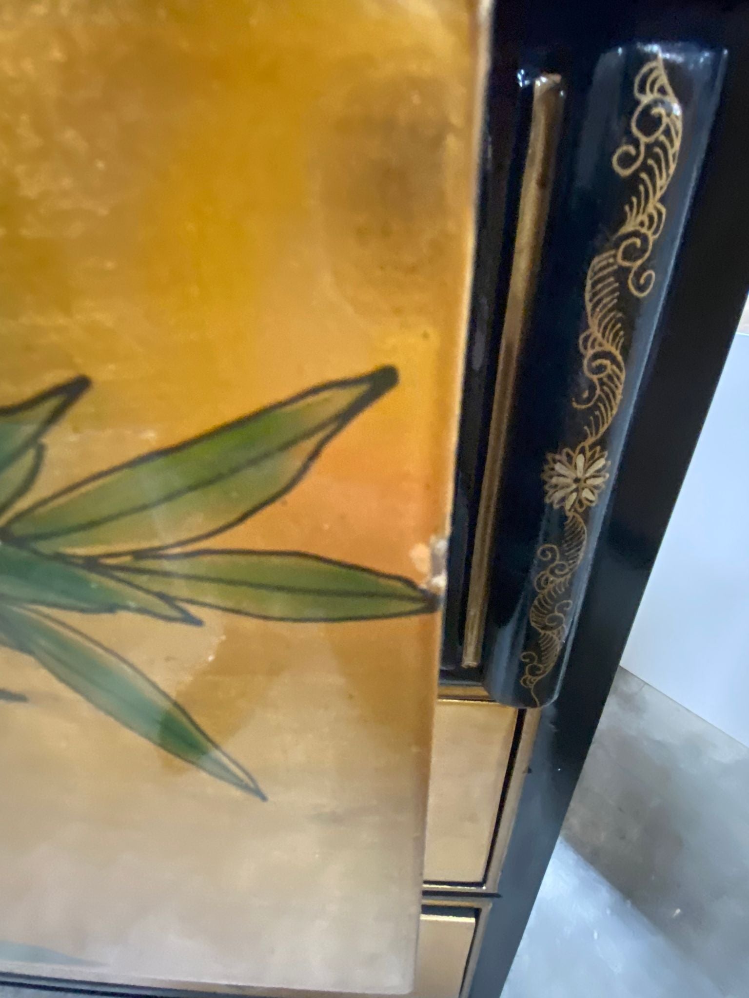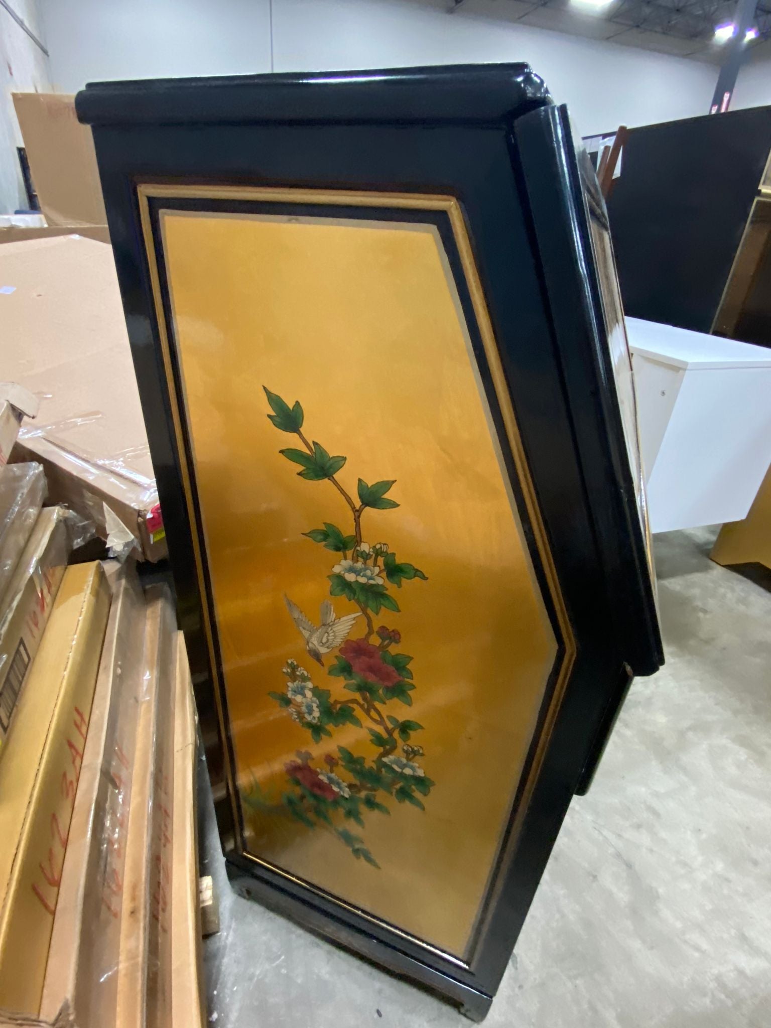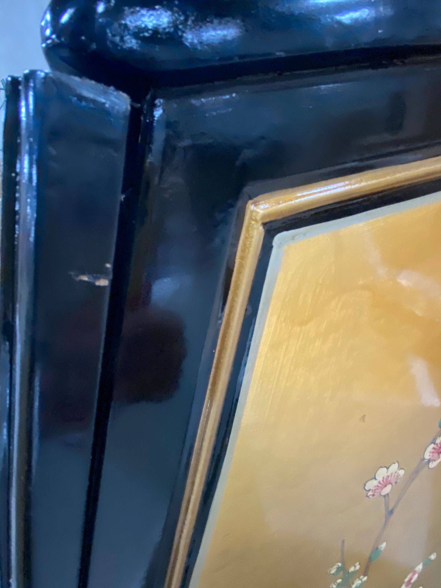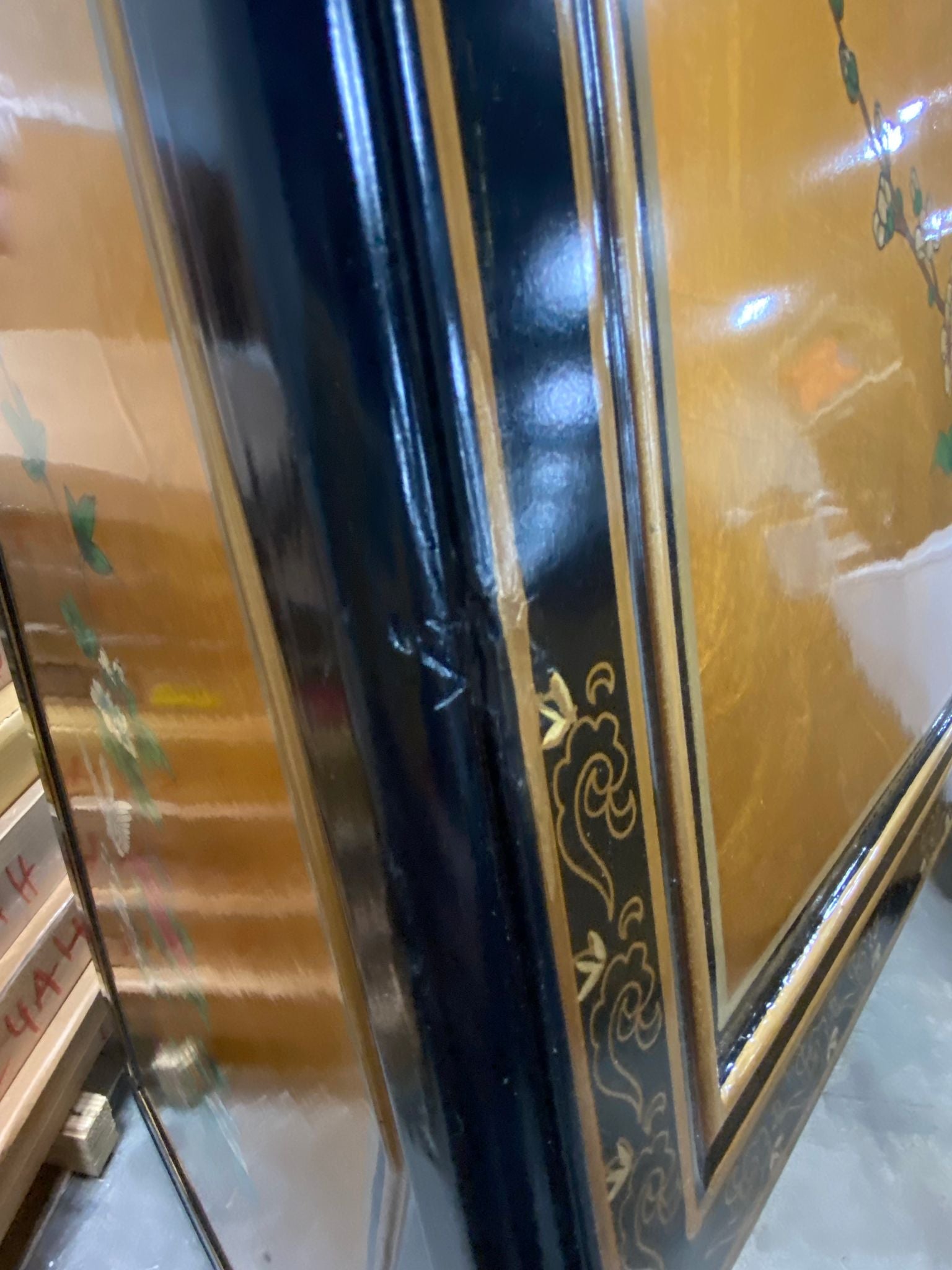 Out of the box, Item has slight dings on edges throughout due to shipment. Small chipped areas on inside of desk lid/near hinge. Item in otherwise good condition.