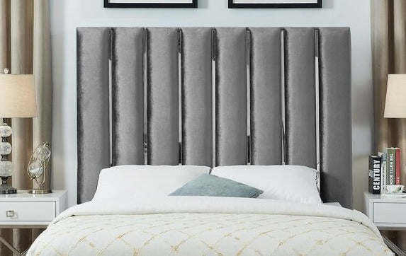 Platform headboard in Gray Velvet with Chrome Details in King. Headboard ONLY.