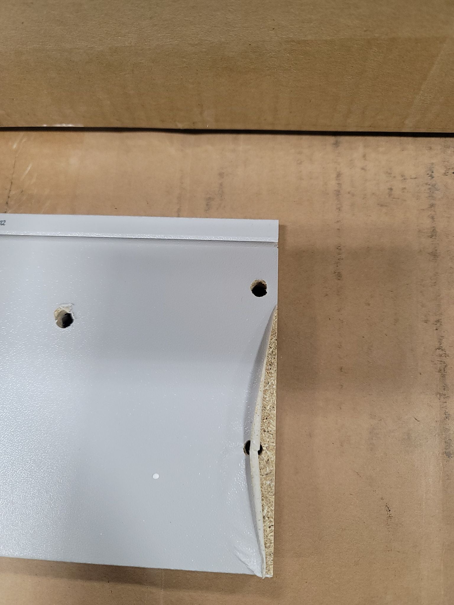 Open box, The color is Oak structure/white high gloss, The paint is peeling back on the inside of the pieces of the nightstand.