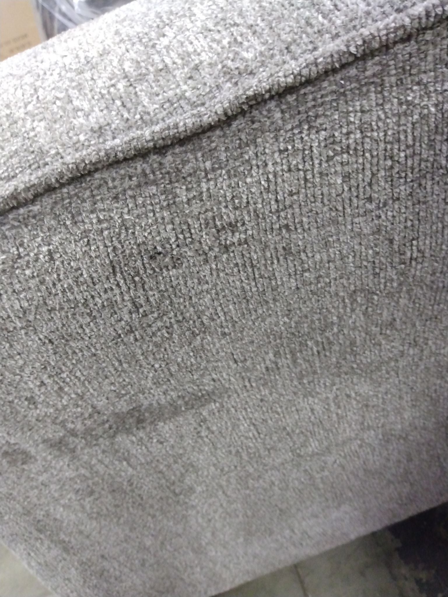 Out of box, The color is Gray polyester blend, Couch had a rip on one arm. Has since been repaired. (Set of 2)