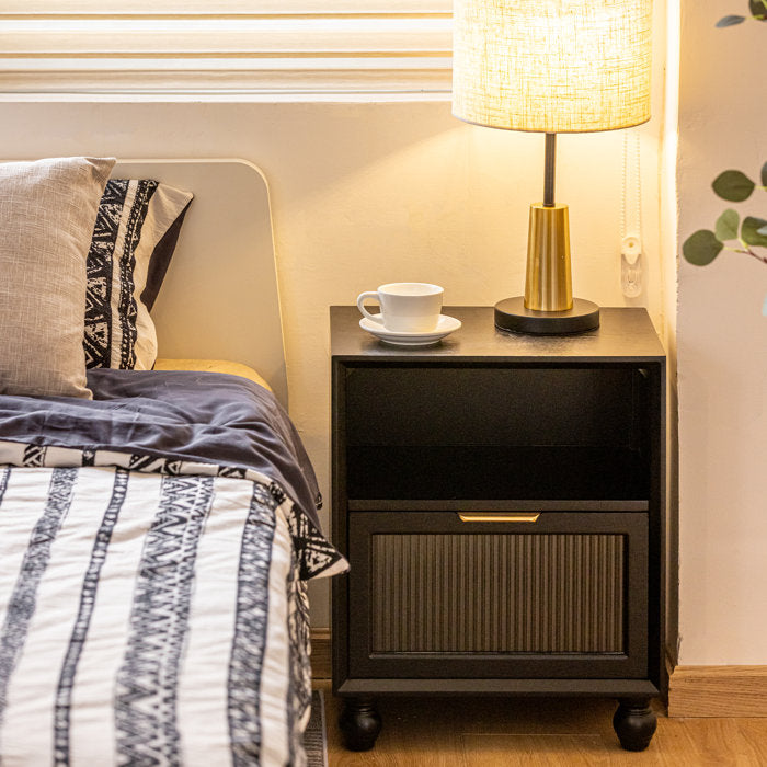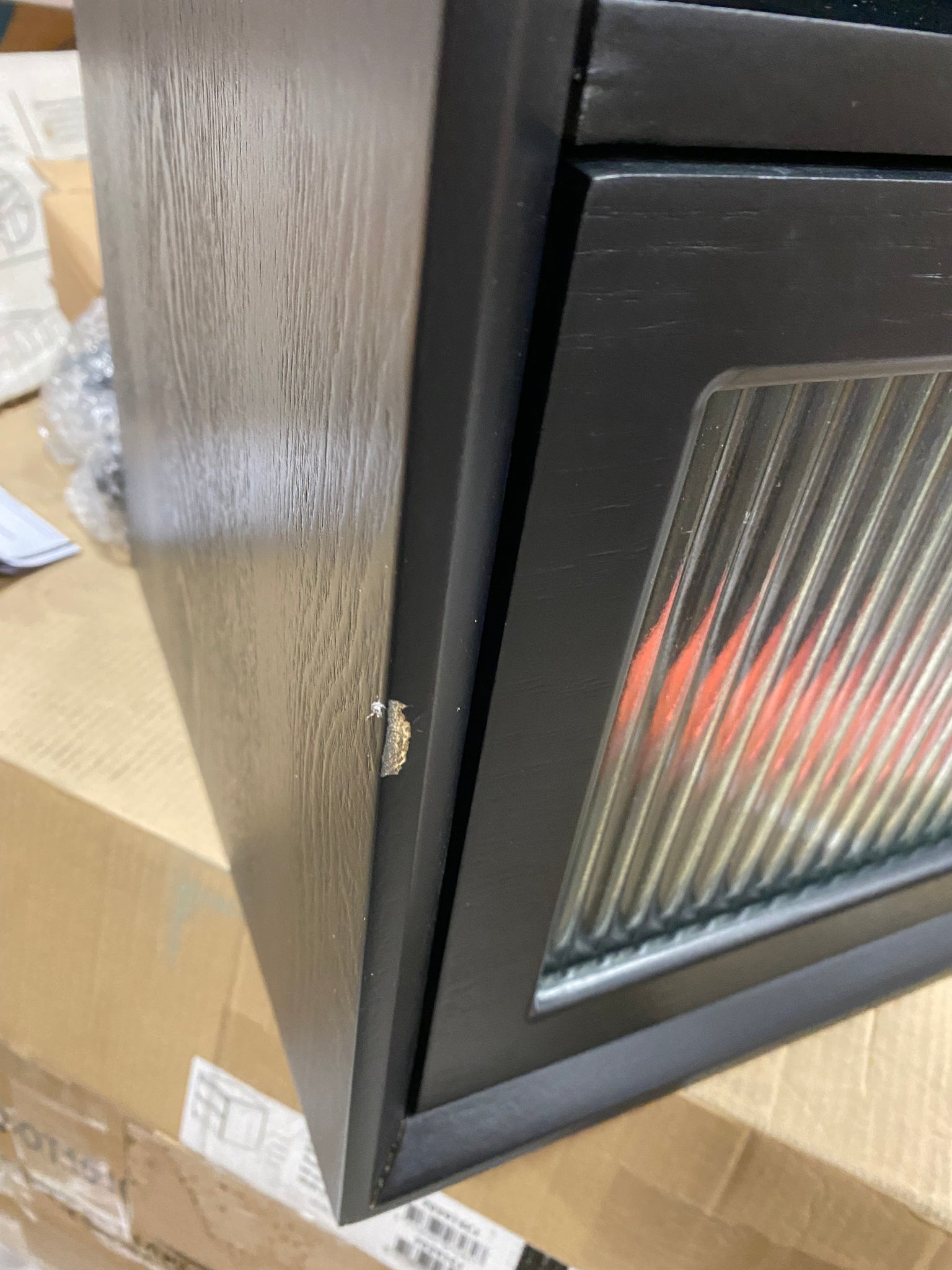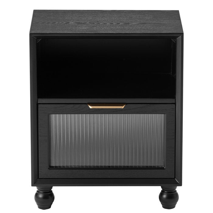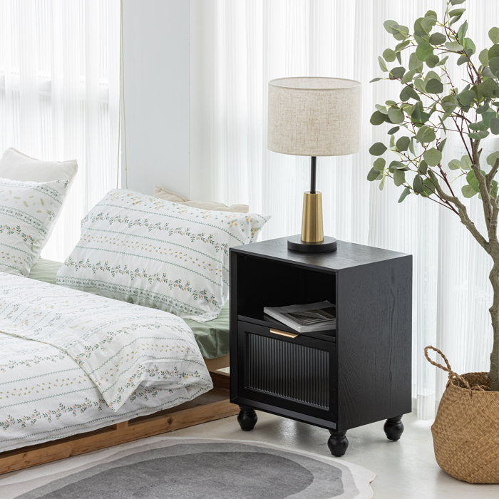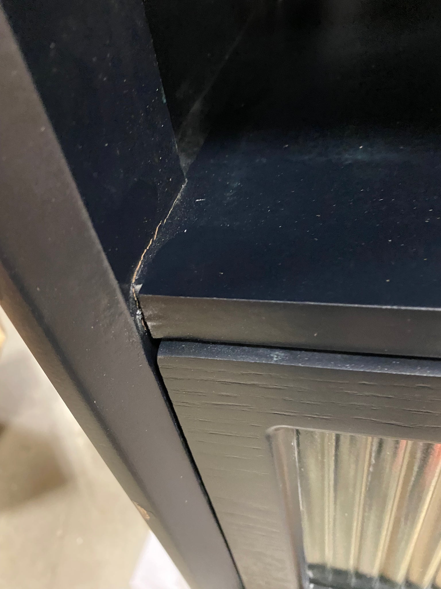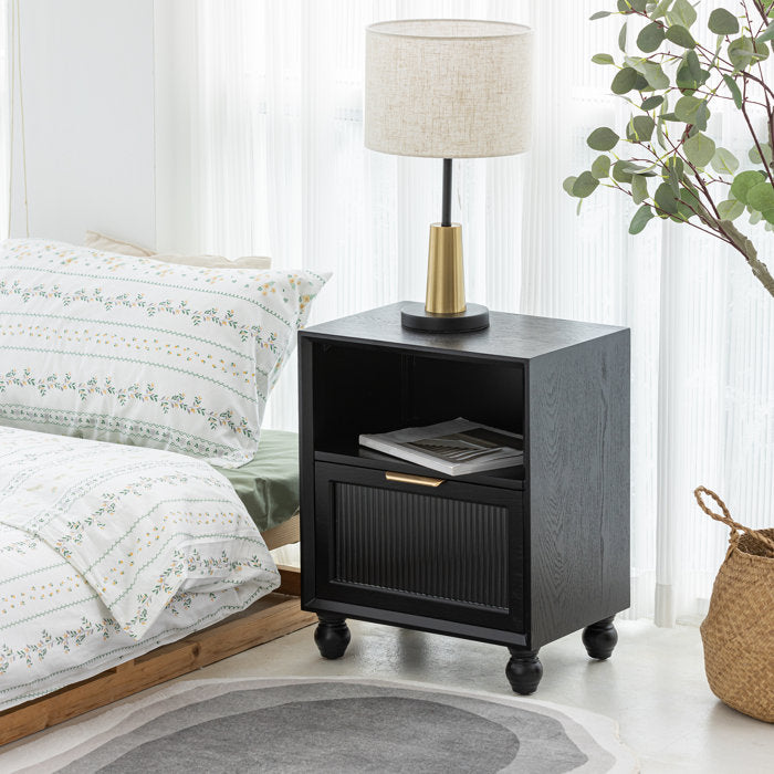 AS IS Condition: Damage on top corner of drawer. Slight dings on side/bottom edge/top corner on front of nightstand. Bottom corner edge slightly disjointed. See photos.